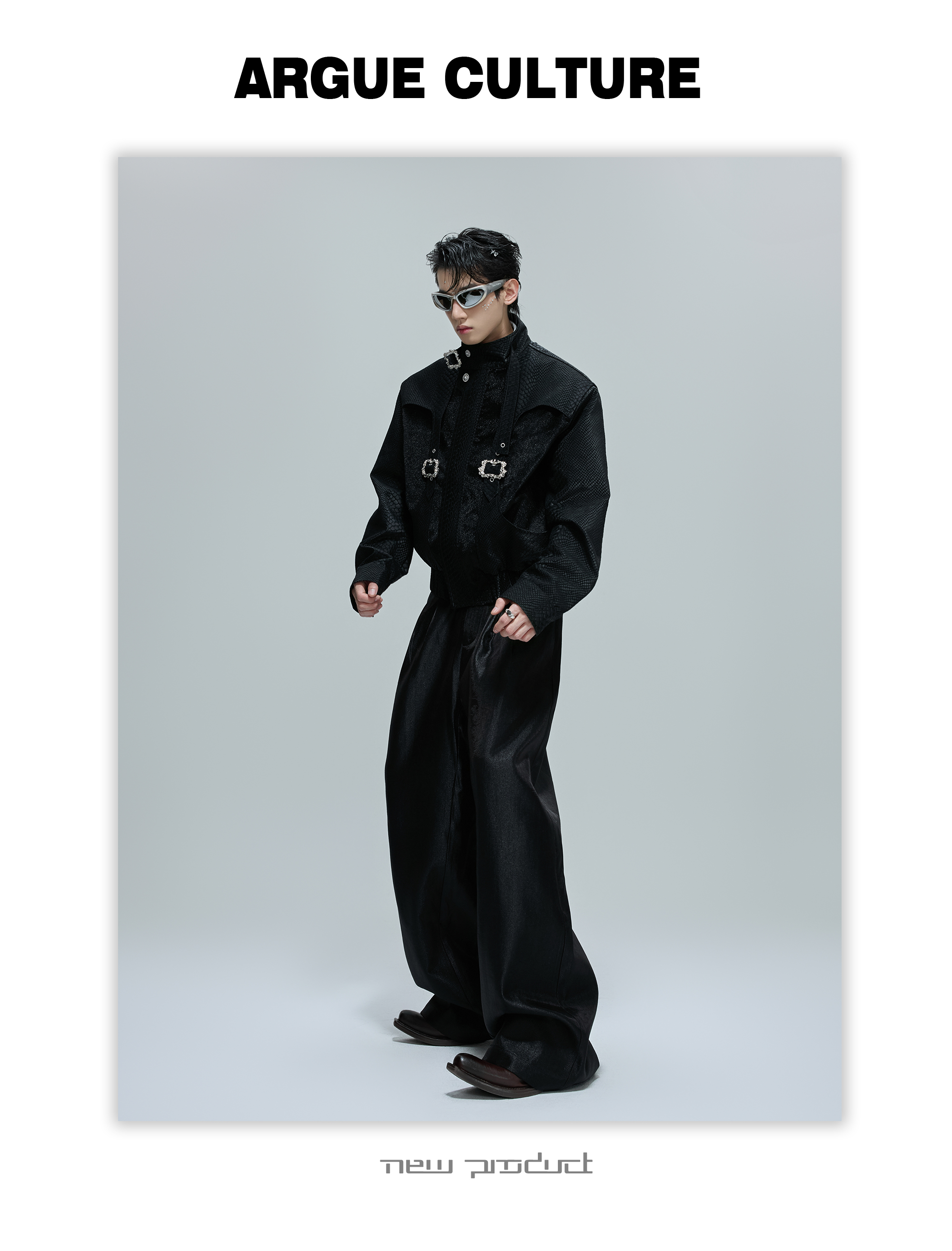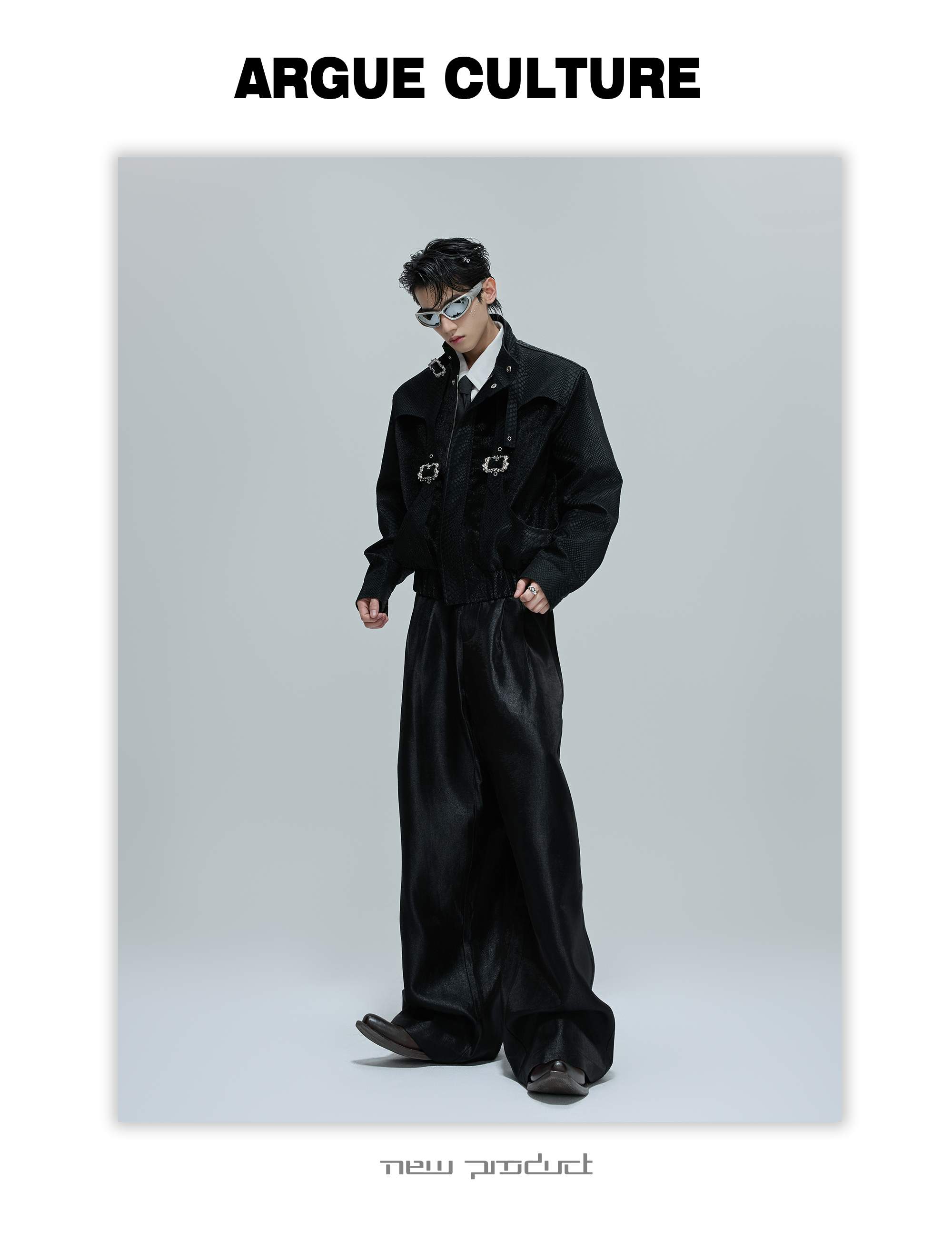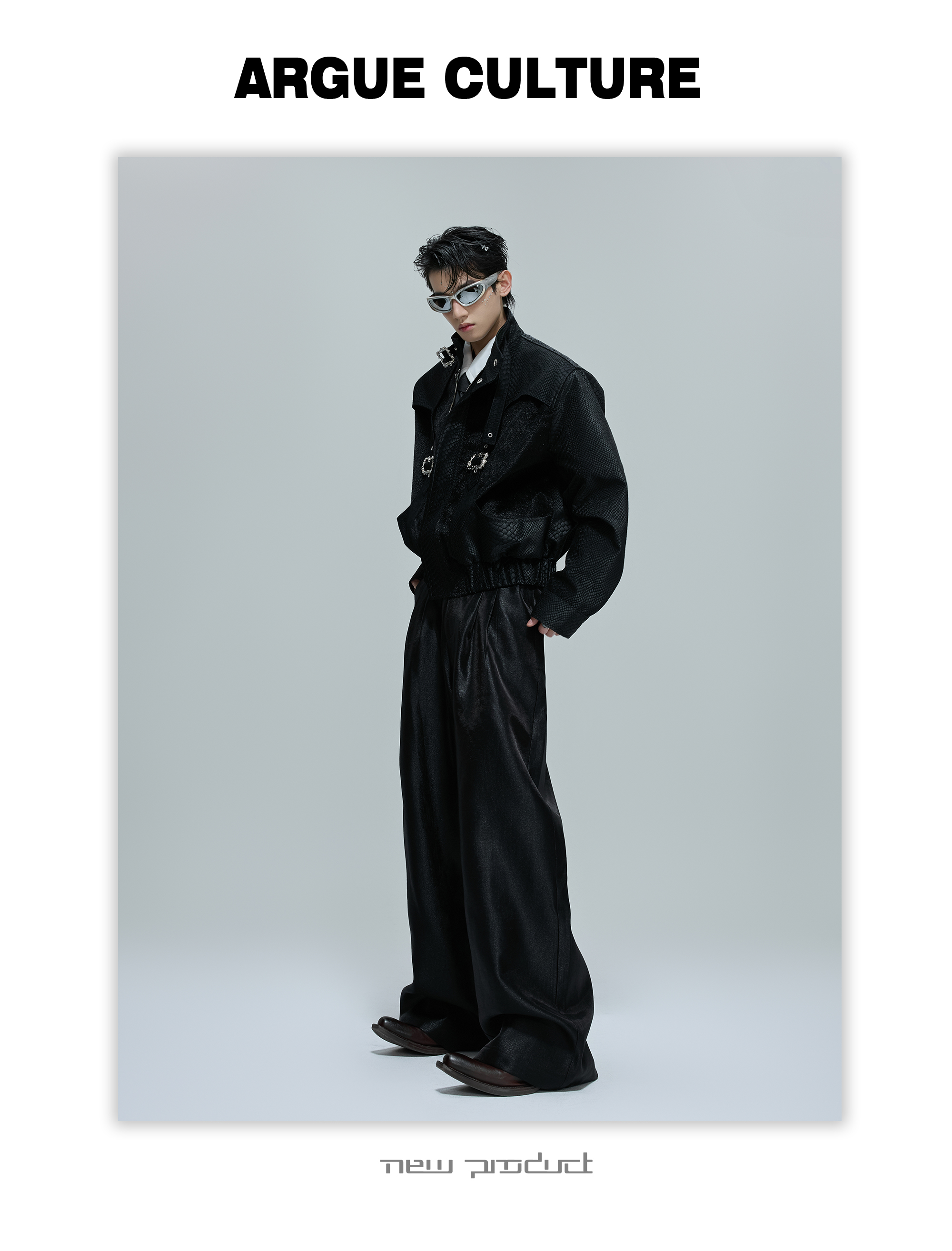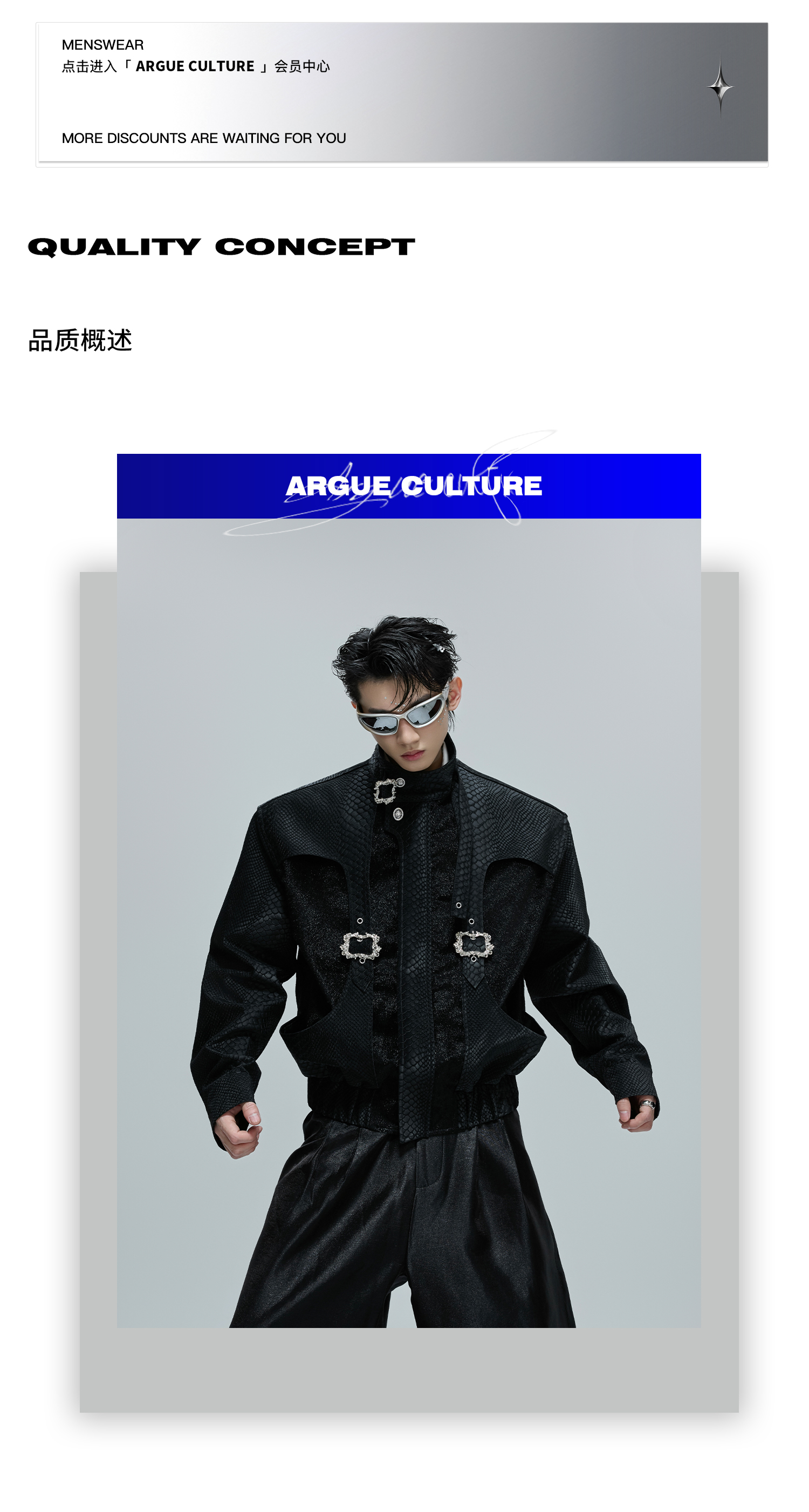 Argue Culture Snake Scale Short Jacket with Stand Collar, Horsehair Splicing, and Metal Buckle Design Leather Coat