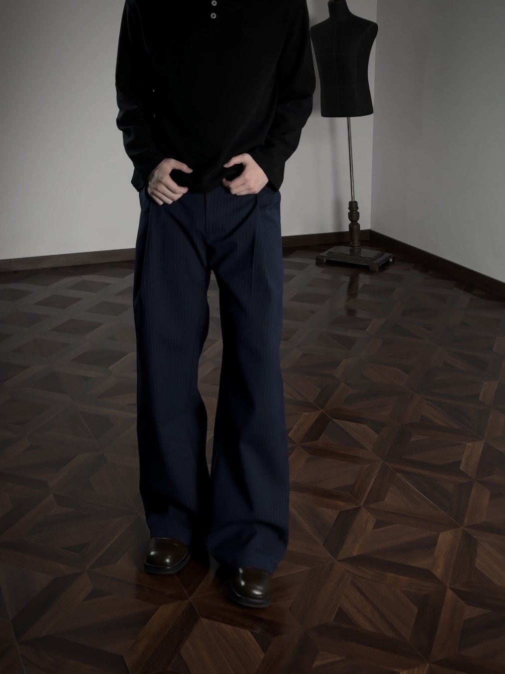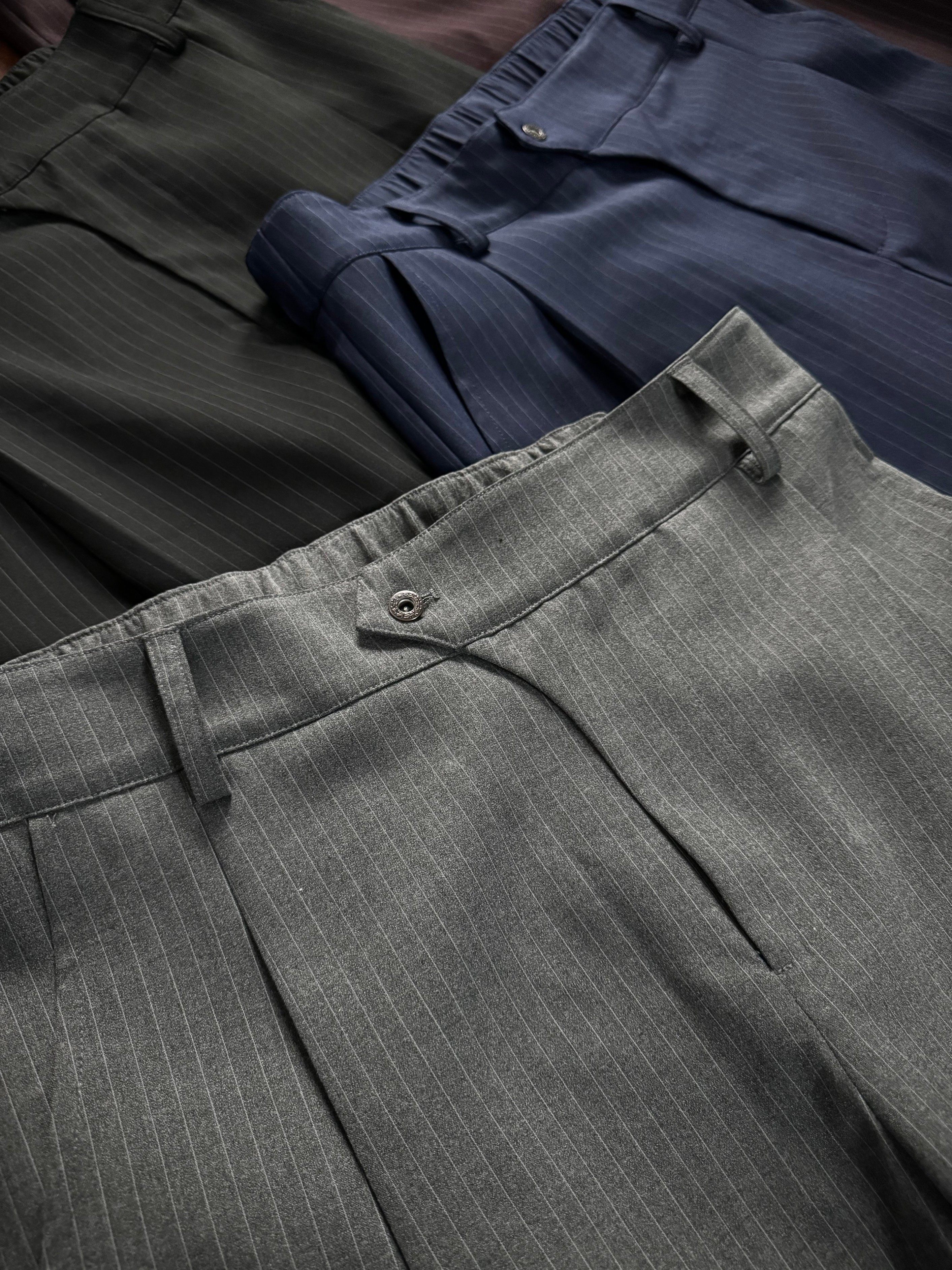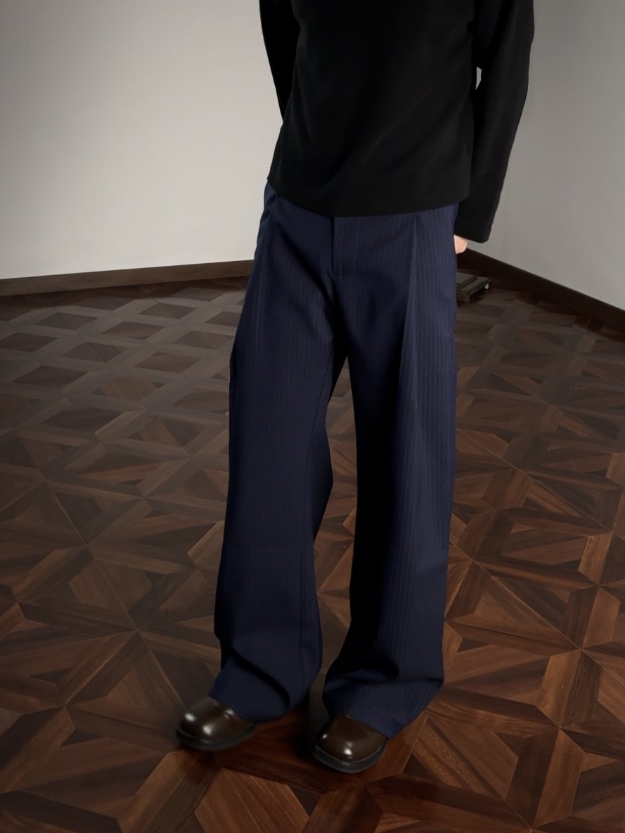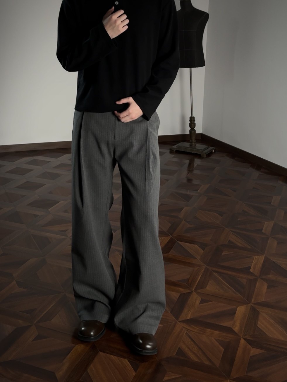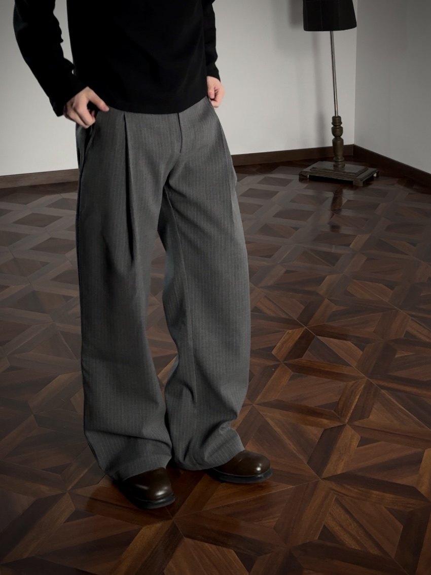 Oclin Diagonal Placket A-Line Straight Pleated Trousers with Striped Texture, Full Hemming, High-Rise Commuter Suit