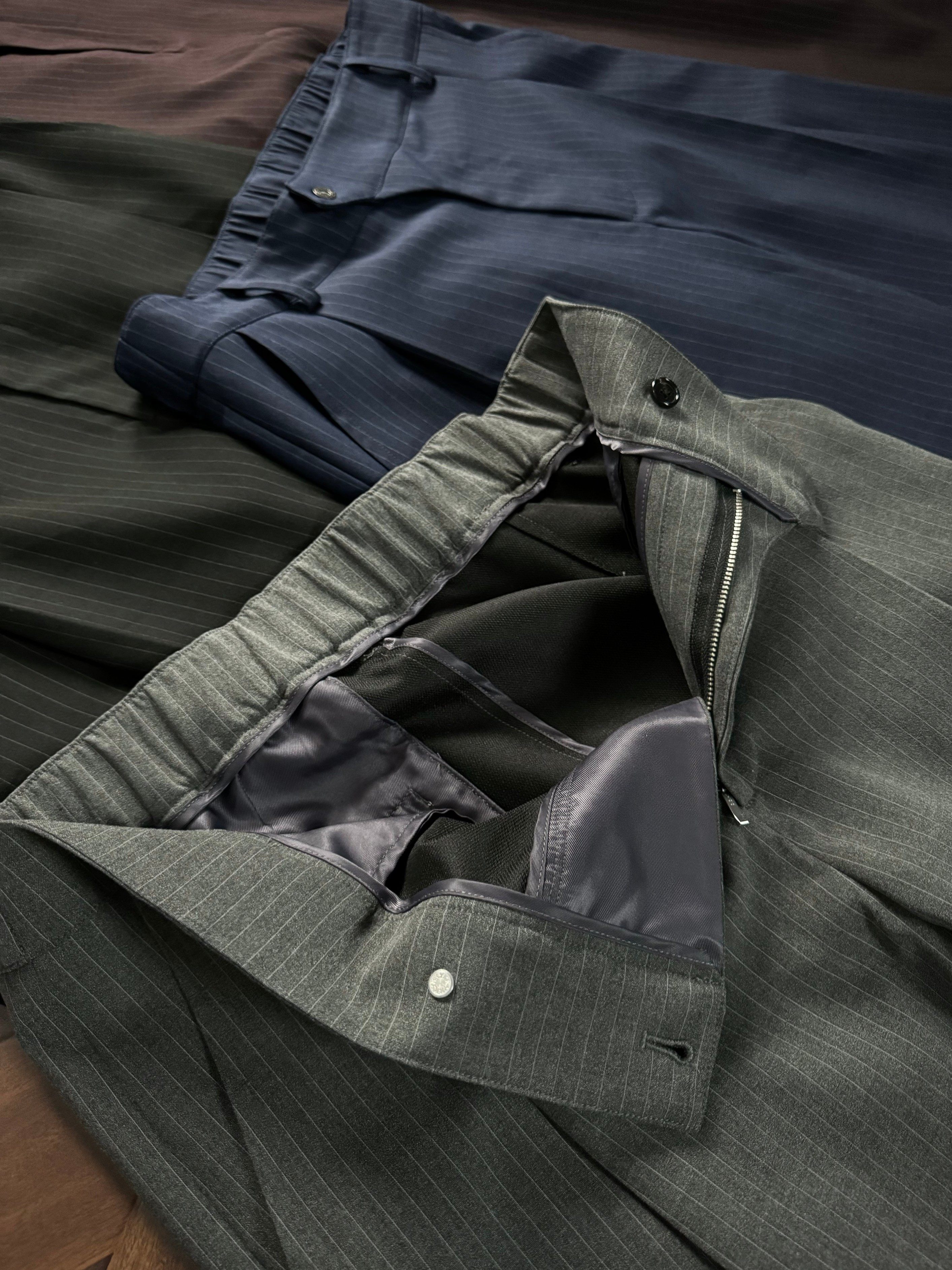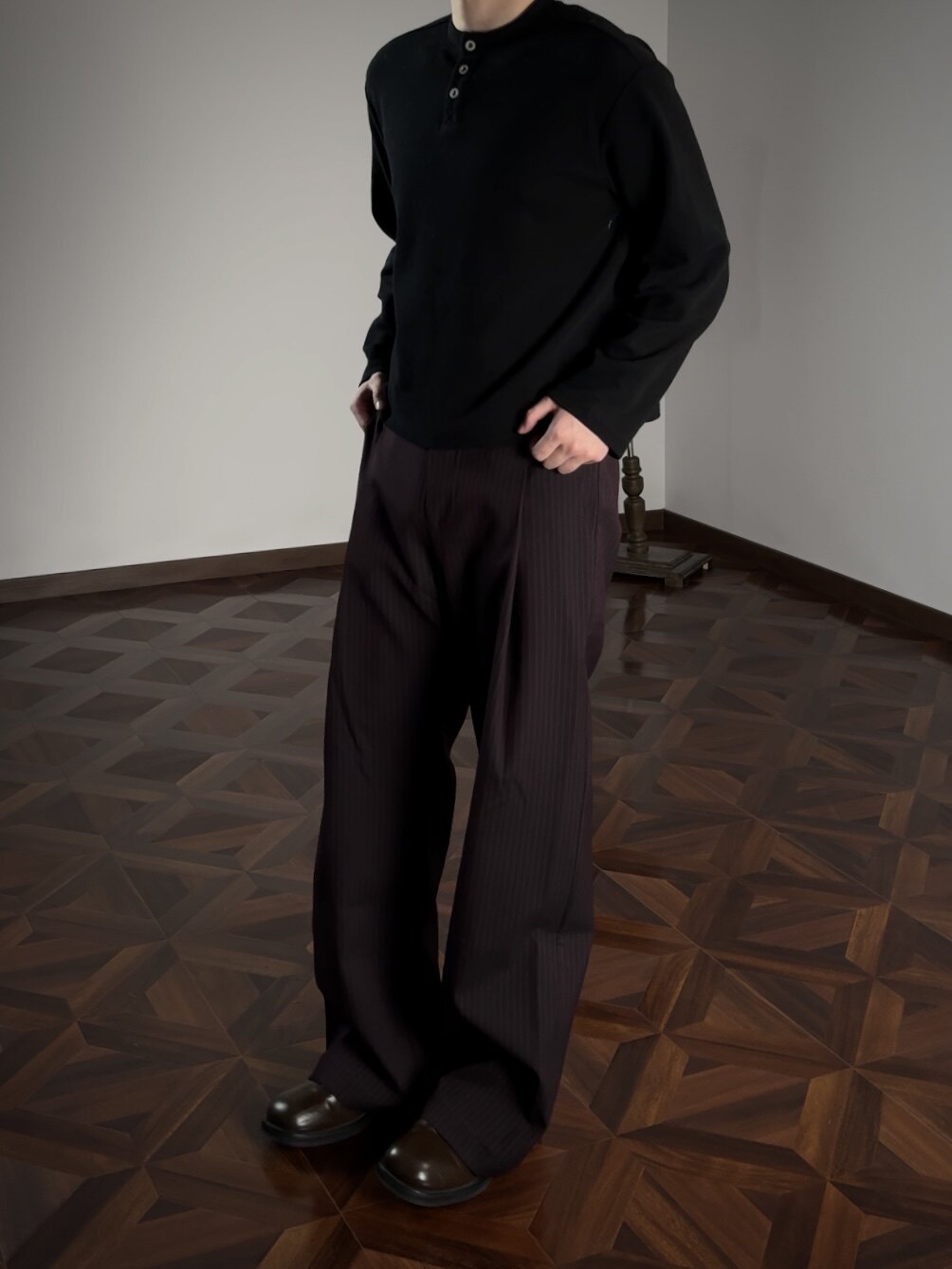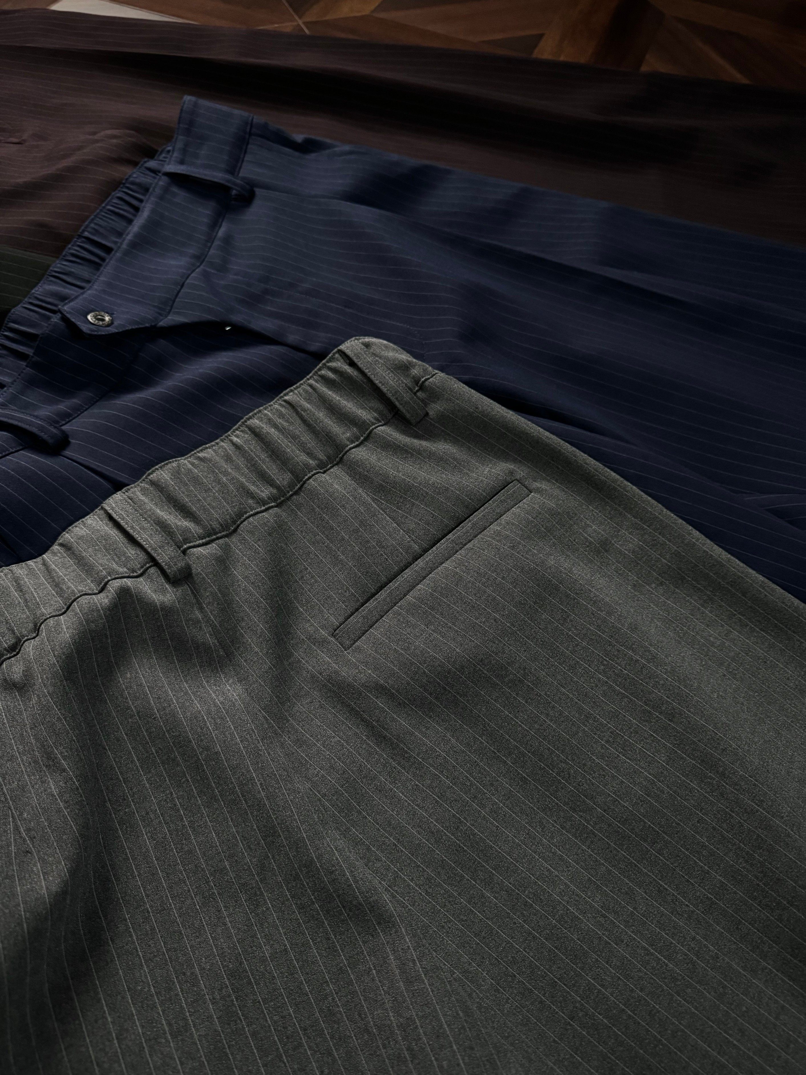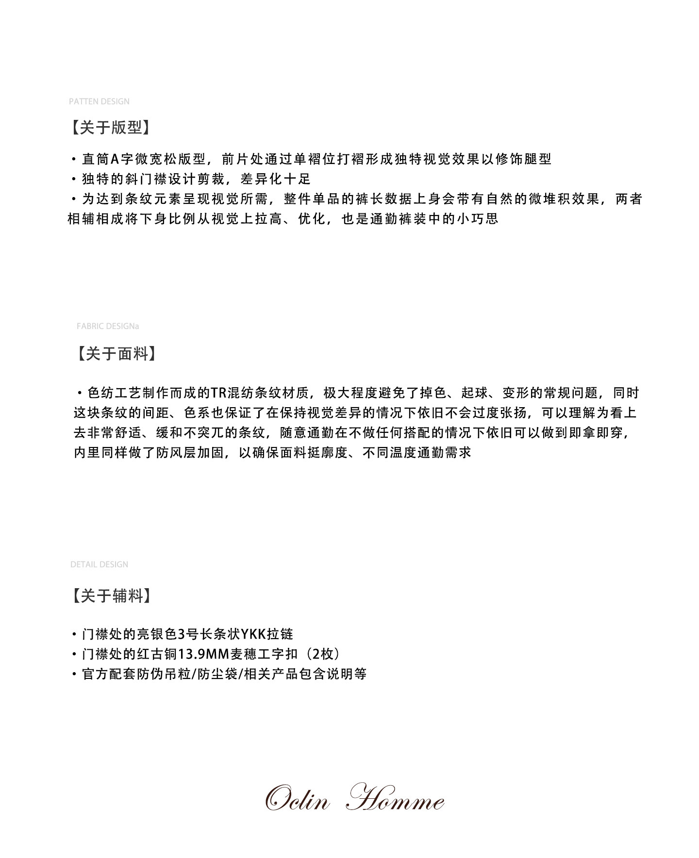 Oclin Diagonal Placket A-Line Straight Pleated Trousers with Striped Texture, Full Hemming, High-Rise Commuter Suit