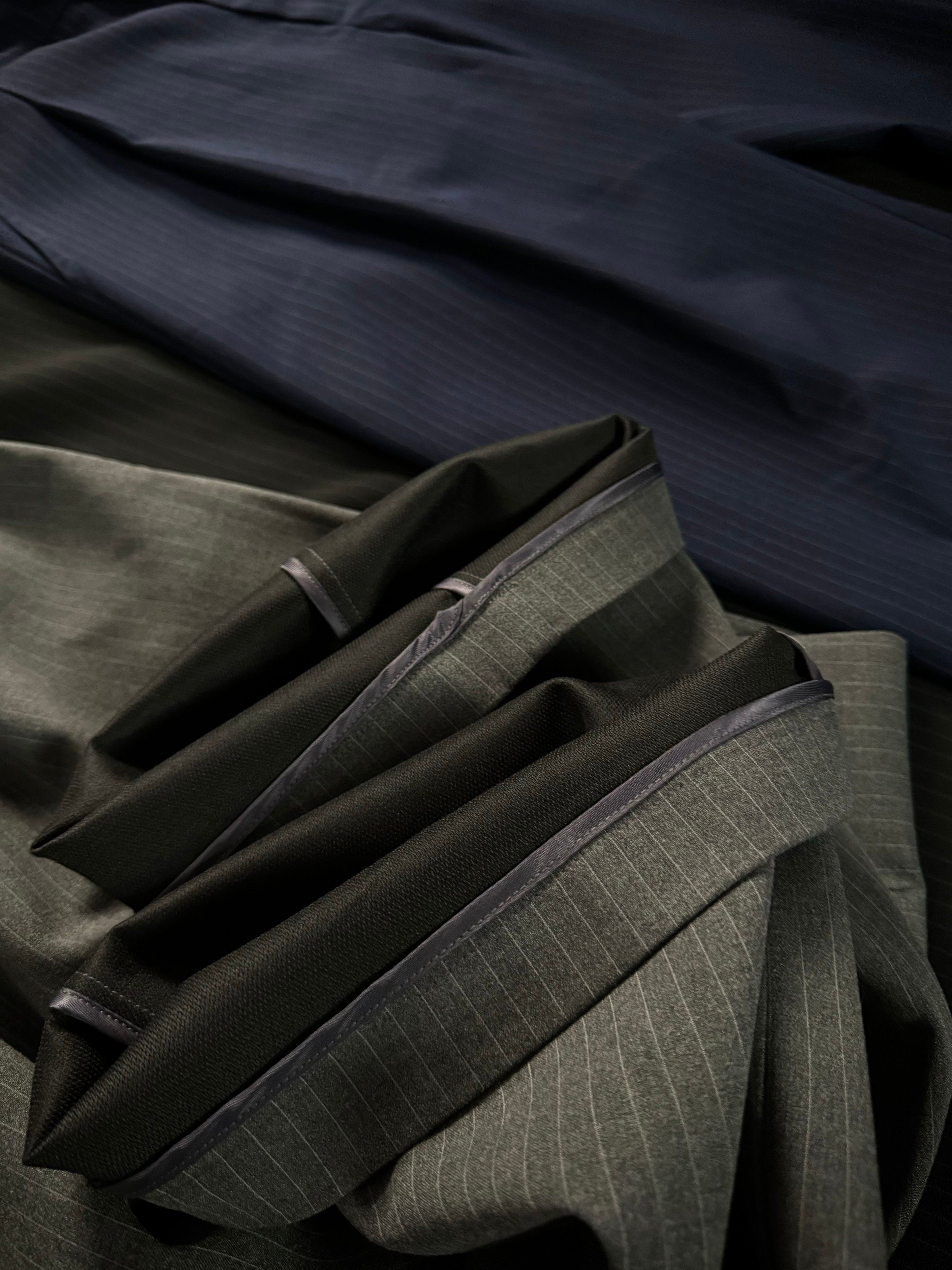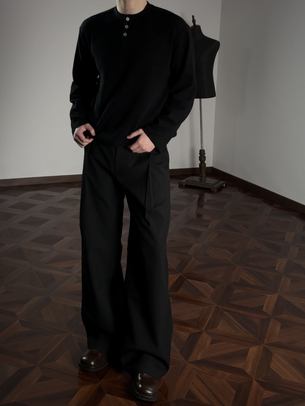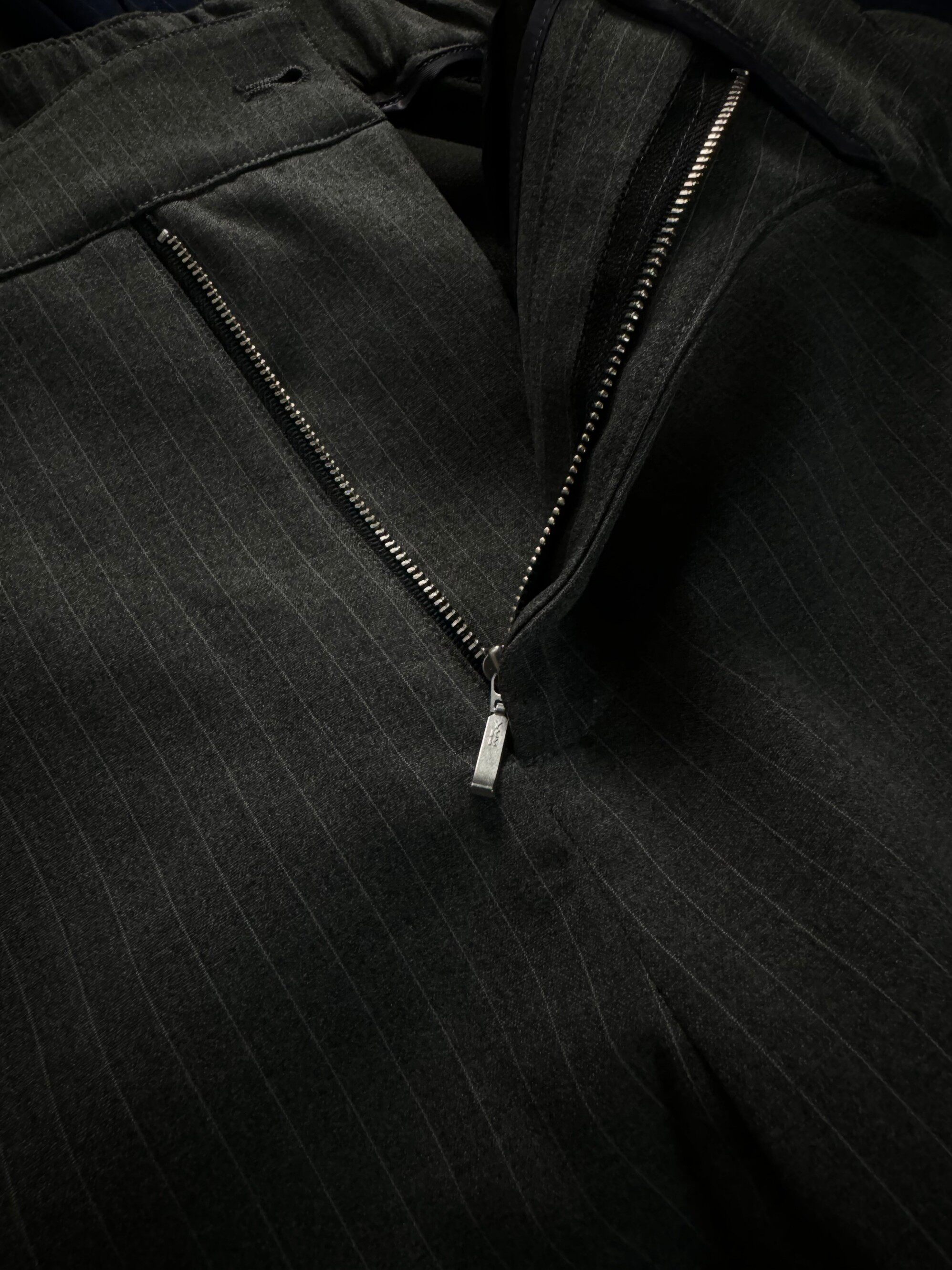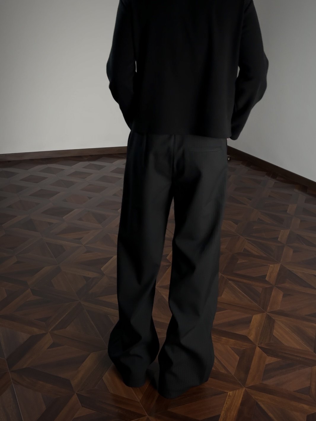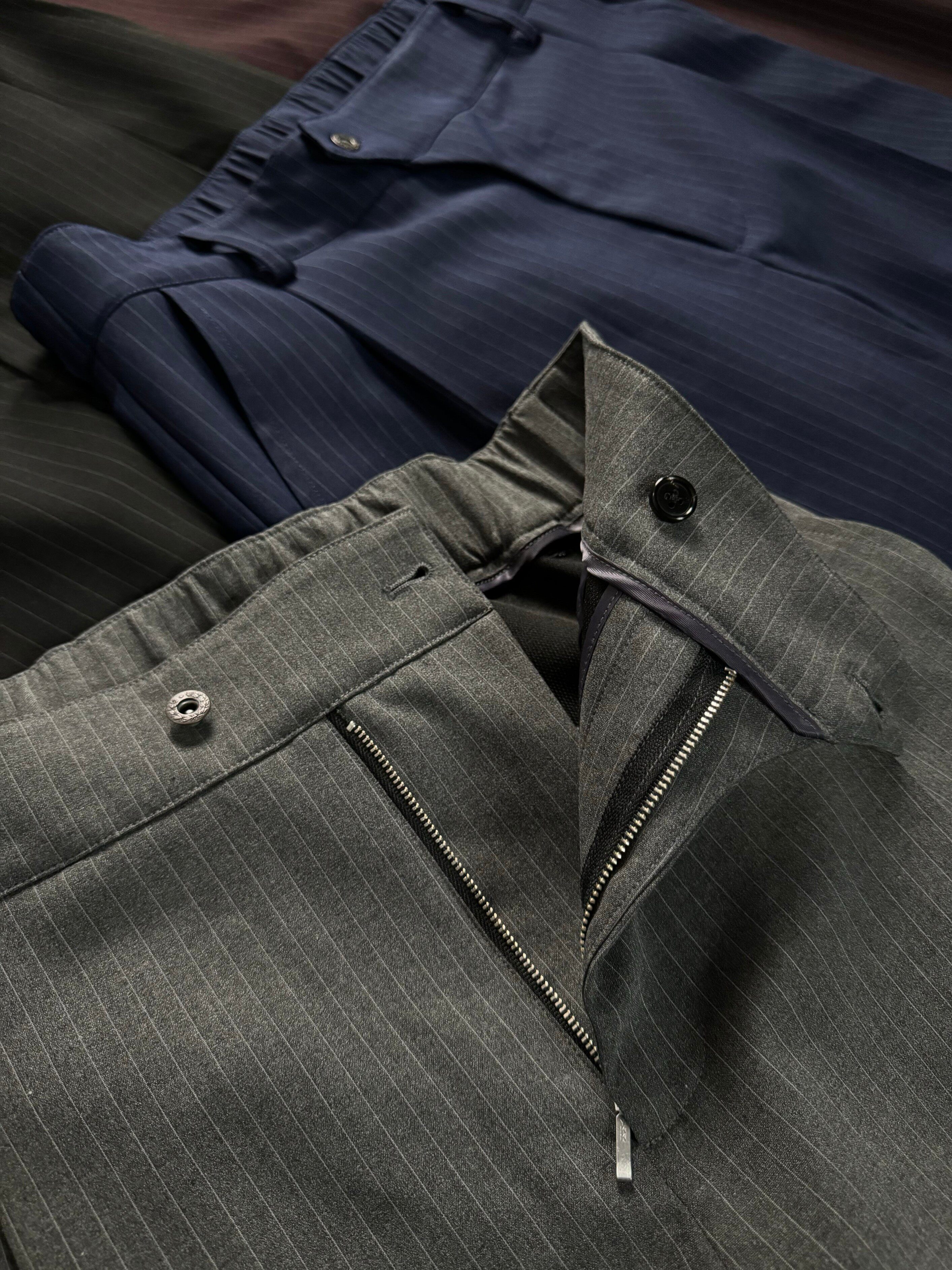 Oclin Diagonal Placket A-Line Straight Pleated Trousers with Striped Texture, Full Hemming, High-Rise Commuter Suit