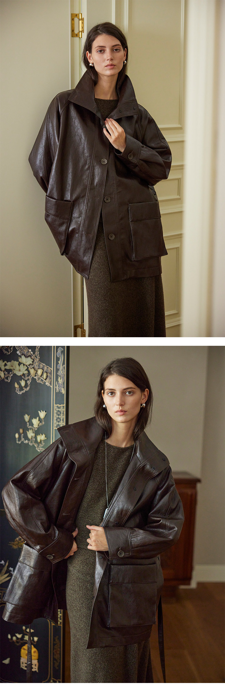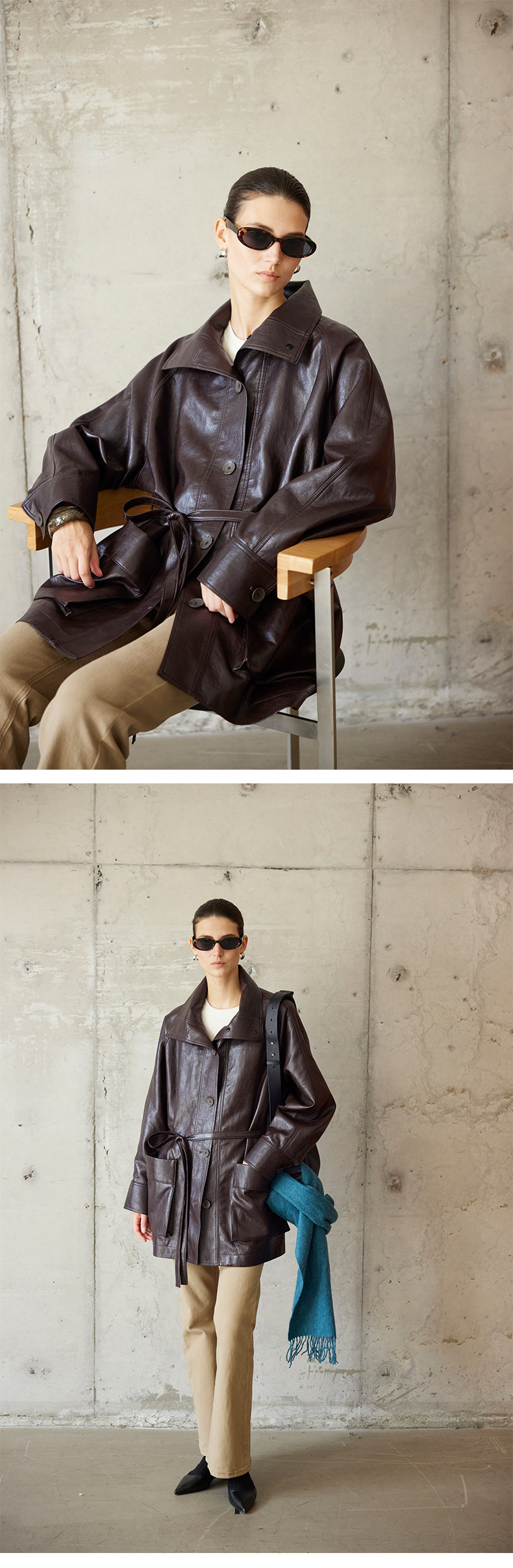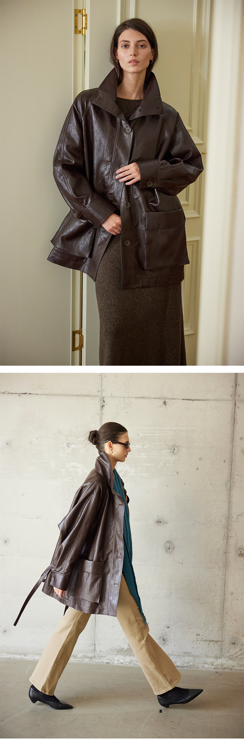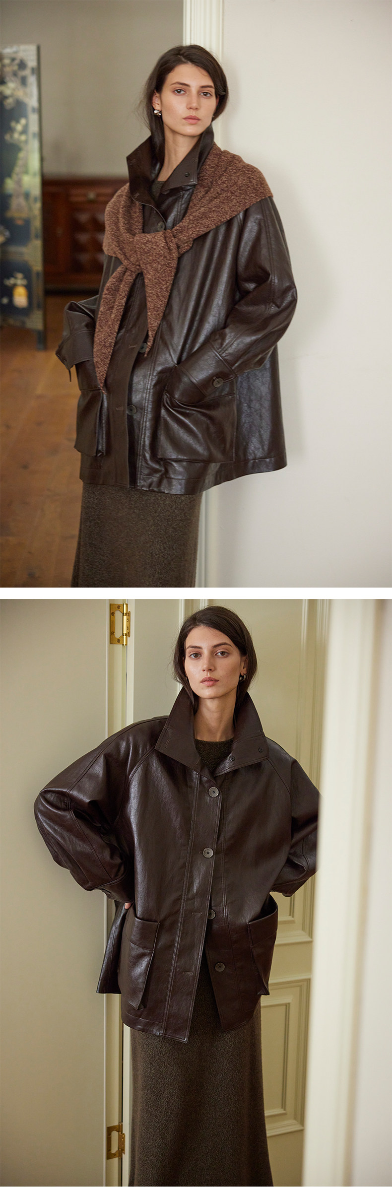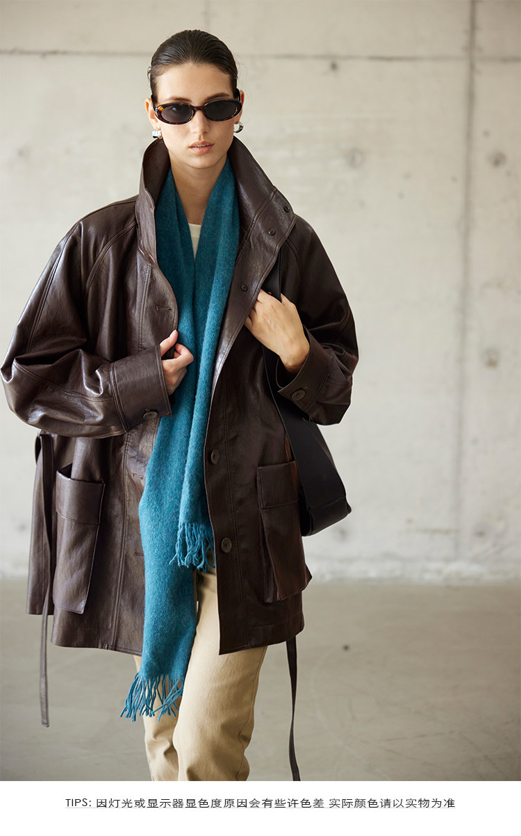 Moofeel Ultra-Soft Eco-Friendly Pu Jacket, Mid-Length, 2025 Autumn, Lace-Up Stand Collar, Glossy Melard Leather Jacket