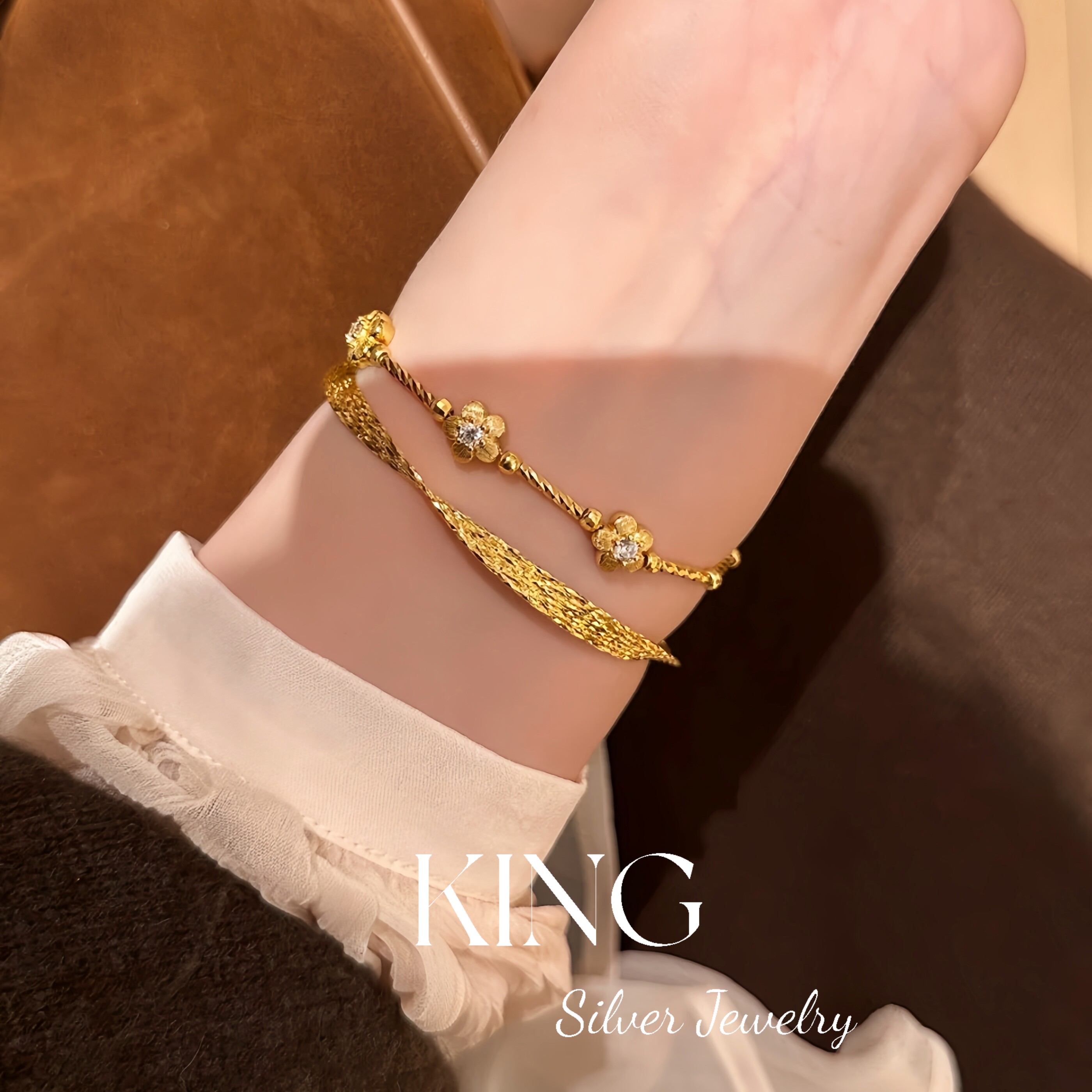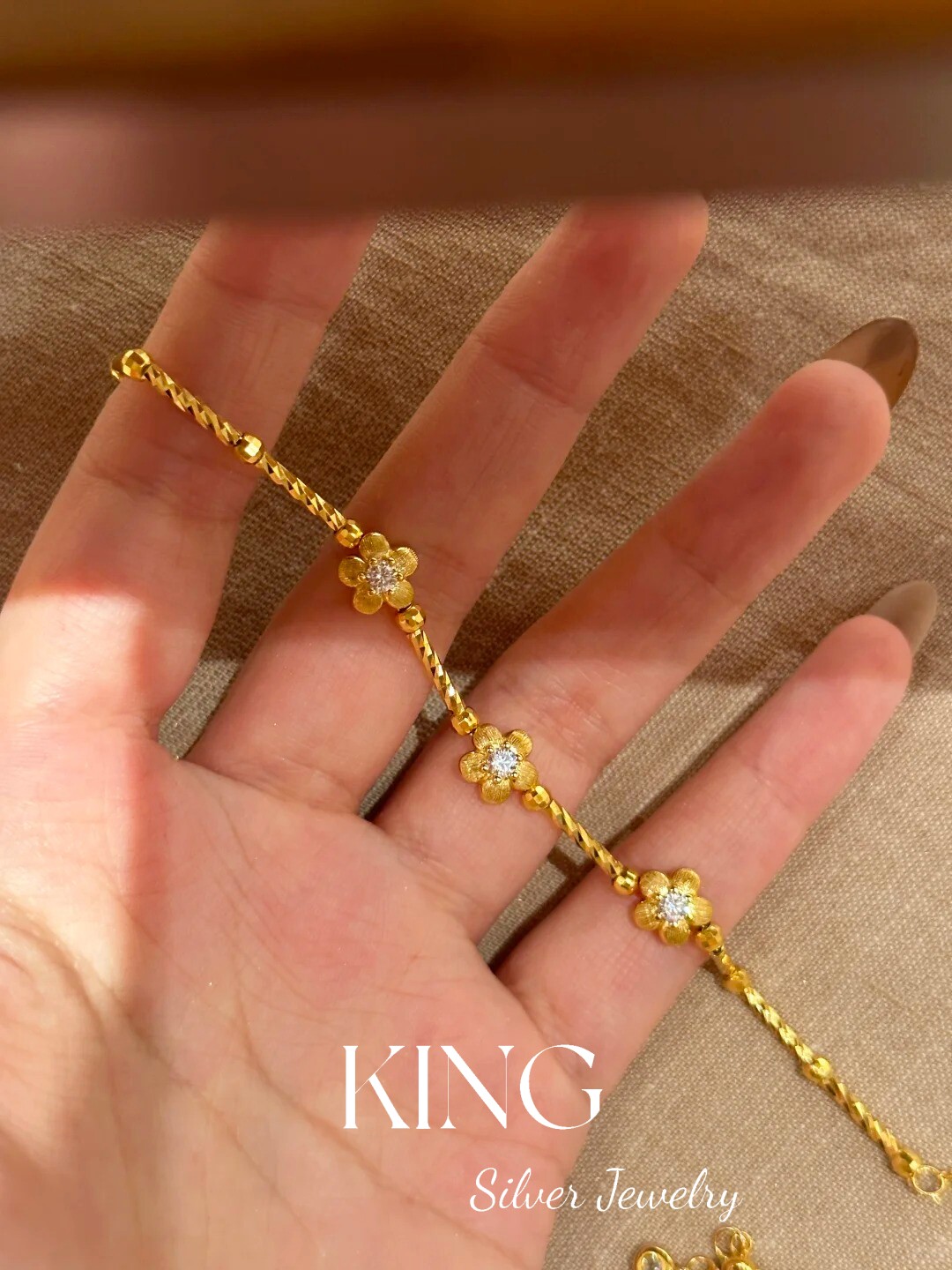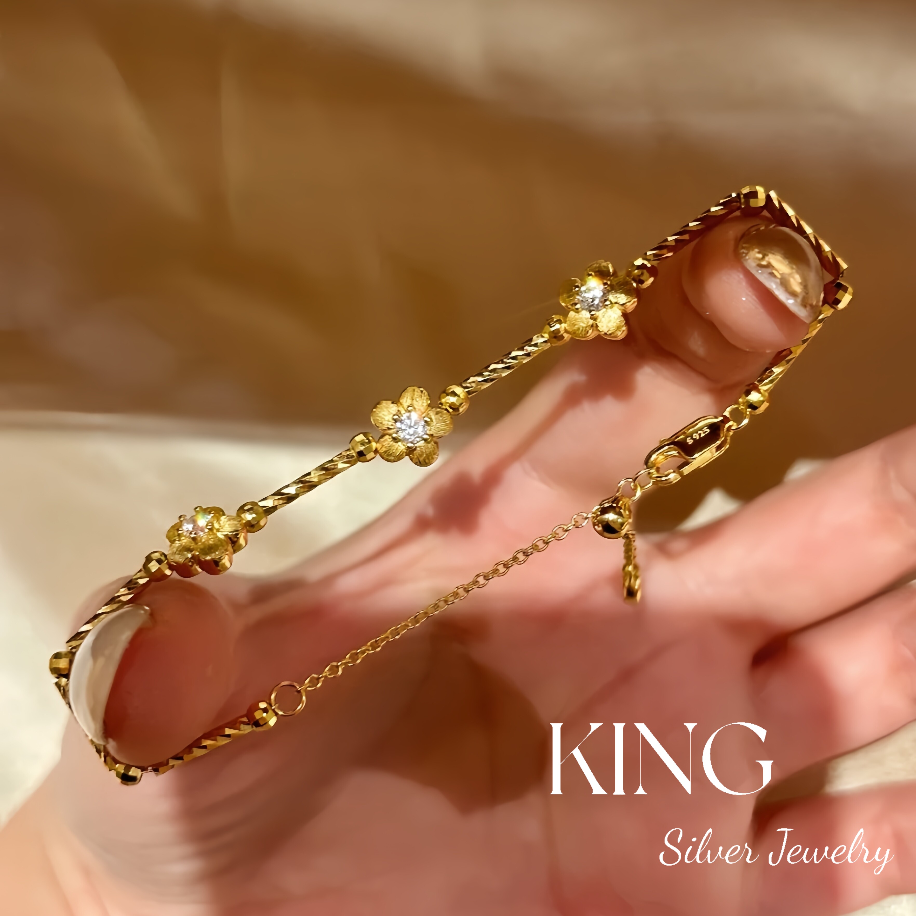 Girls' Generation | King Silver Jewelry S925 Silver Gold-Plated Brushed Small Gold Flower Vintage Style Sterling Silver Bracelet