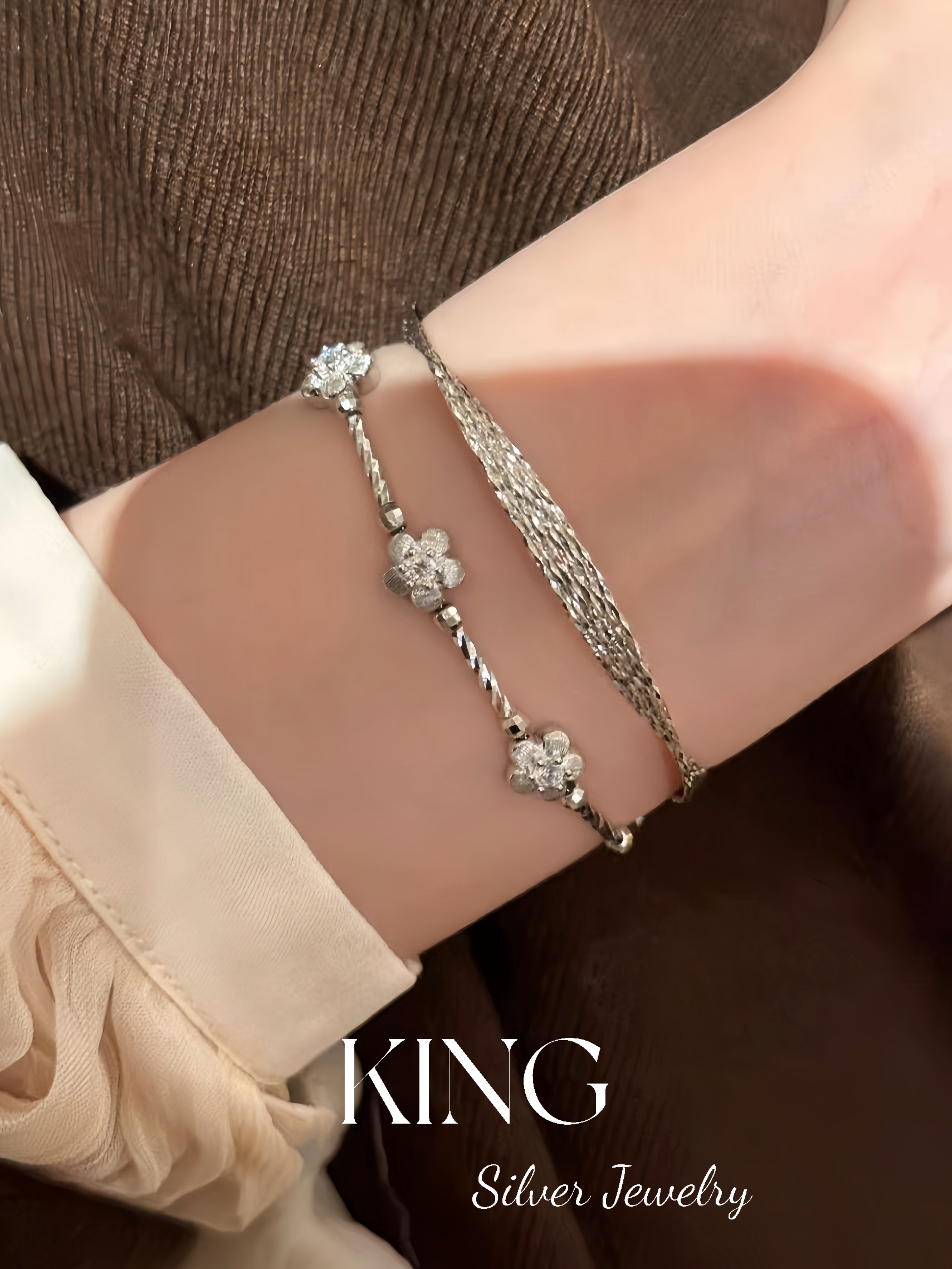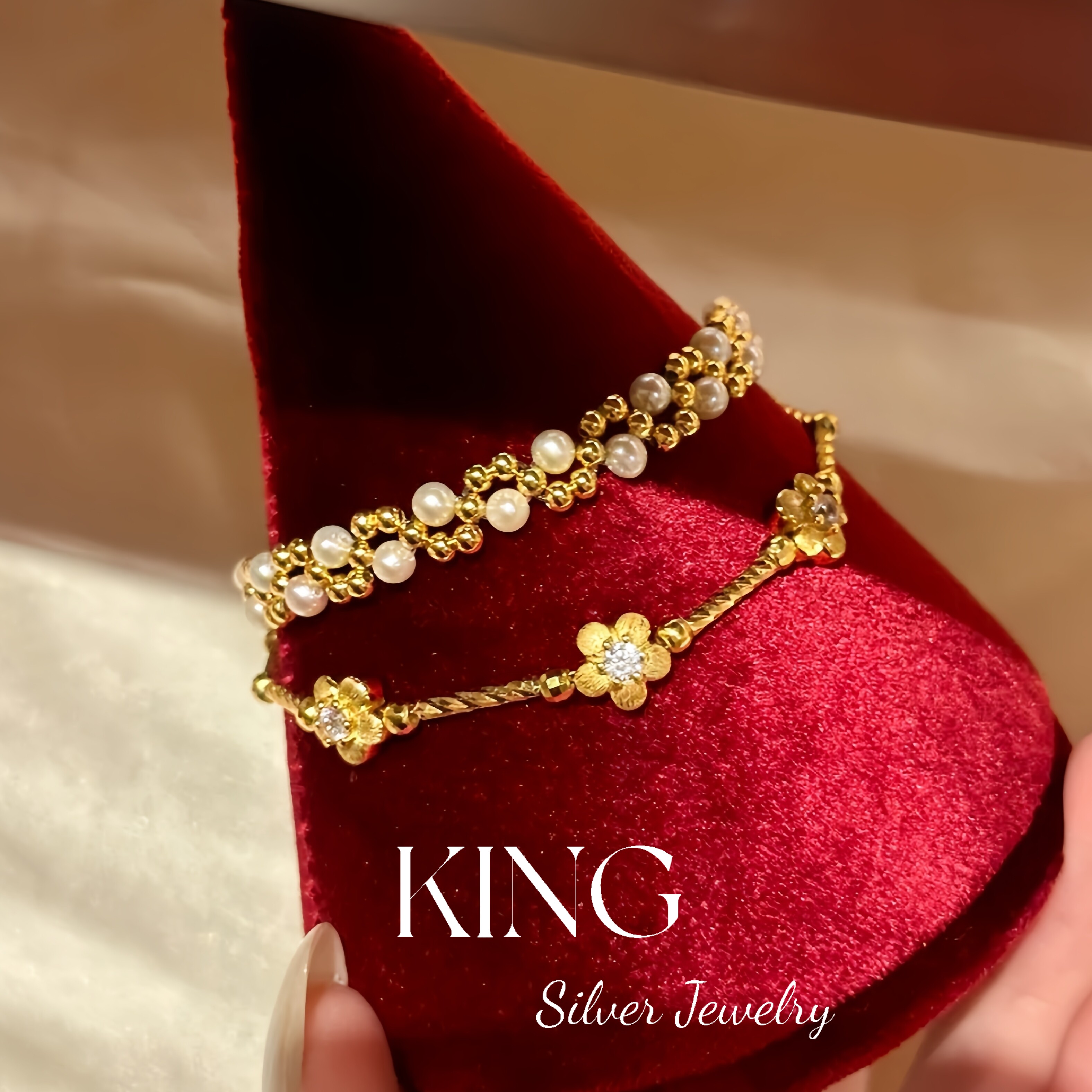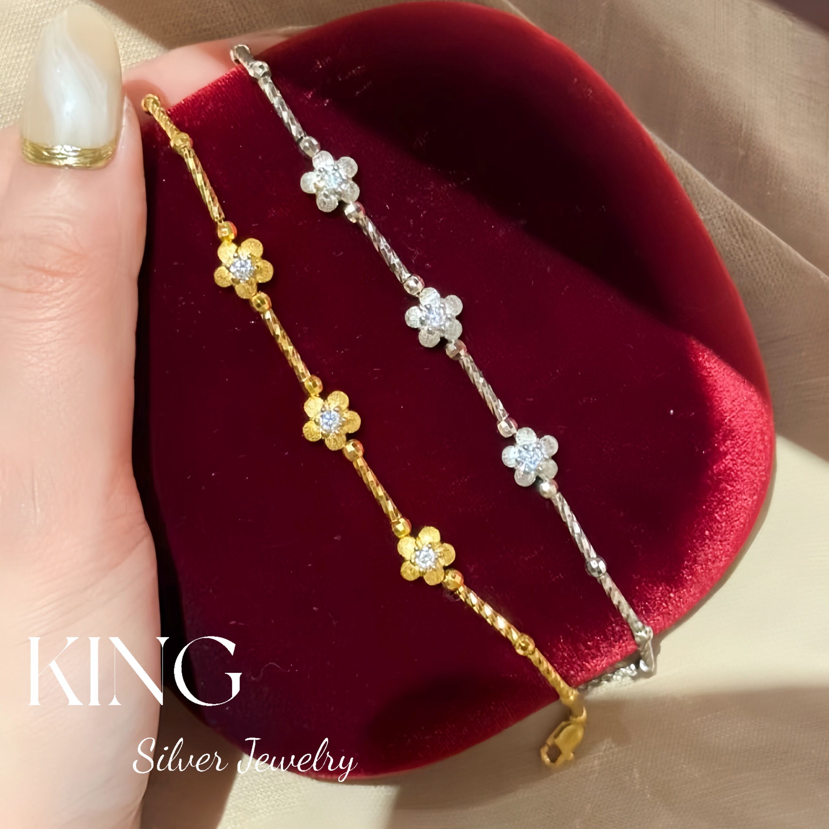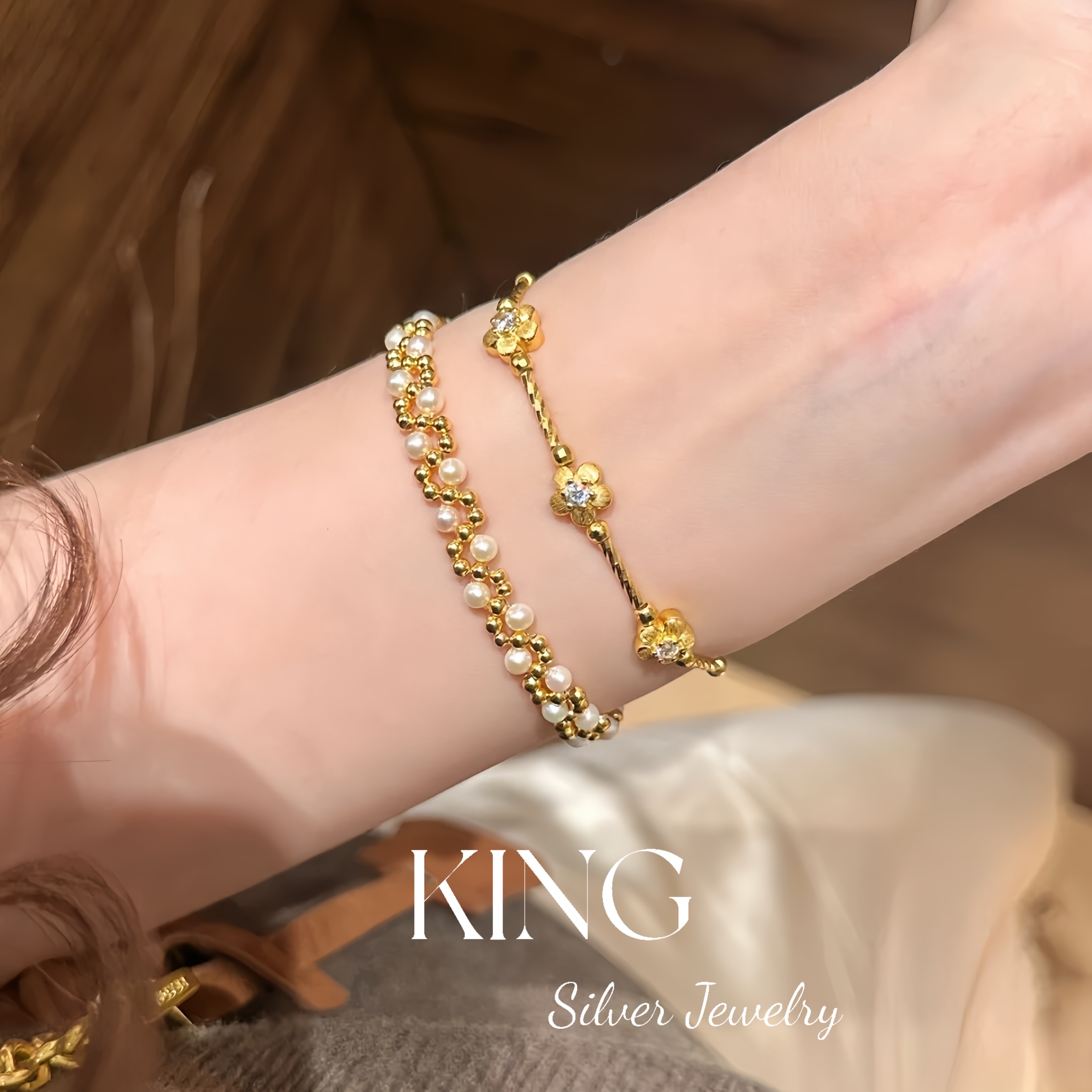Girls' Generation | King Silver Jewelry S925 Silver Gold-Plated Brushed Small Gold Flower Vintage Style Sterling Silver Bracelet