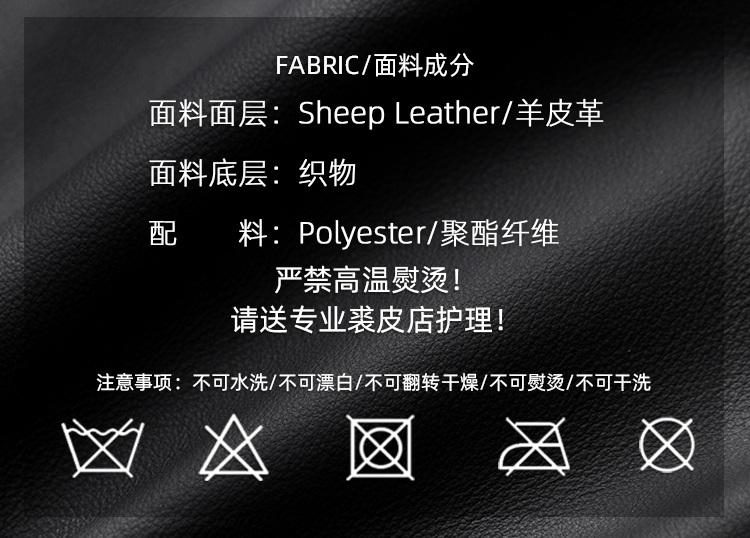 天然皮革,十分娇贵,严禁直接熨烫皮面,熨烫后将无法修复