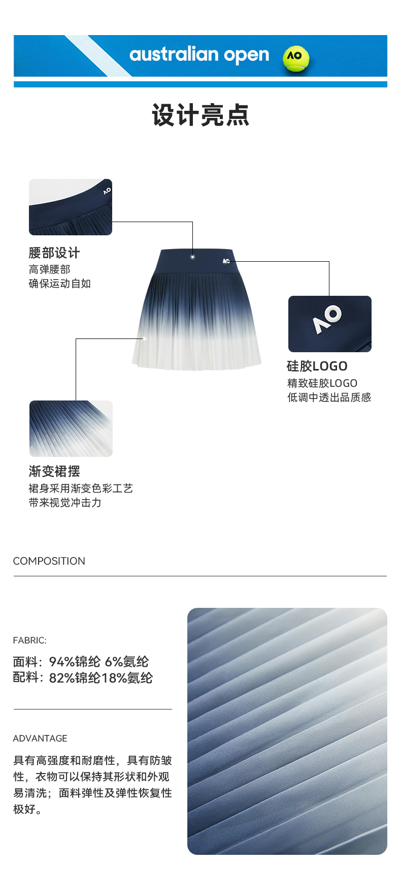 Ao Australian Open Sports Skirt Gradient Tennis Skirt Women's Anti-Exposure Skirt with Built-In Shorts Pleated Skirt