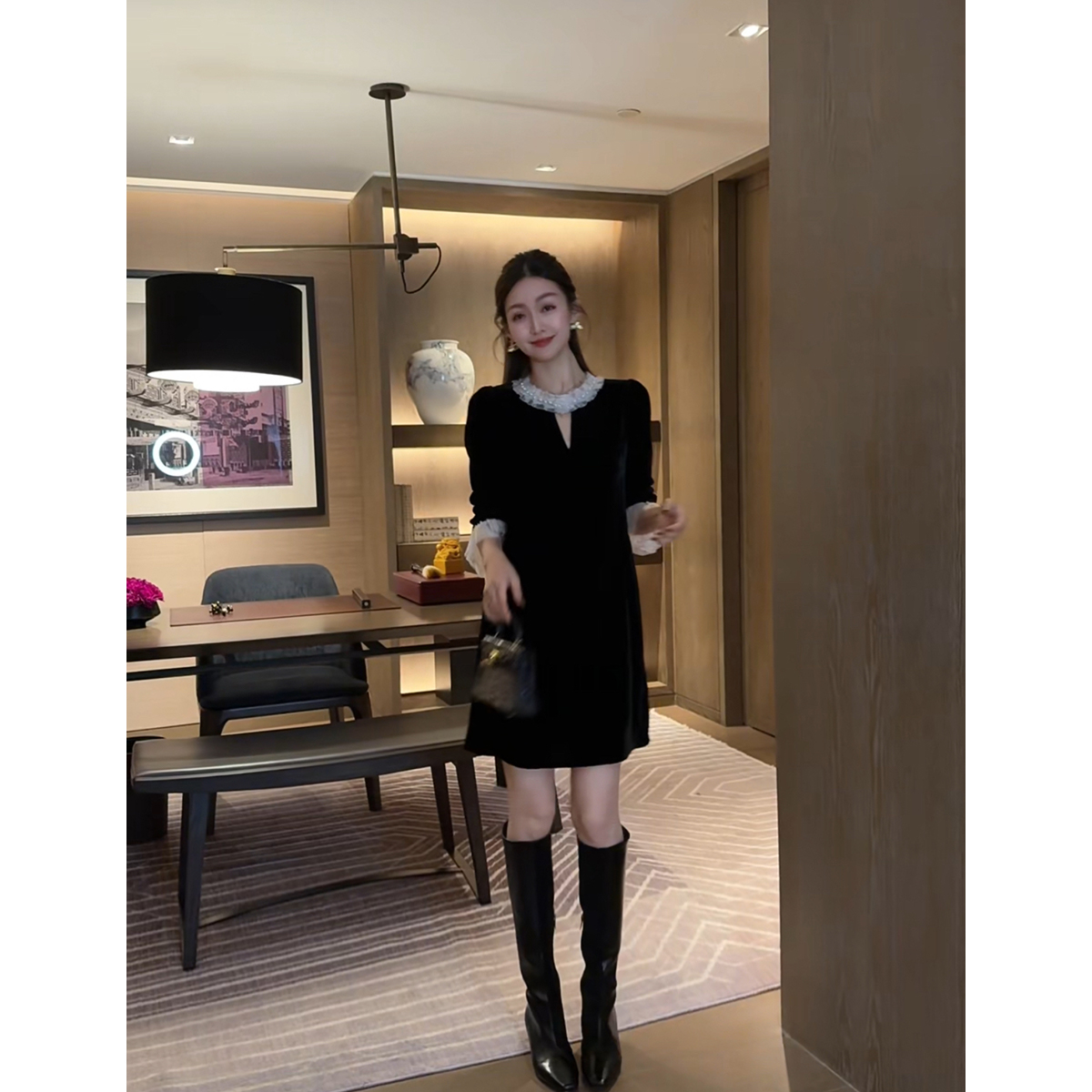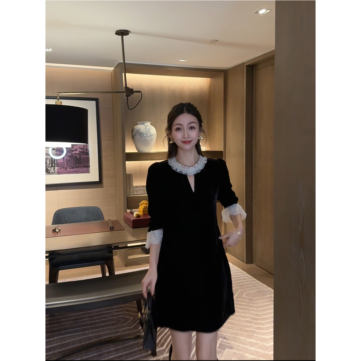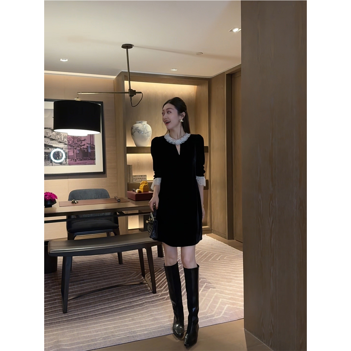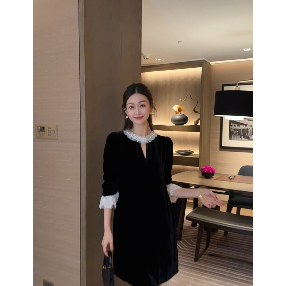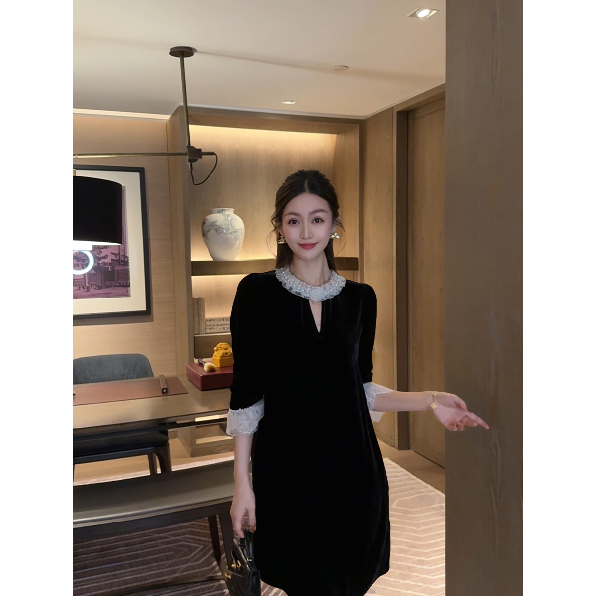 Whh Wang Haha 25 Autumn New Design Ruffled Lace Beaded 100% Mulberry Silk Black Long Sleeve Dress