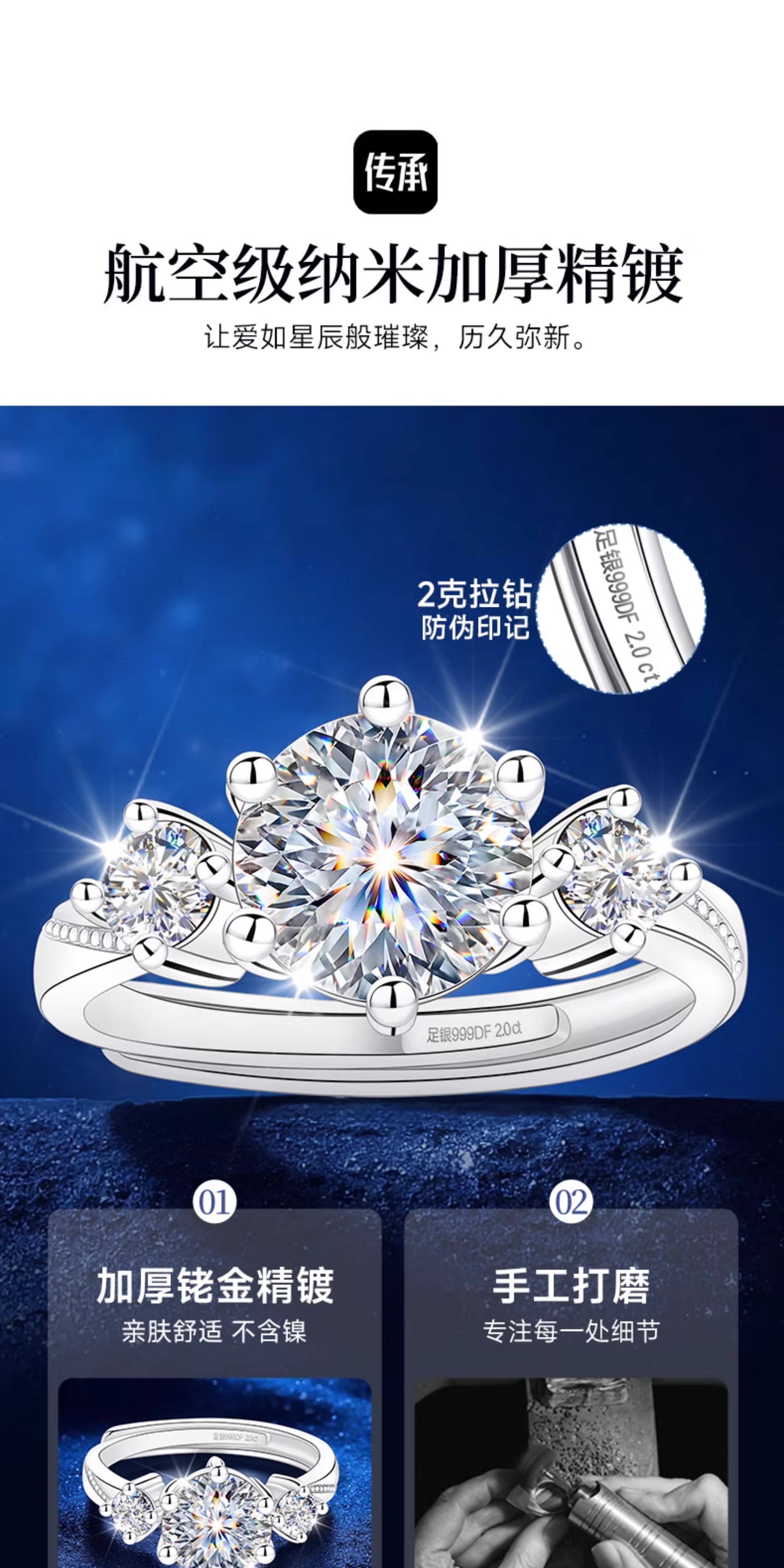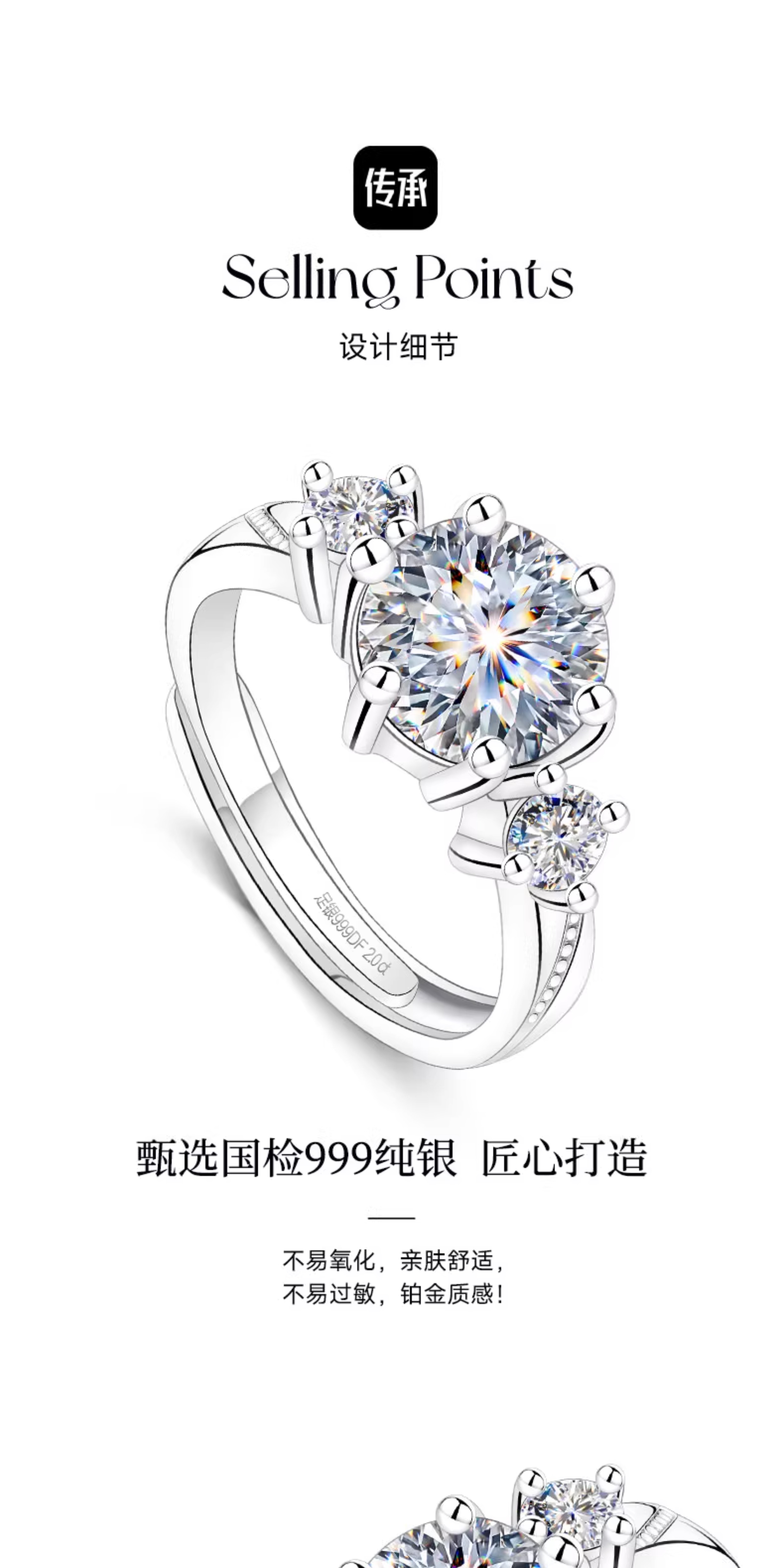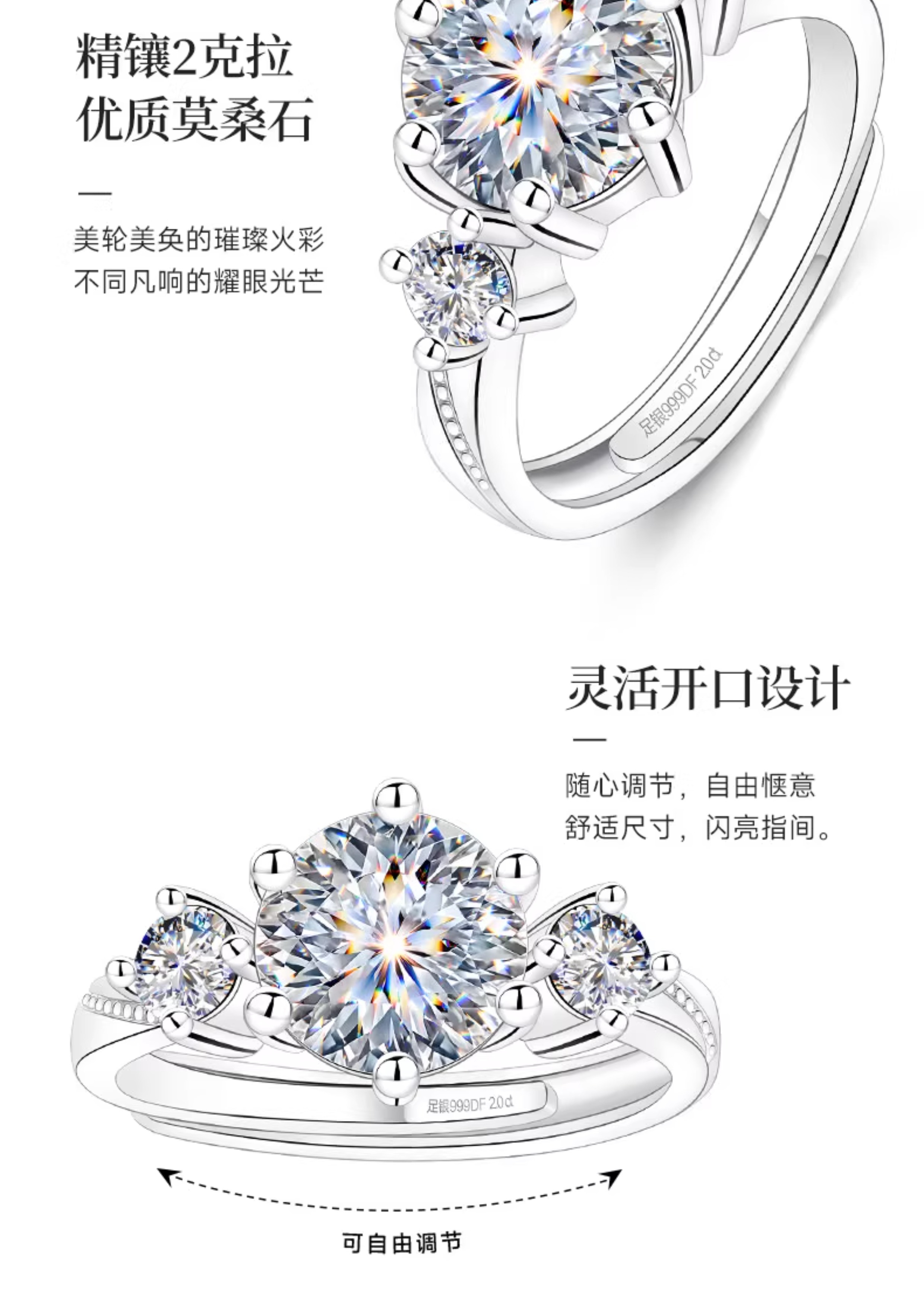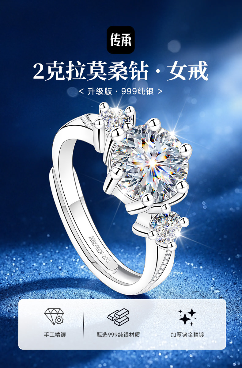 Silver Ring 999 Pure Silver Couple Rings for Women 2 Carat Moissanite Diamond Moissanite Ring Gift for Girlfriend