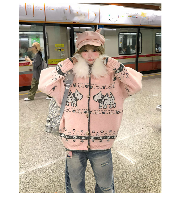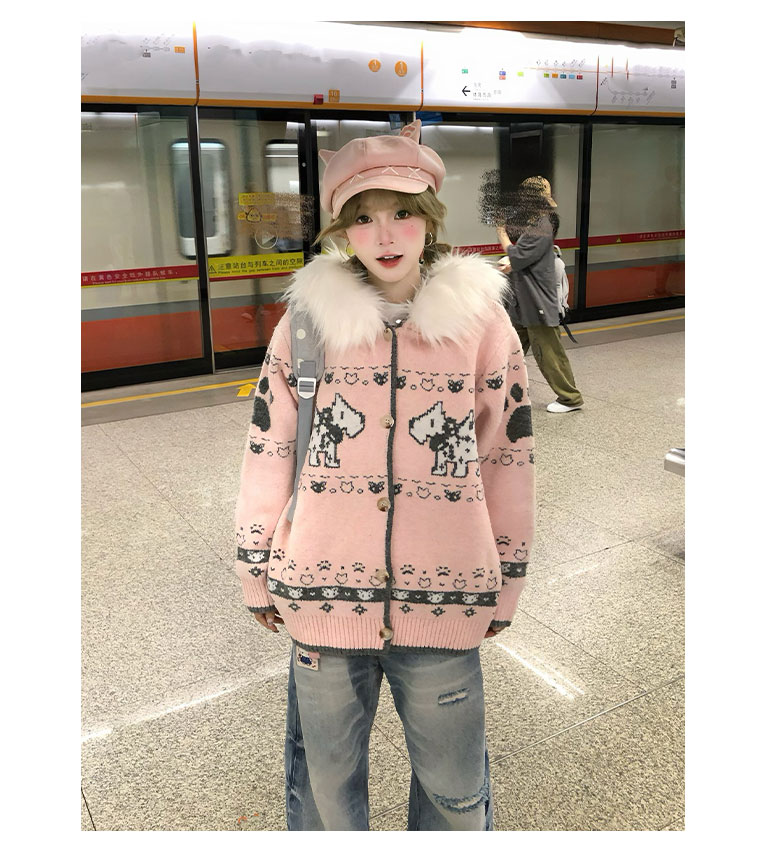 Wenwenbuge Original American Retro Jacquard Hooded Knit Cardigan Fair Isle Puppy Sweater for Women Winter