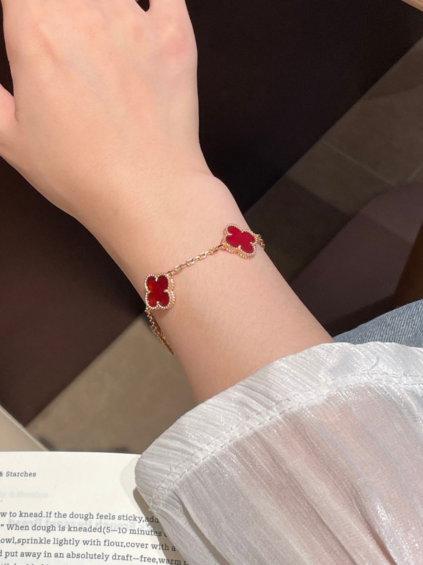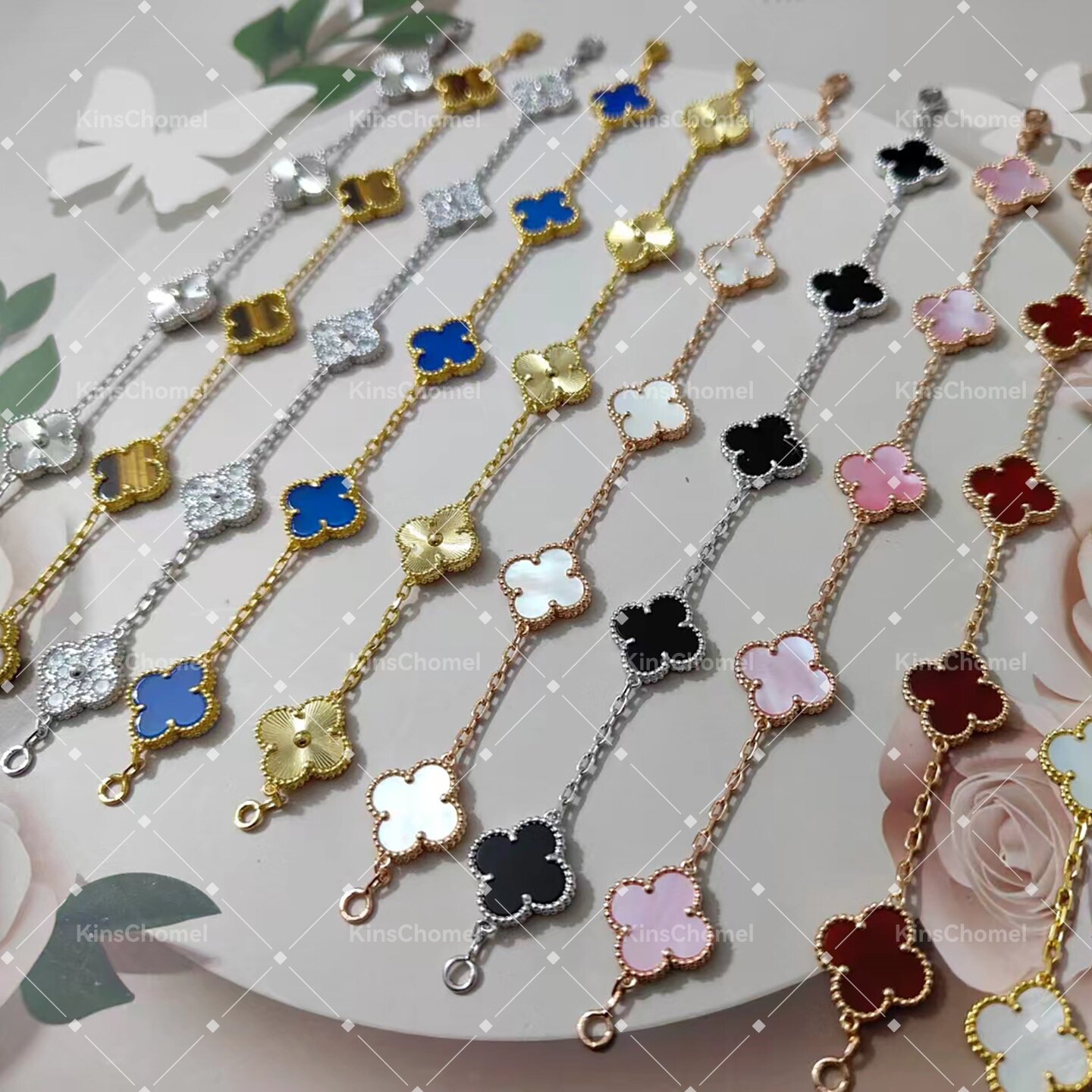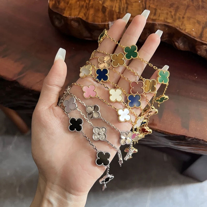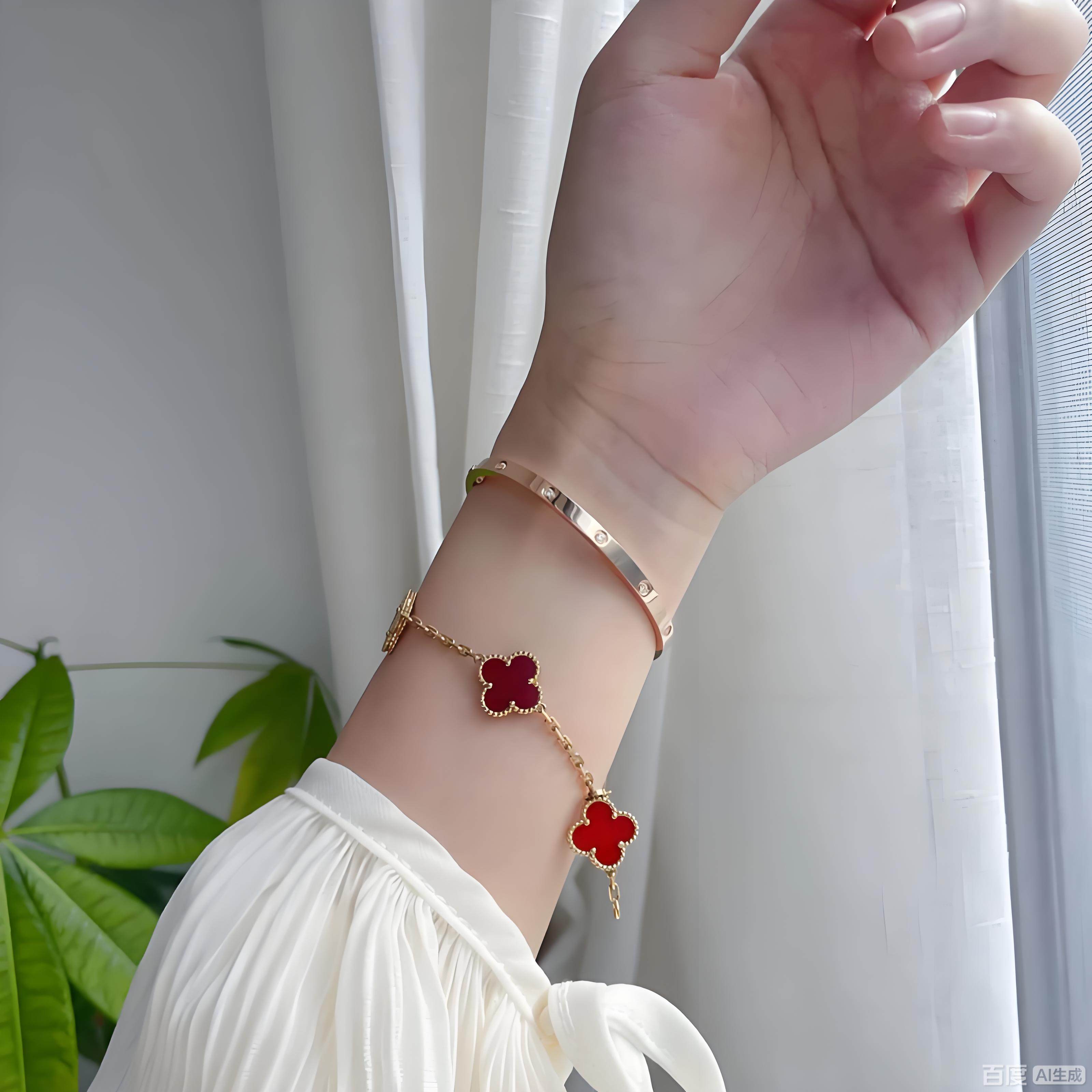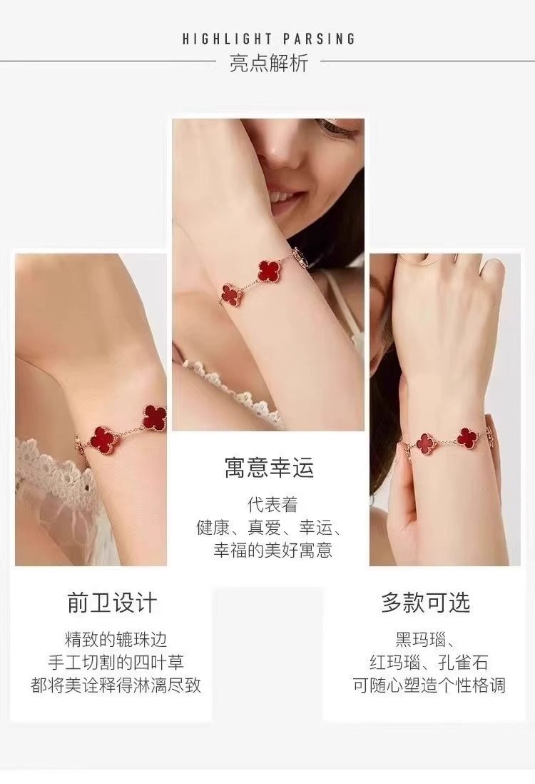 High-End Four-Leaf Clover Five-Flower Bracelet for Women, Red Chalcedony, White Mother-Of-Pearl, Laser-Encrusted Full Diamond Men's Stackable Bracelet, Light Luxury