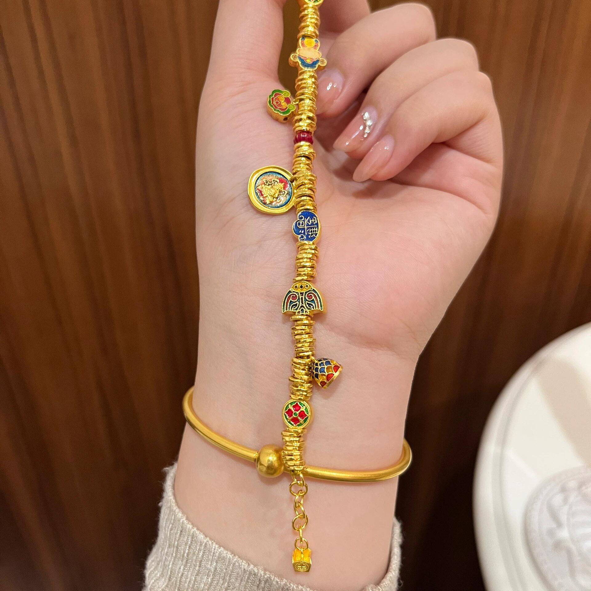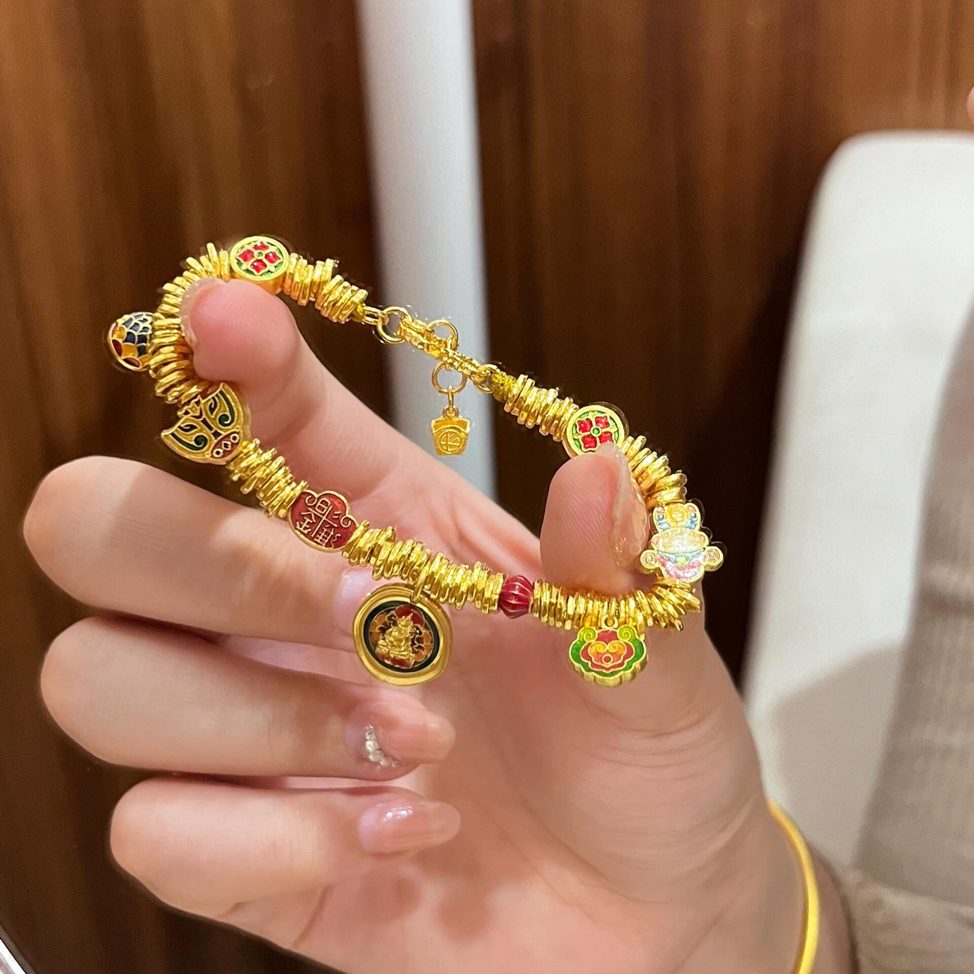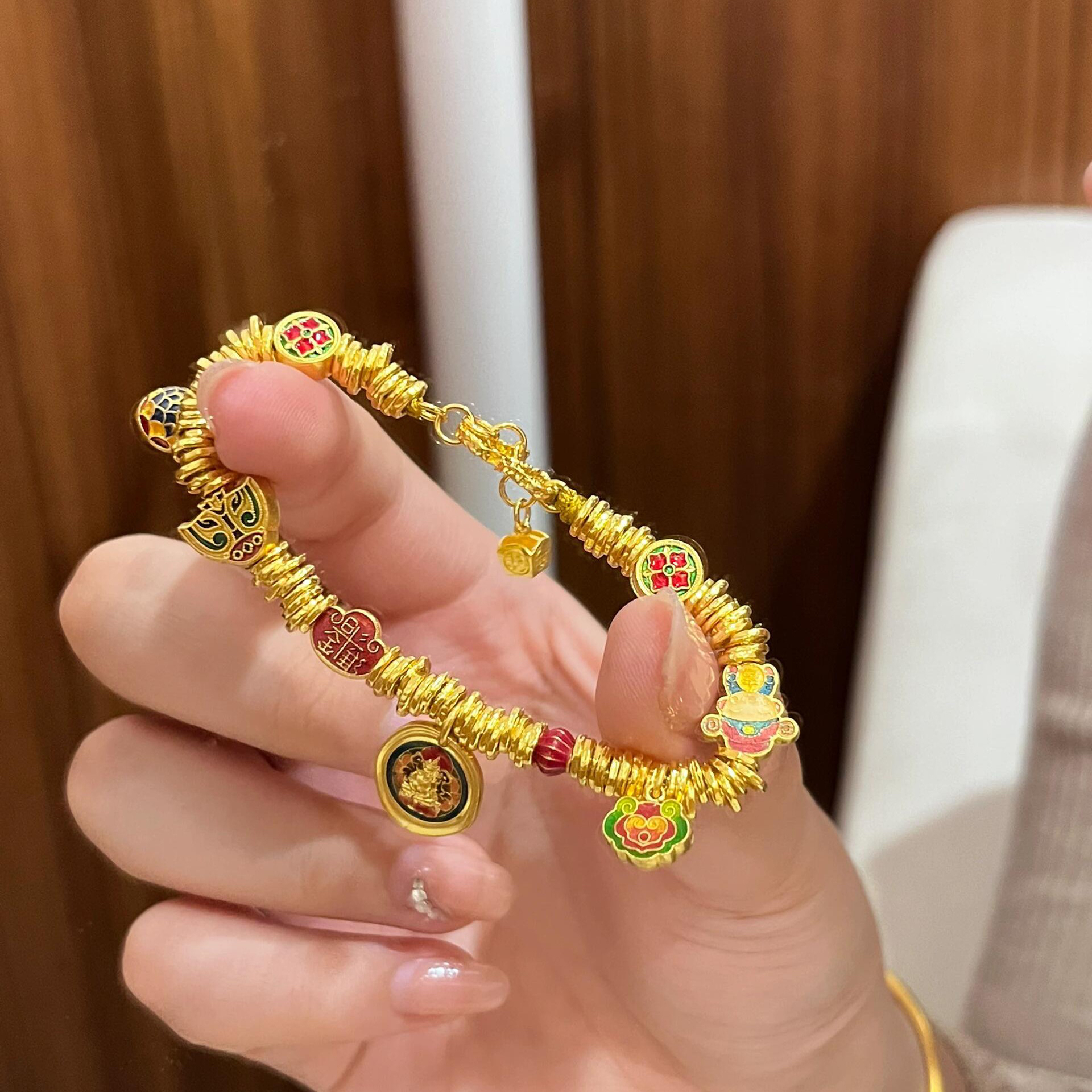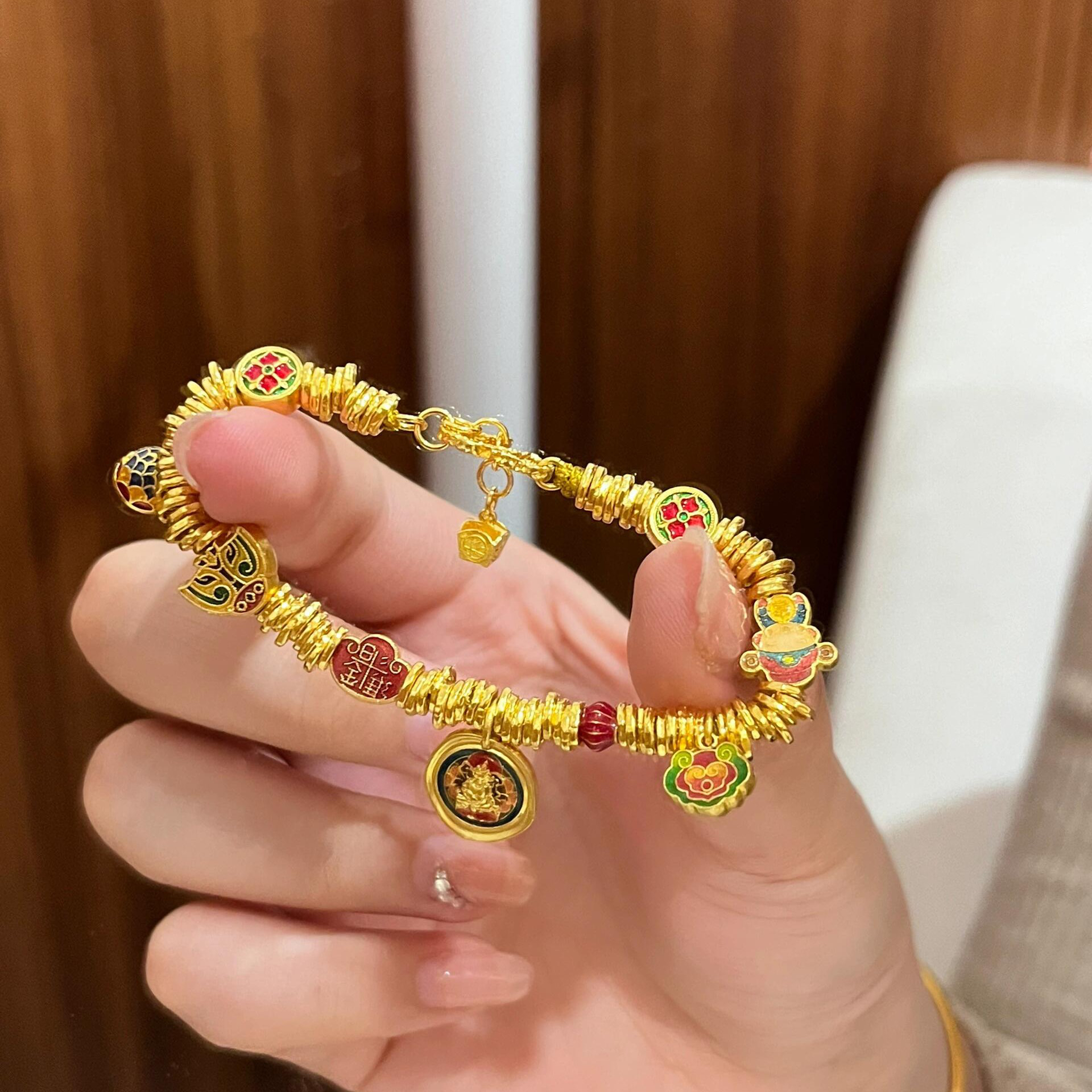 Shenzhen Shuibeijiao Gold Weixue Same Style Burnt Blue Enamel Yellow God of Wealth 999 Pure Gold Zaji Ram Coiled Bracelet