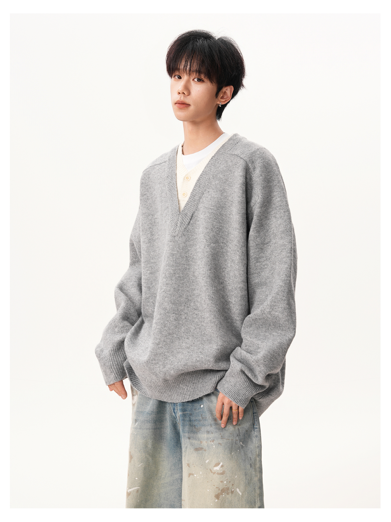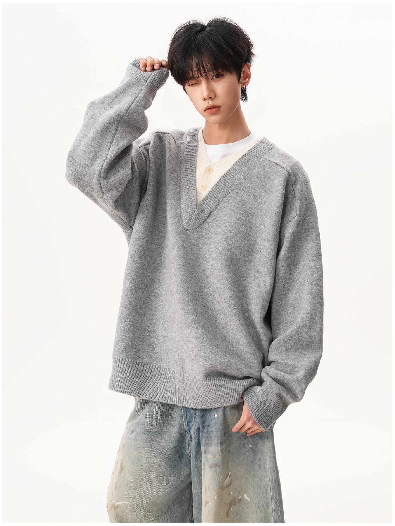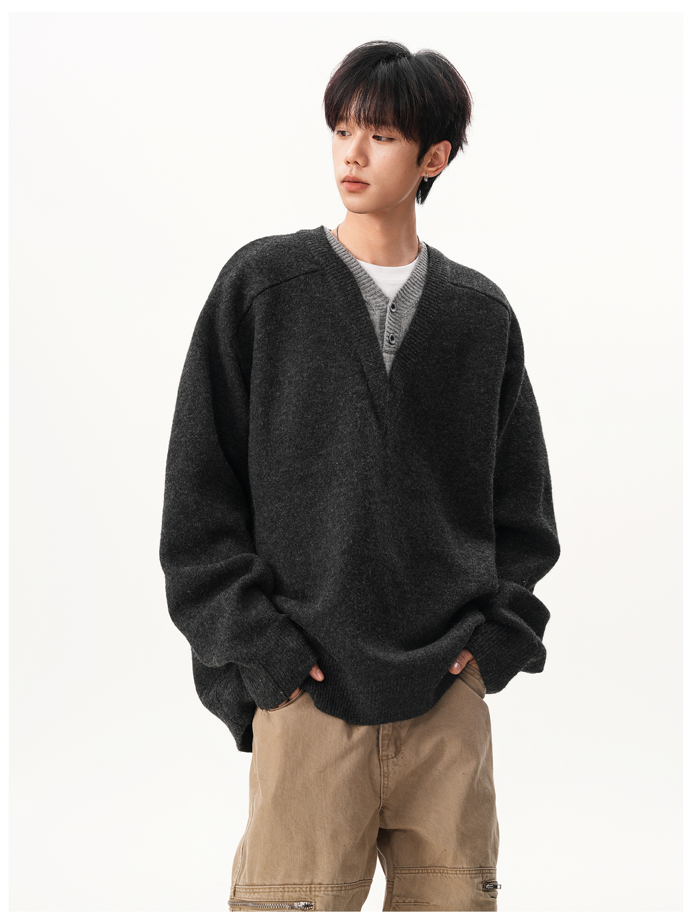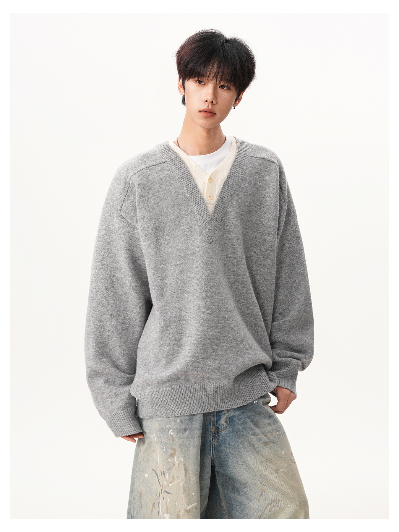 Fake Two-Piece V-Neck Knit Sweater for Men, New Autumn and Winter Retro Lazy Style Polo Pullover Loose Long-Sleeve Jacket