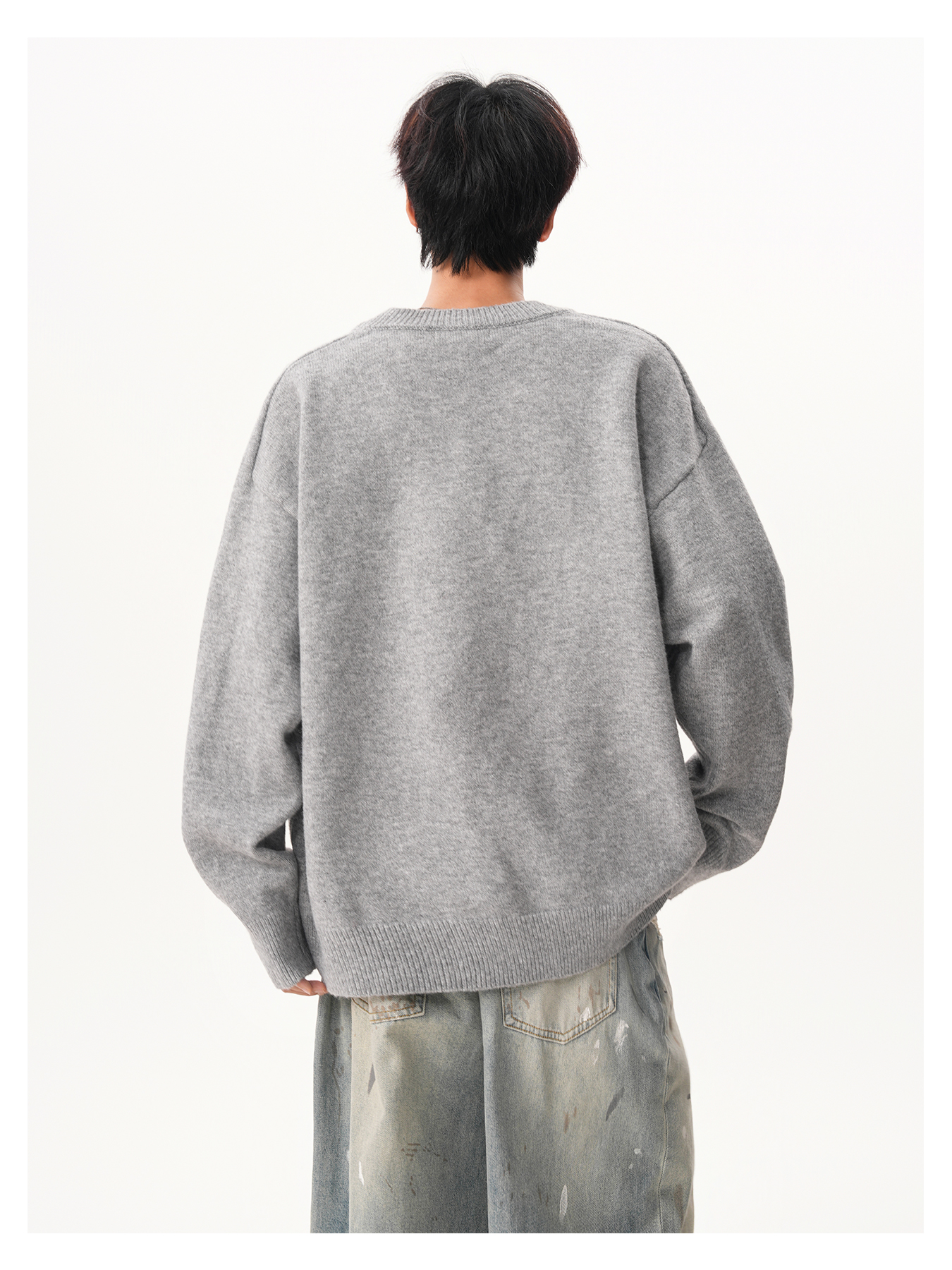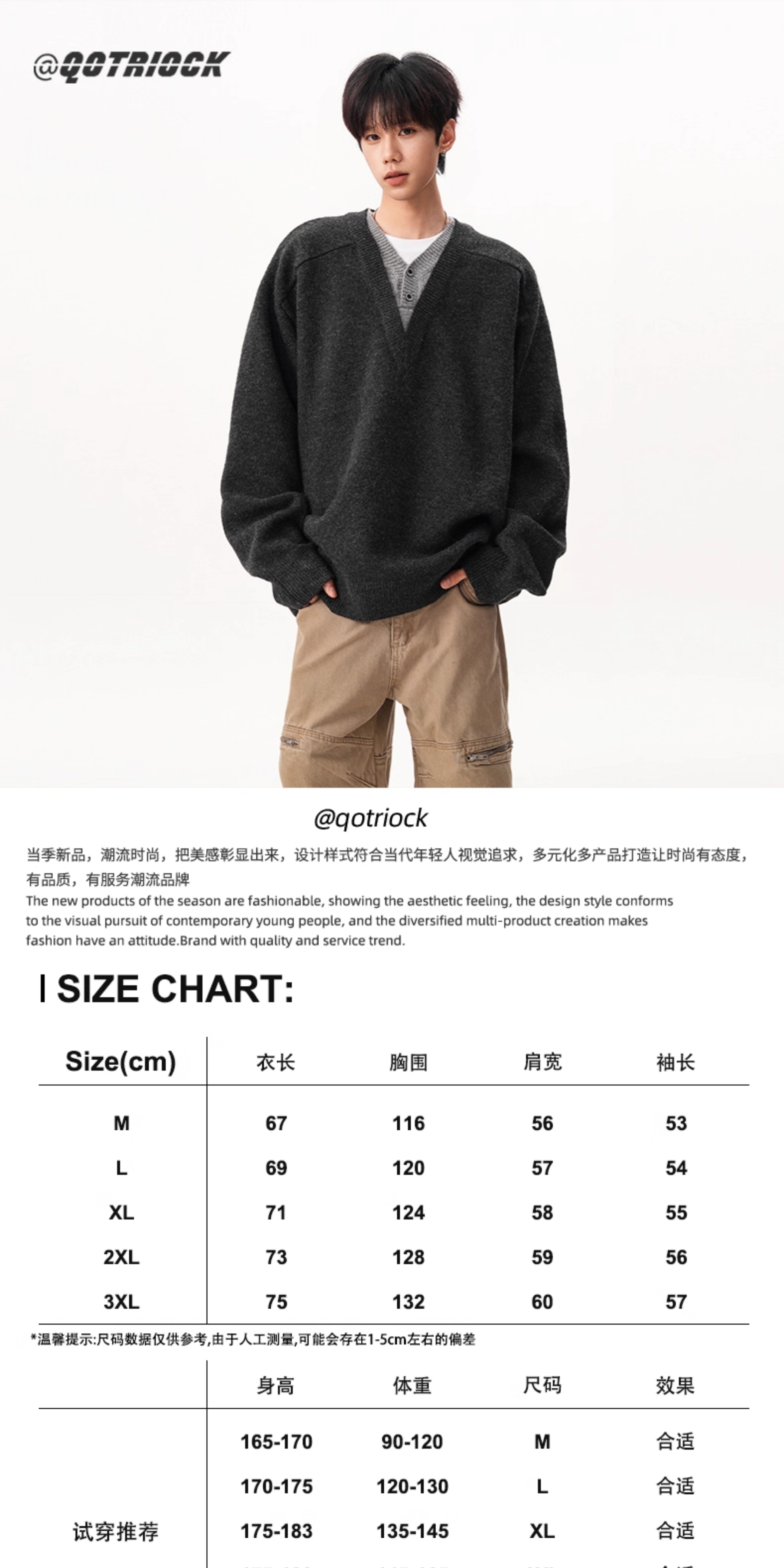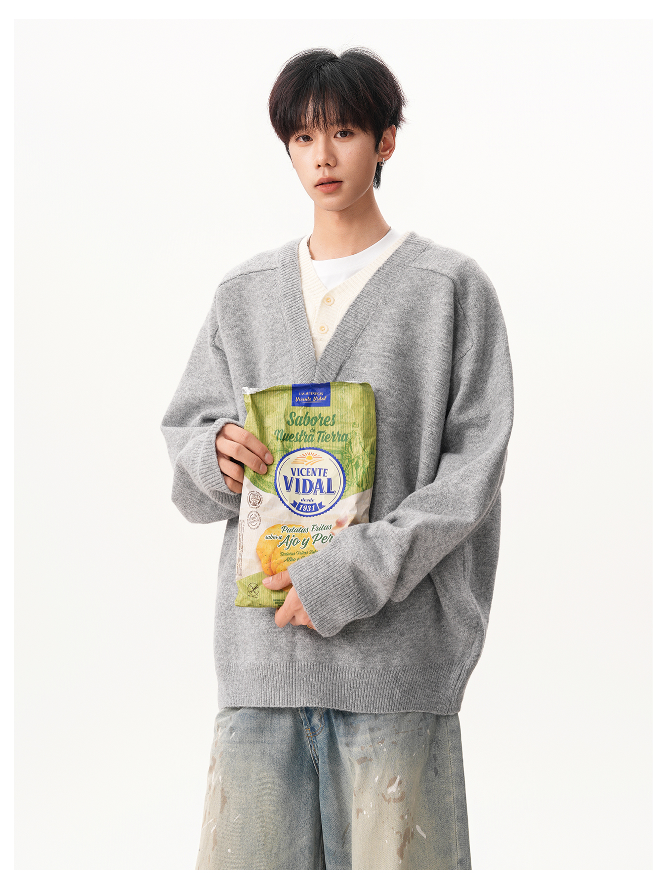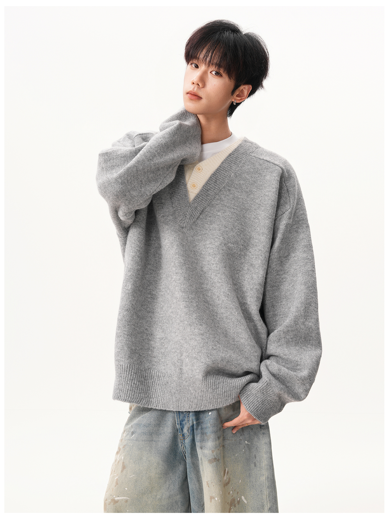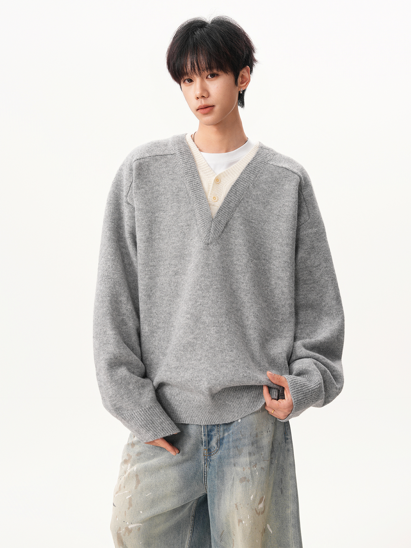 Fake Two-Piece V-Neck Knit Sweater for Men, New Autumn and Winter Retro Lazy Style Polo Pullover Loose Long-Sleeve Jacket