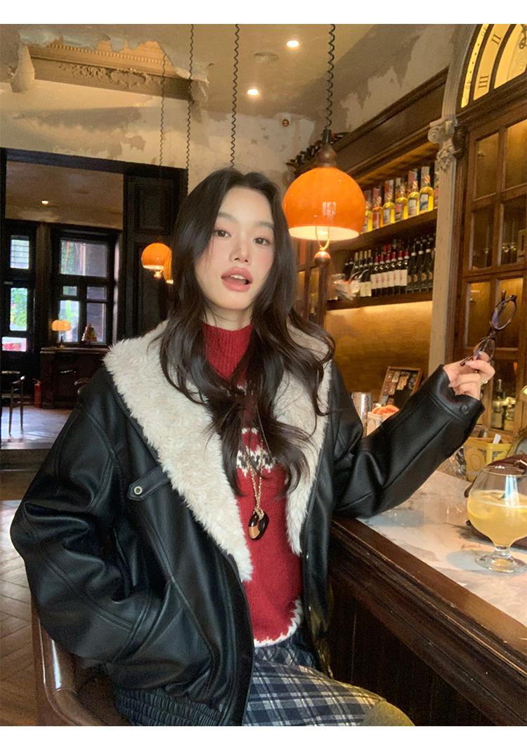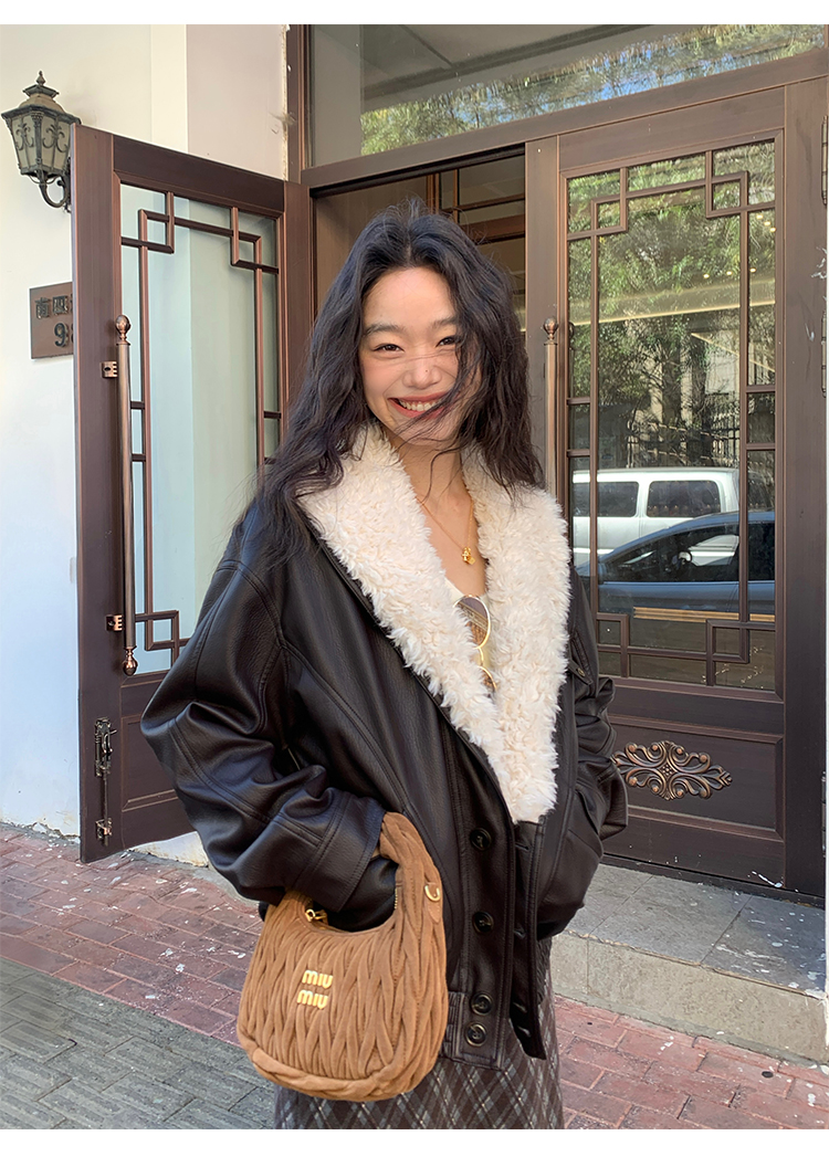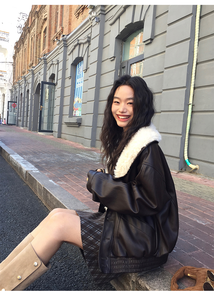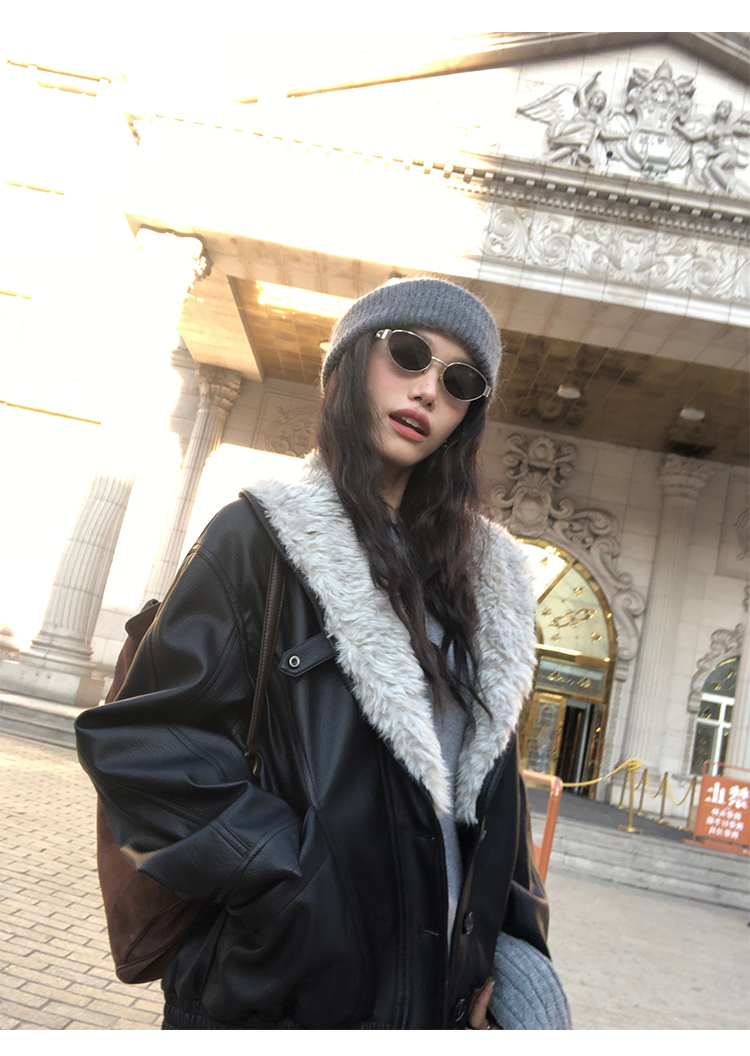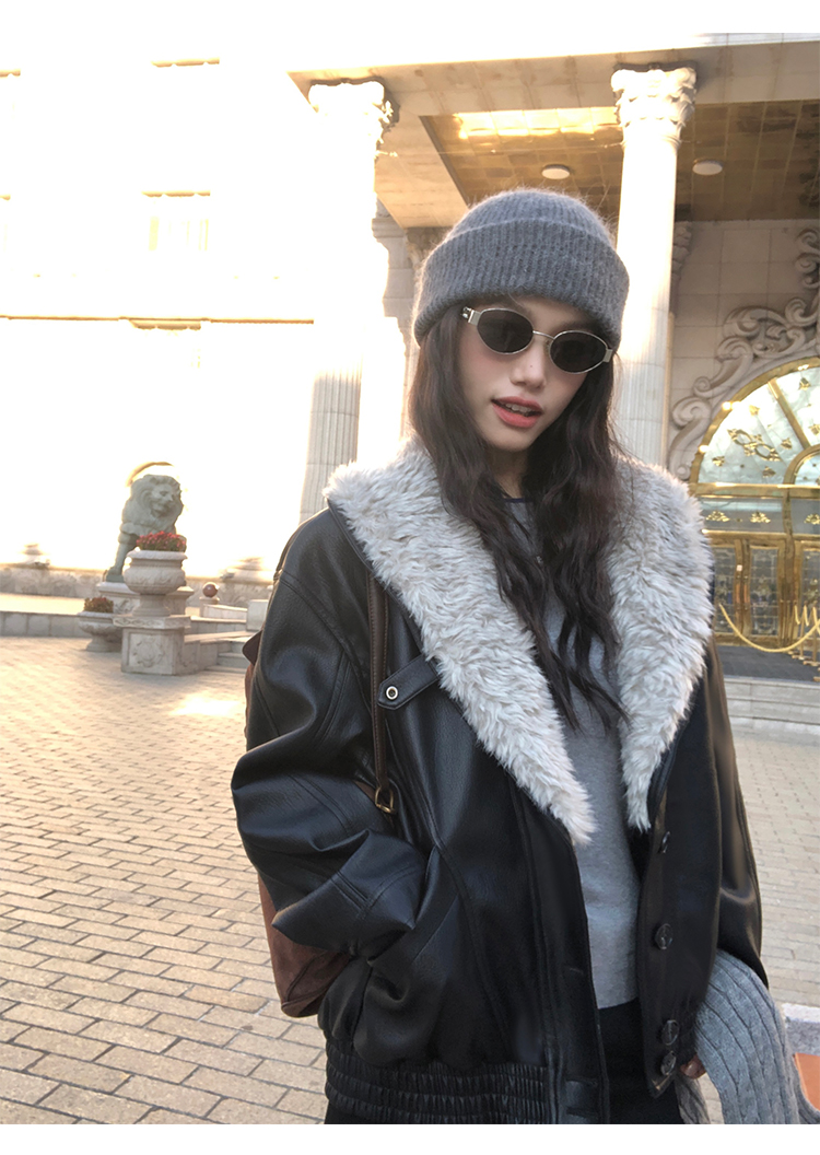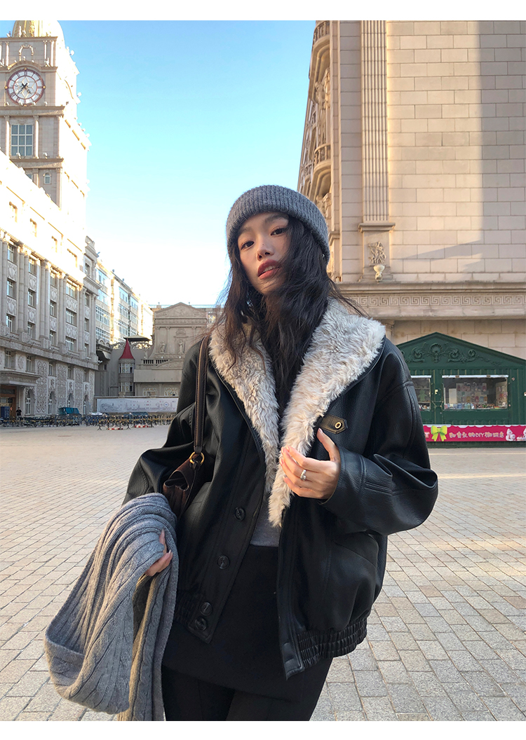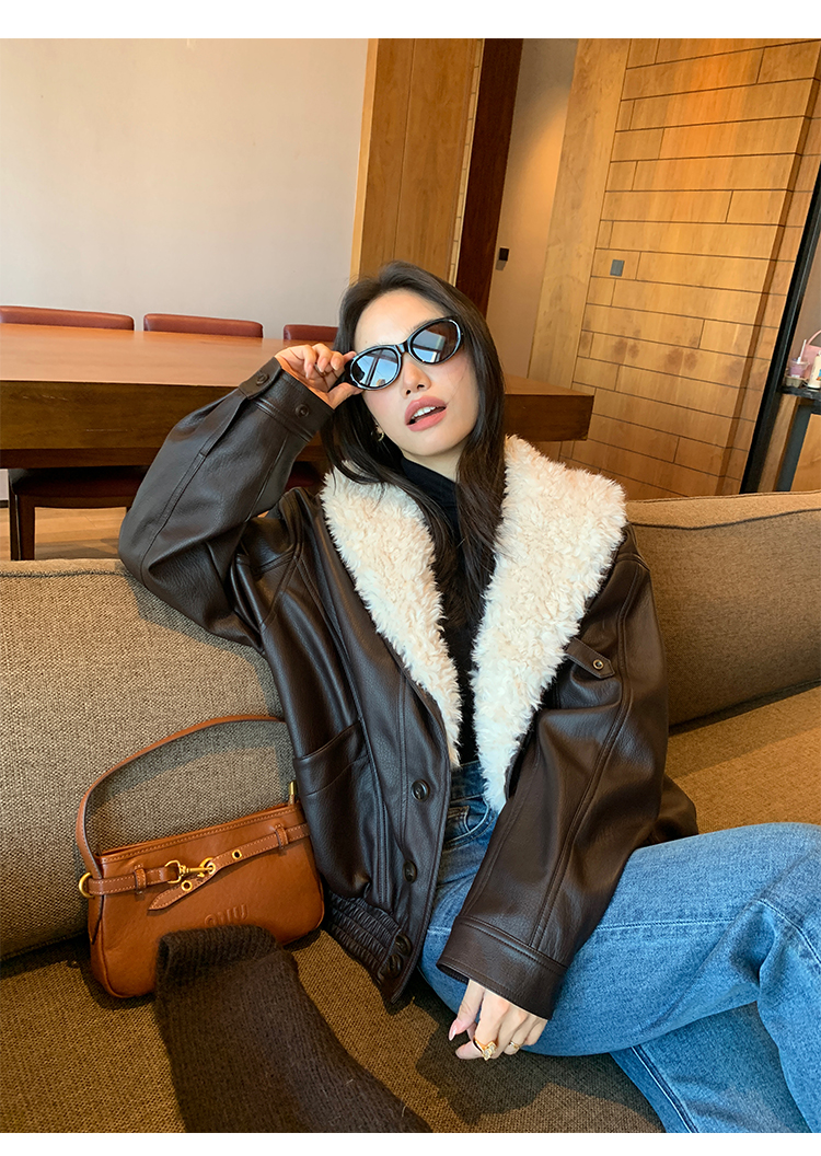 Pusumede High-Quality Private Label Vintage Large Fur Collar Pu Leather Jacket for Women, Stylish Short Warm Leather Coat