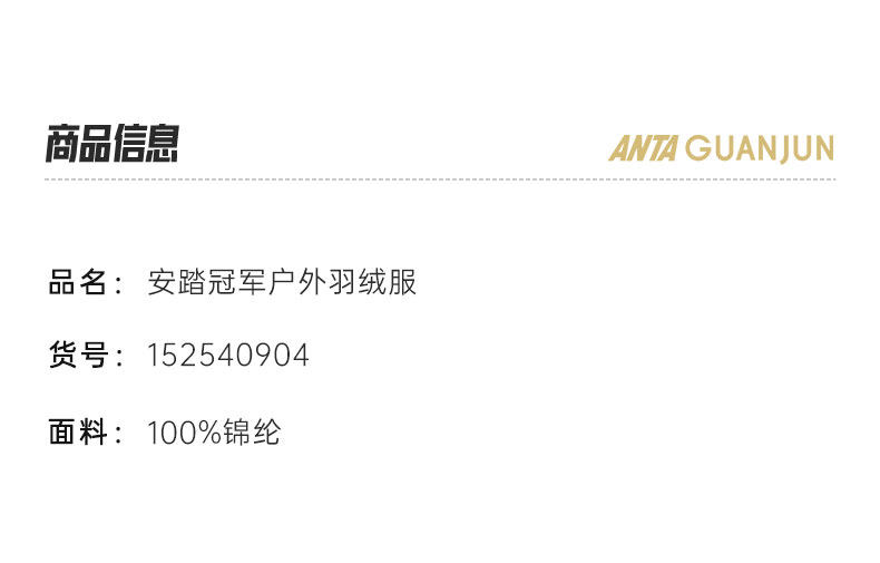 Anta Champion Pertex Quantum down Jacket Winter Outdoor Warm down Jacket for Men 152540904