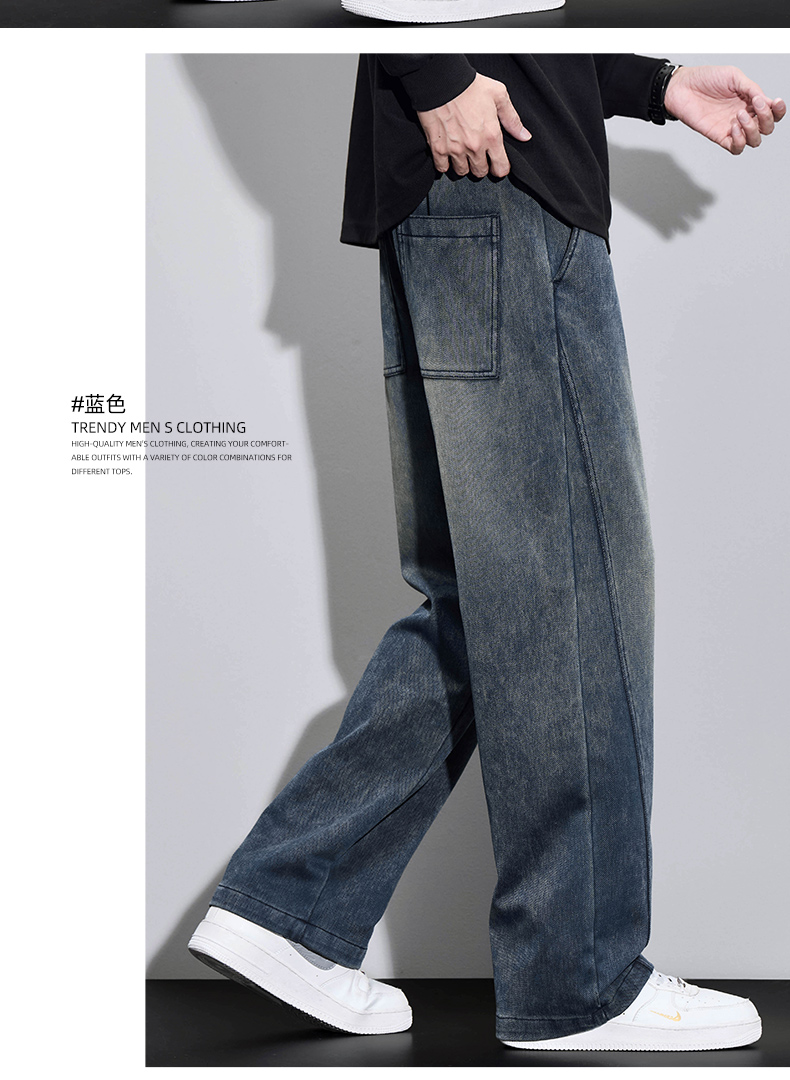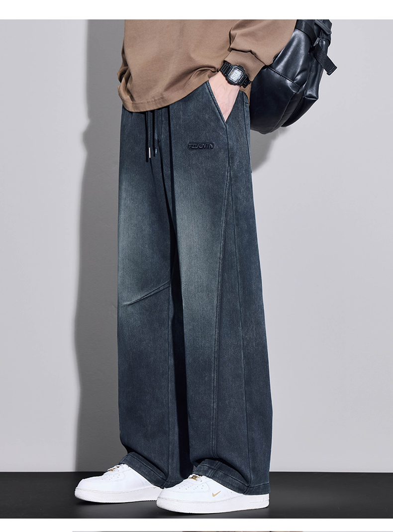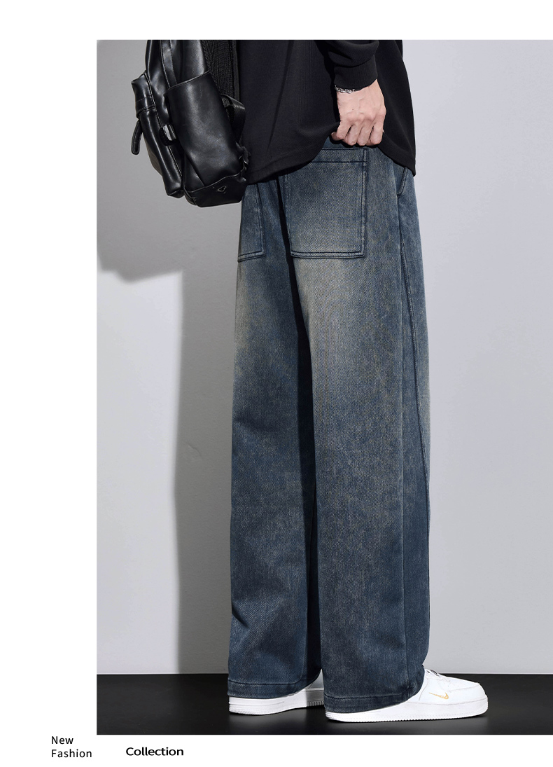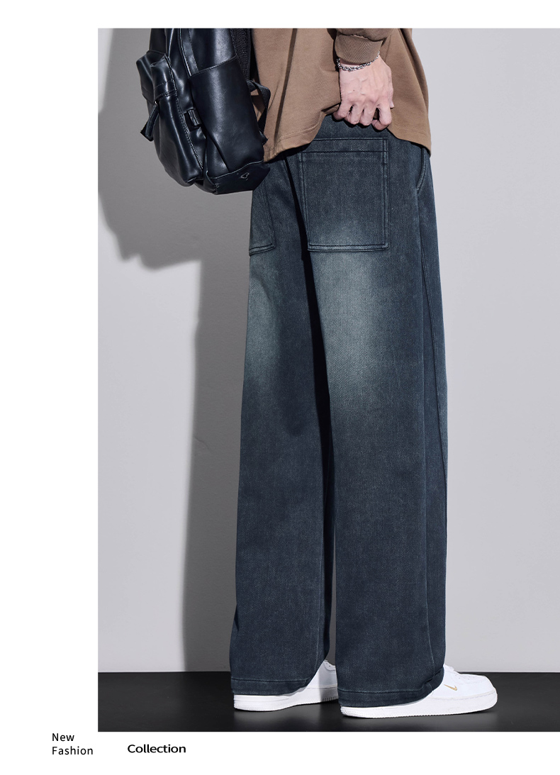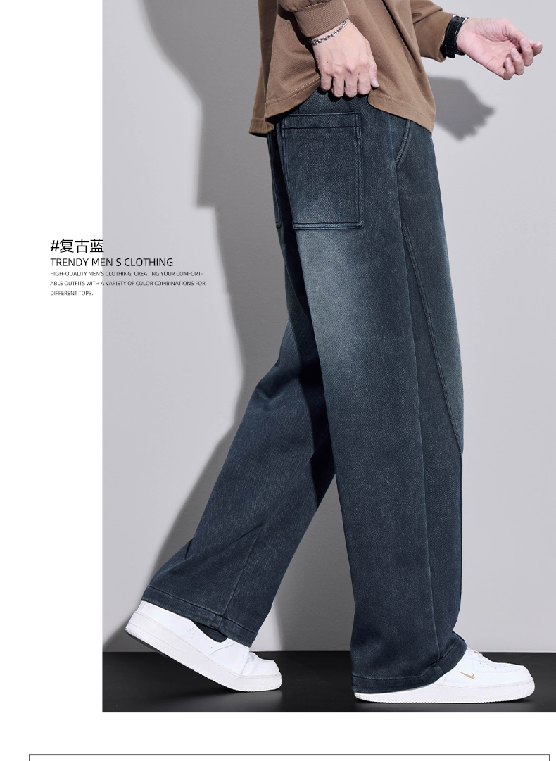 2025 Autumn/Winter New Men's Vintage Washed Knitted Loose Straight American Casual Fleece-Lined Long Jeans