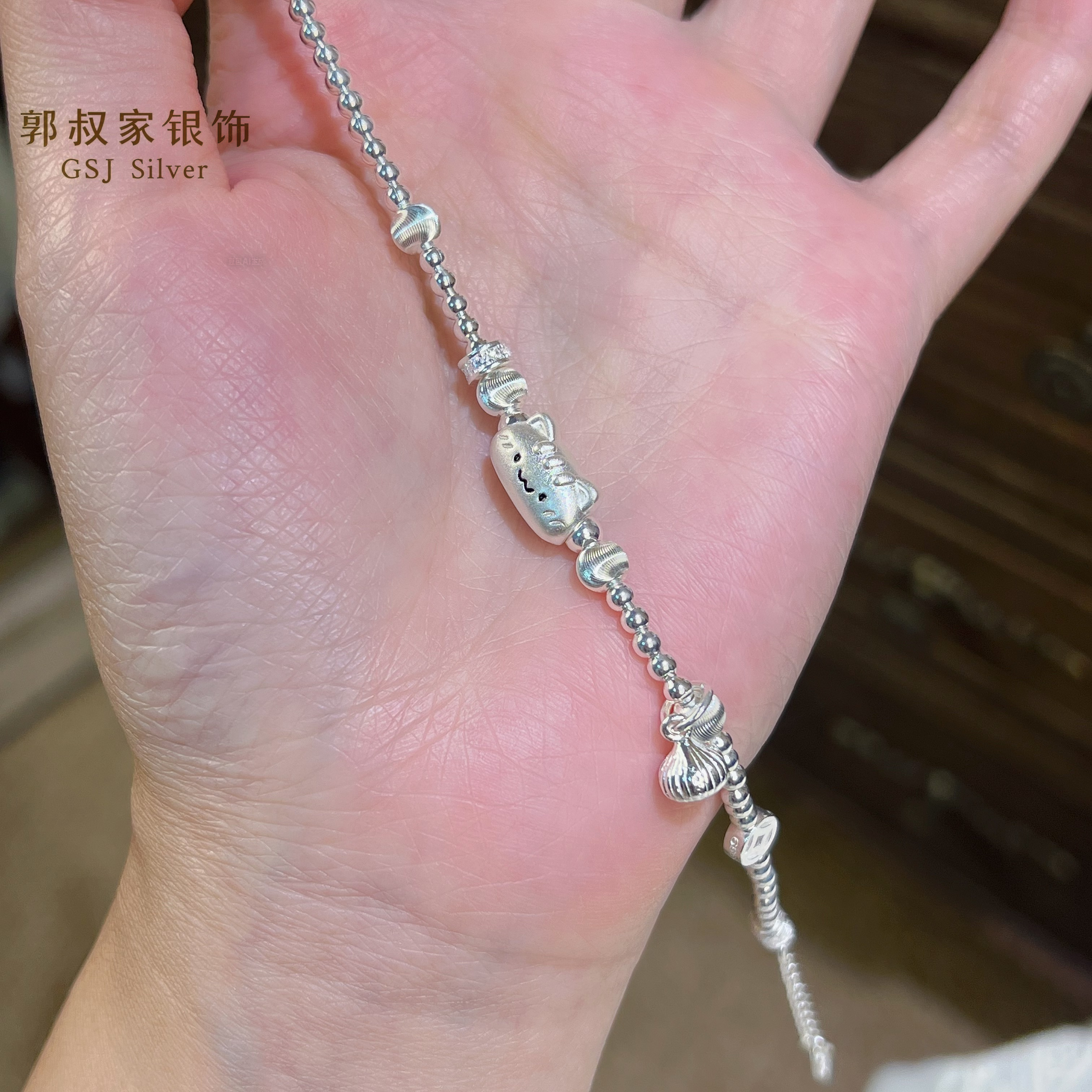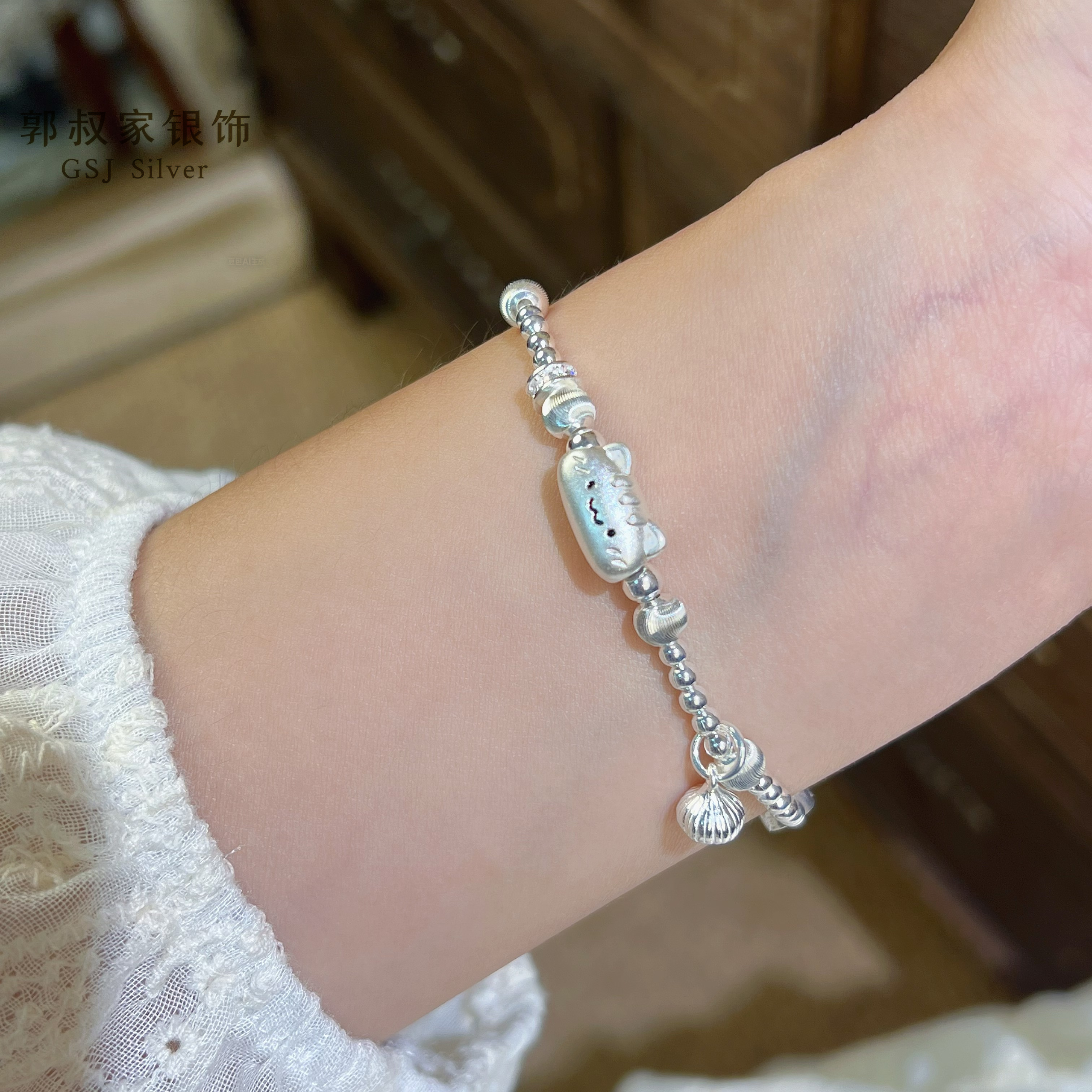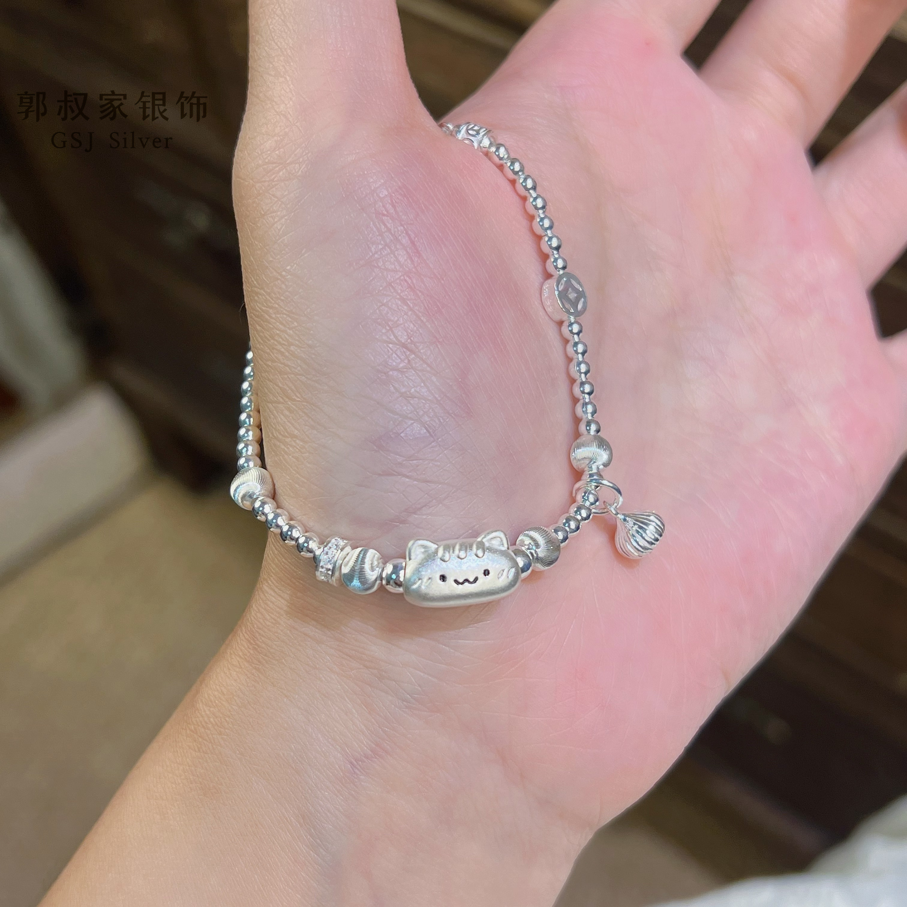 999 Pure Silver Baguette Cat Sterling Silver Bracelet, Matte, Chinese Style, Cute, Delicate, Versatile Bracelet, Gift for Girlfriend or Best Friend