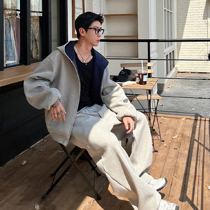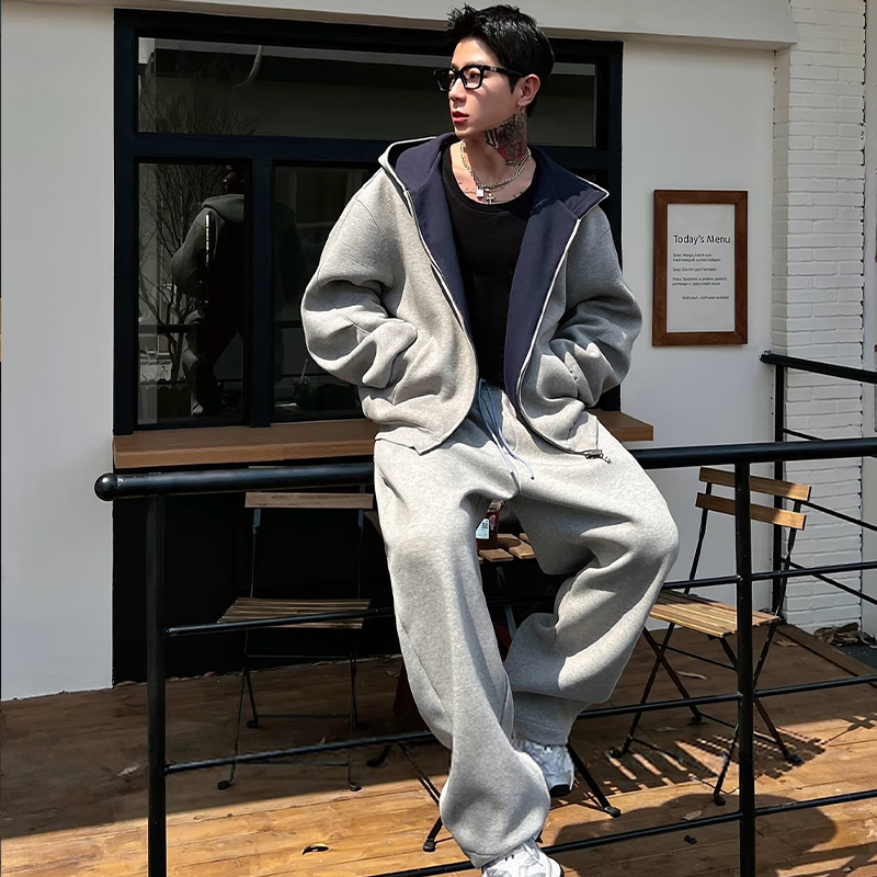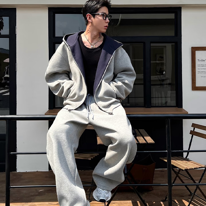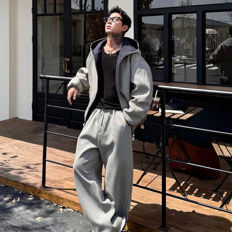 Grey Heavy weight ootd Wear Suit Men's Fall and winter lazy style Cardigan Hooded Sweatshirt Outwear Casual Sports Sweats