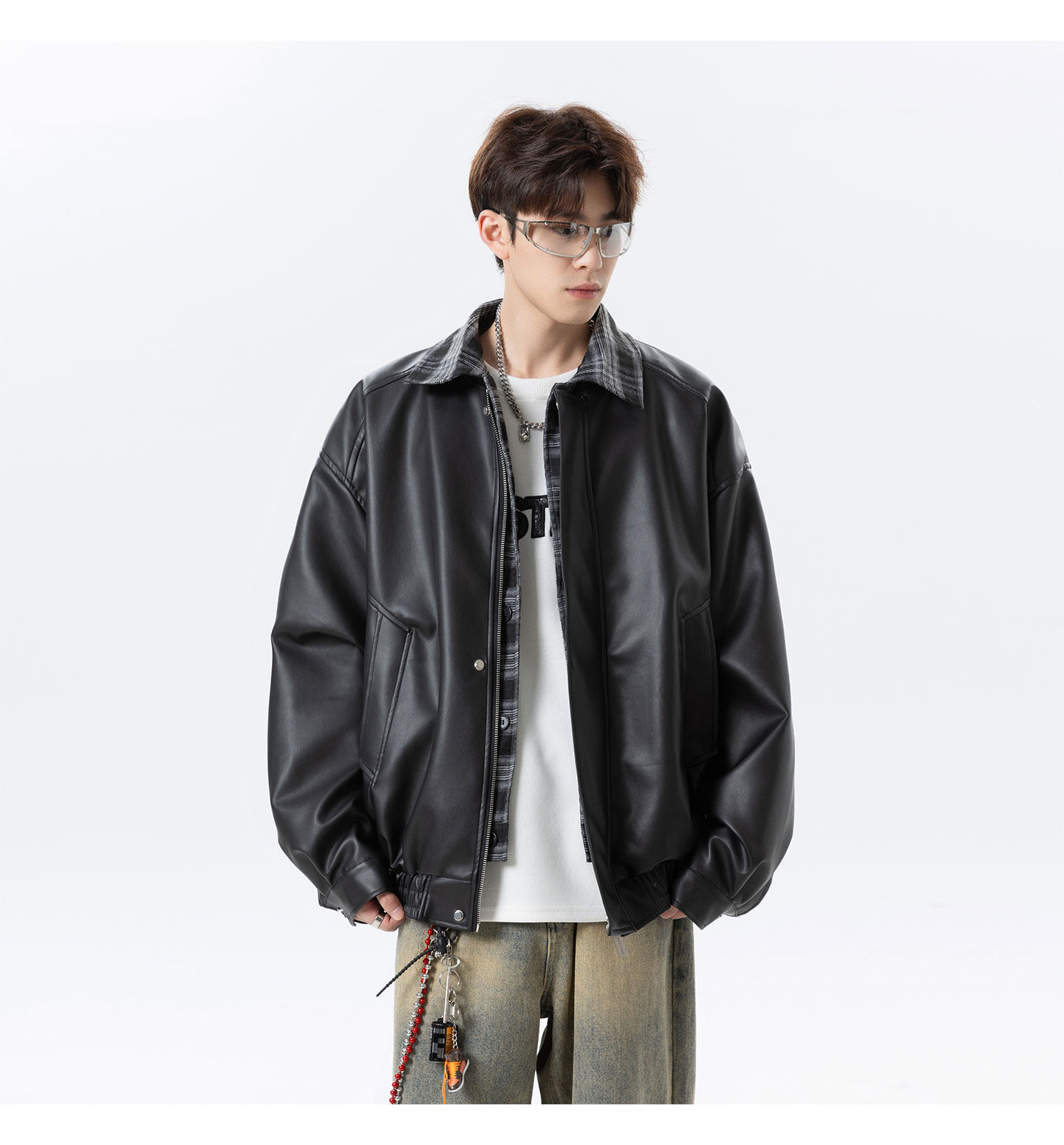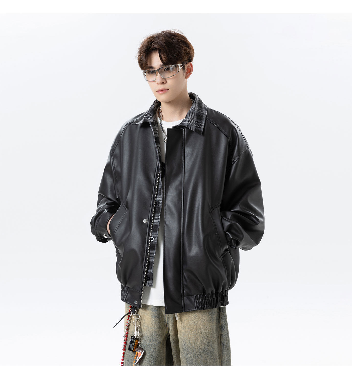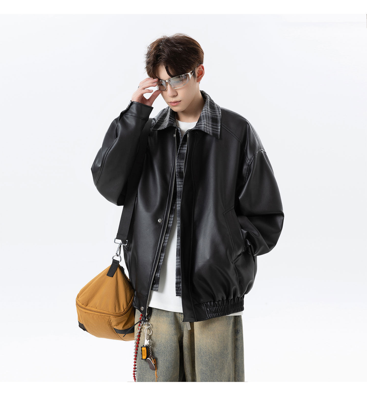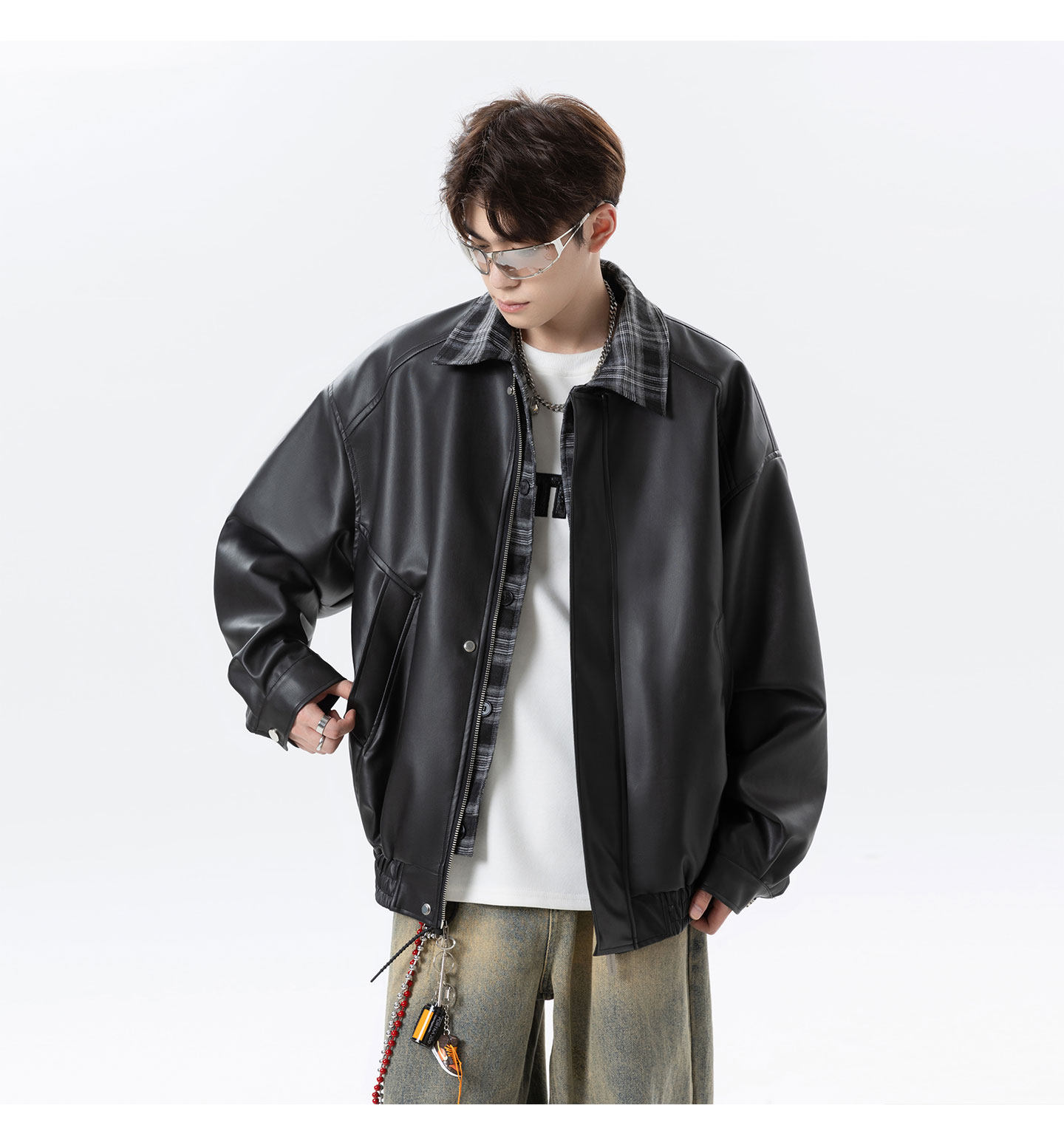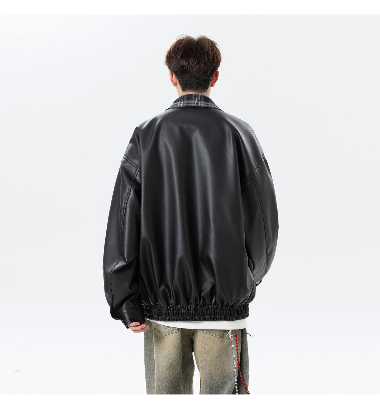 Fake Two-Piece Plaid Patchwork Lapel Leather Jacket for Men, Spring and Autumn 2026 New American High Street Trendy Brand, Cool and Stylish Workwear Jacket