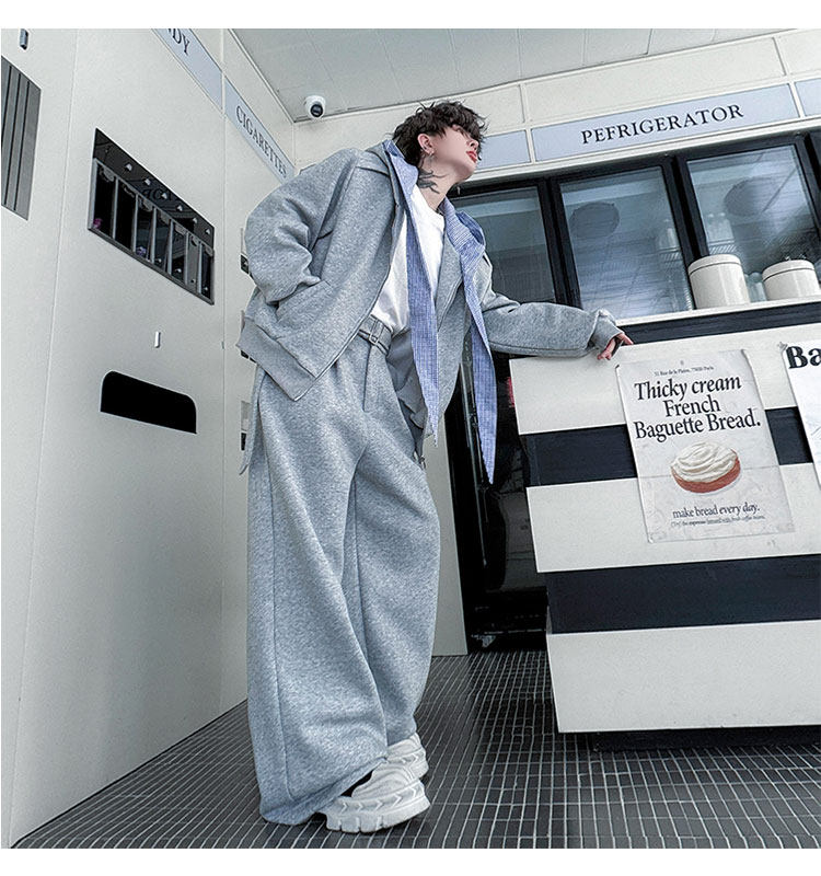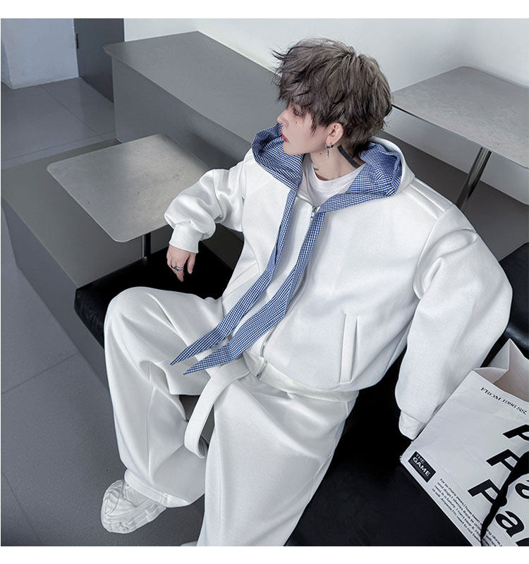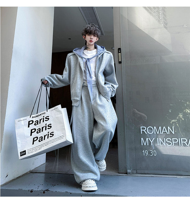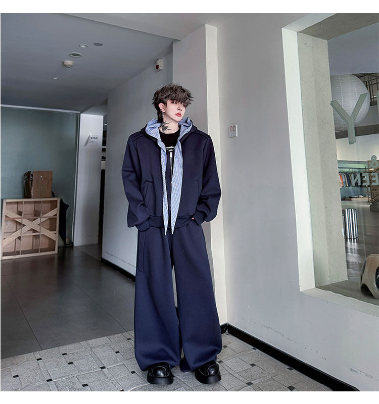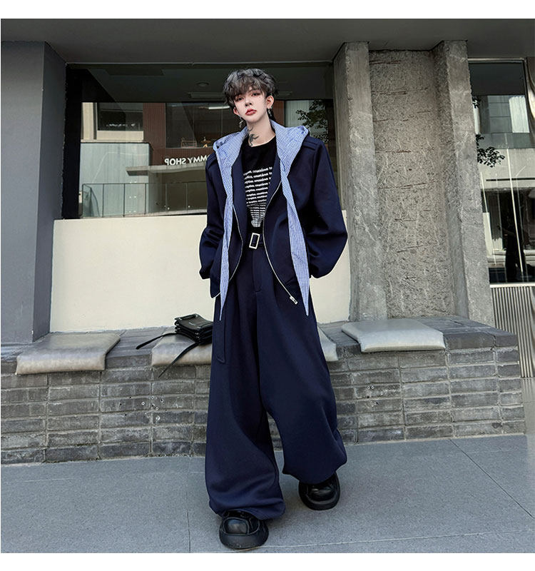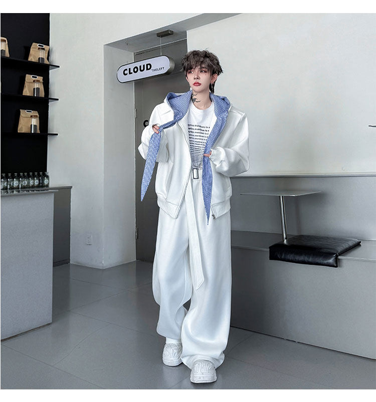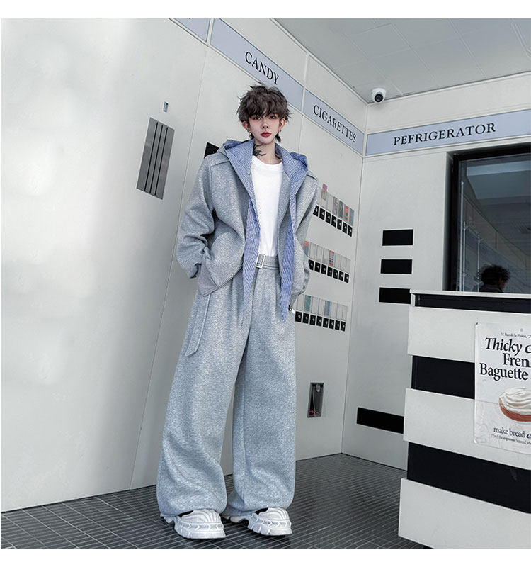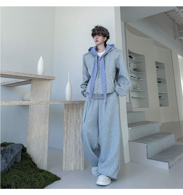 Autumn Niche Plaid Color-Blocked Hooded Cardigan Sweatshirt Set for Men Paired with Wide-Leg Trousers, a High-End Look Set