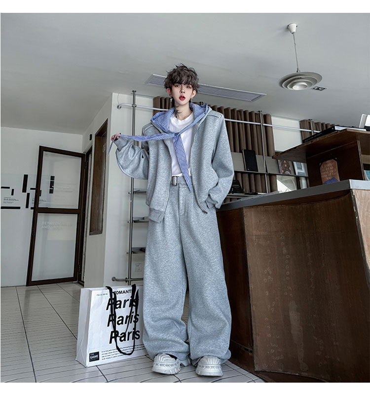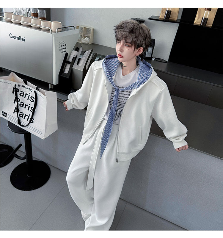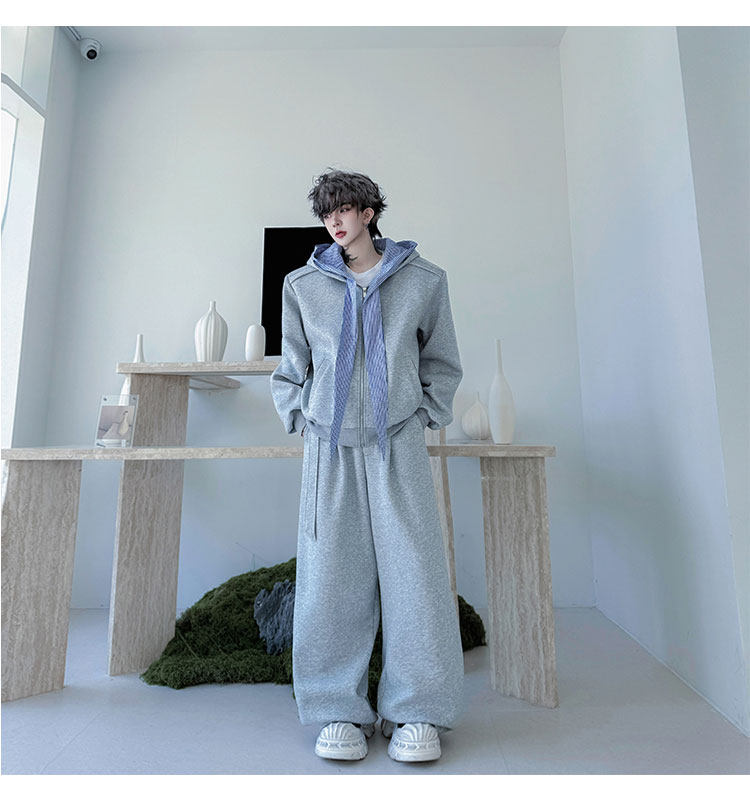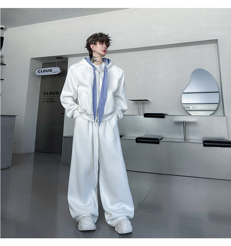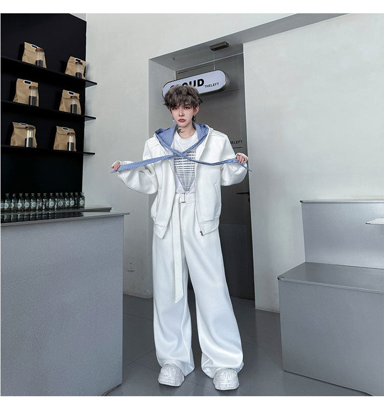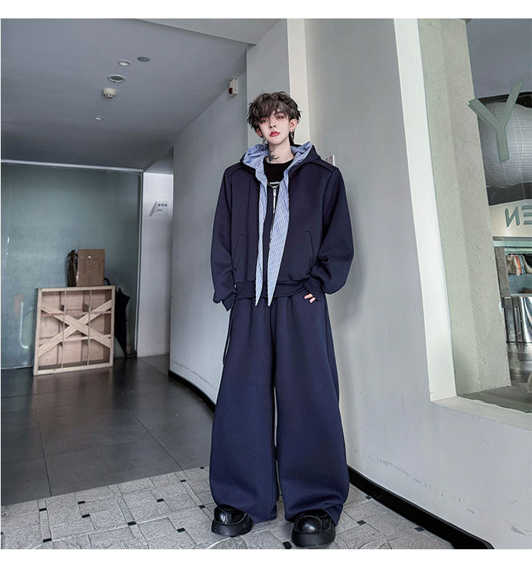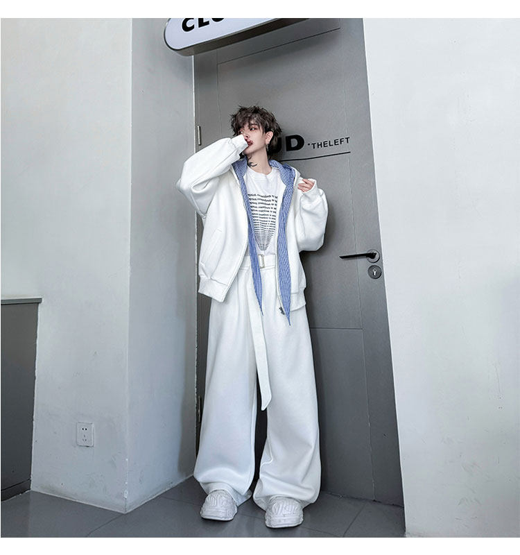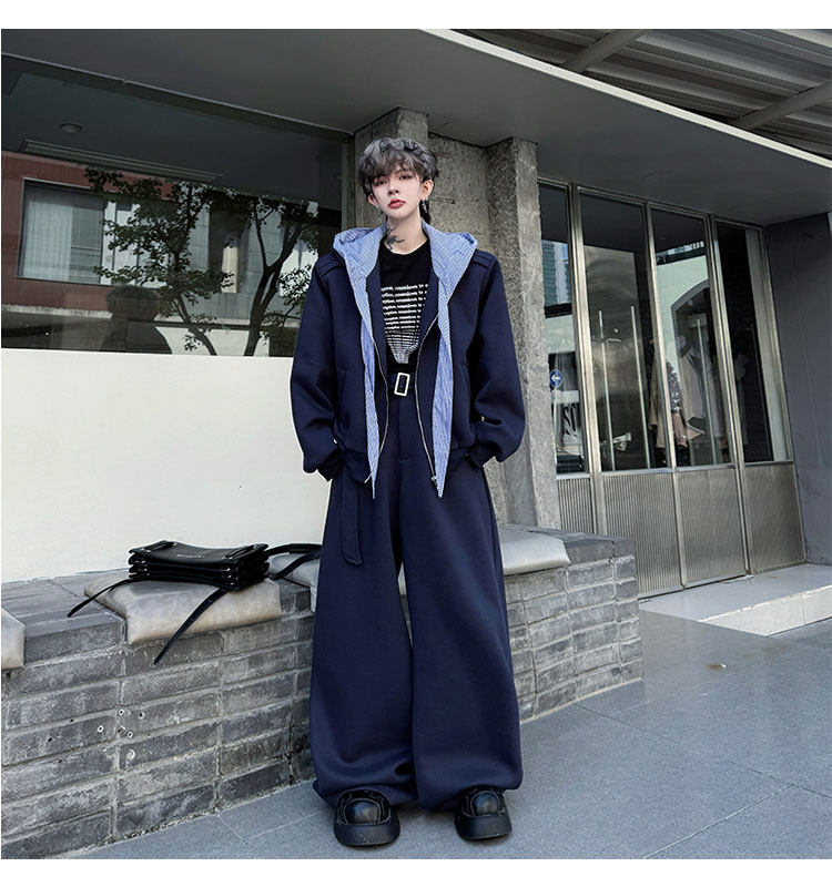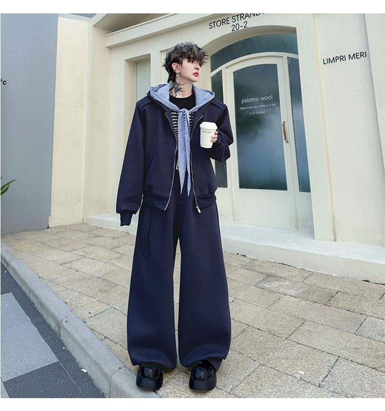 Autumn Niche Plaid Color-Blocked Hooded Cardigan Sweatshirt Set for Men Paired with Wide-Leg Trousers, a High-End Look Set