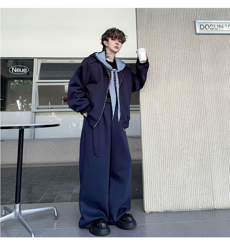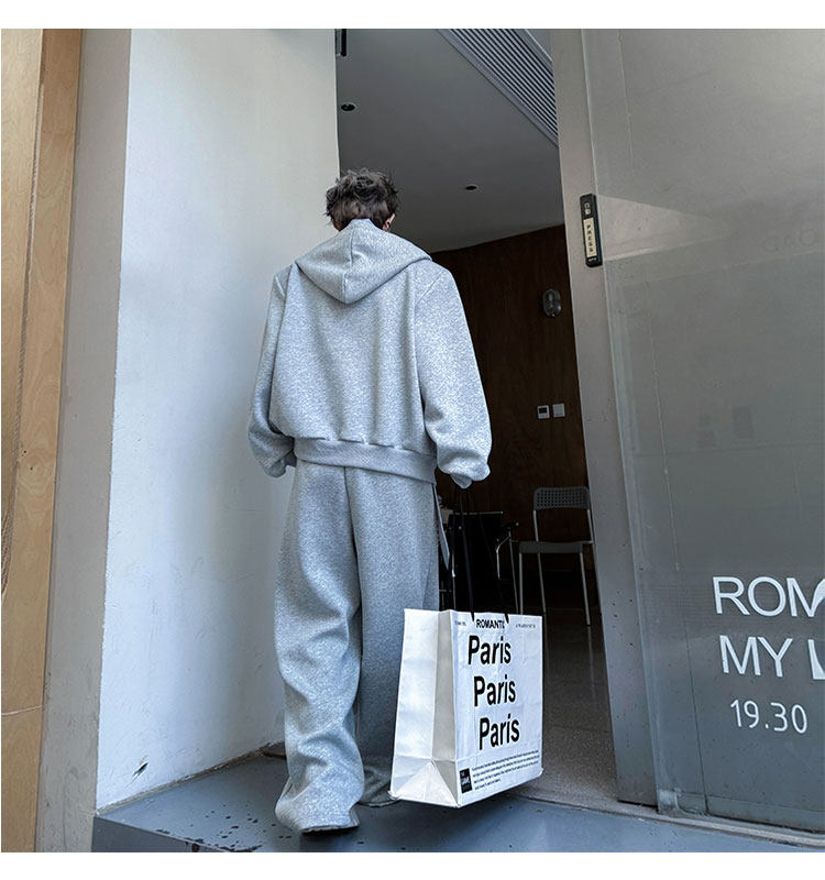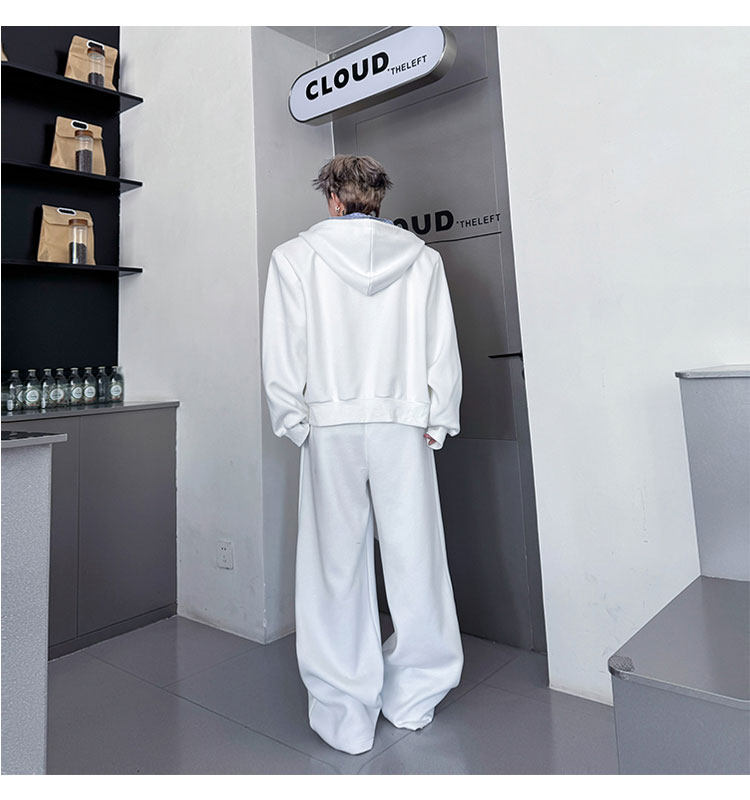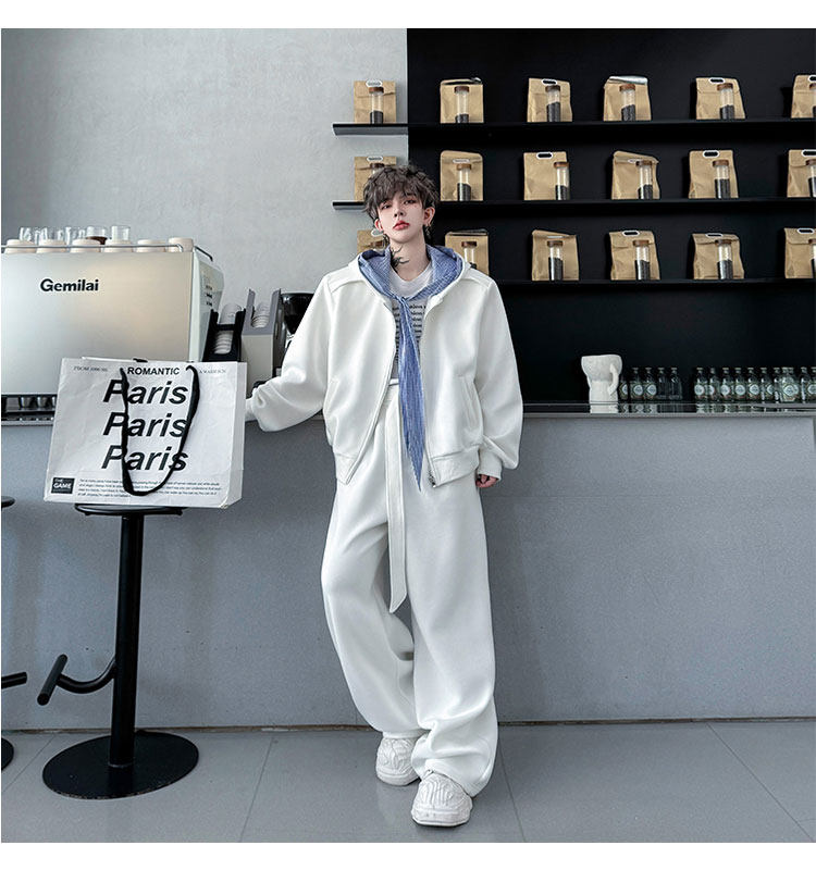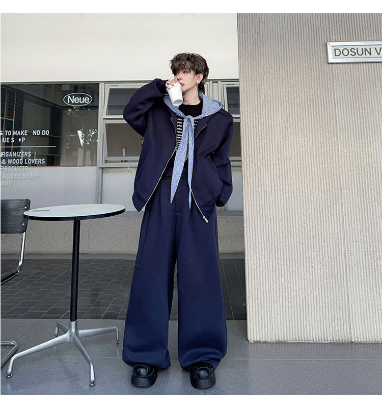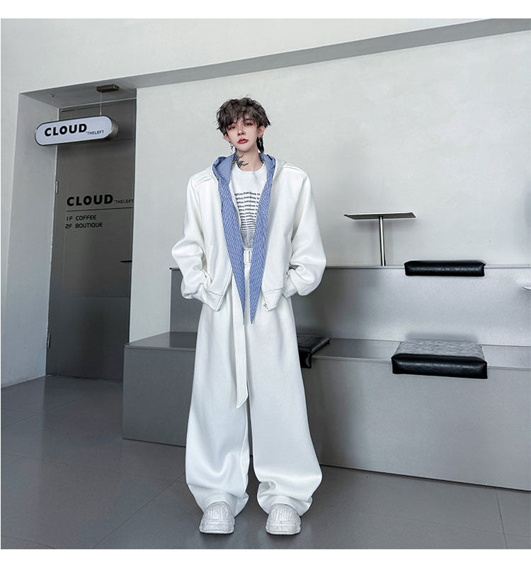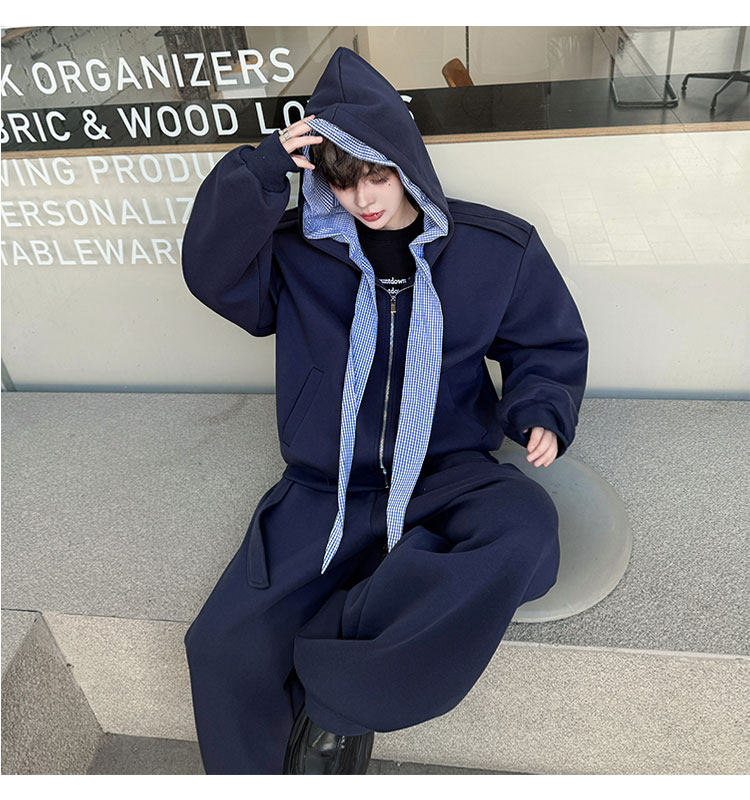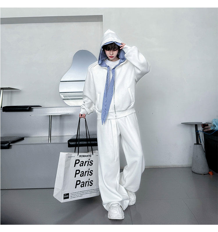 Autumn Niche Plaid Color-Blocked Hooded Cardigan Sweatshirt Set for Men Paired with Wide-Leg Trousers, a High-End Look Set