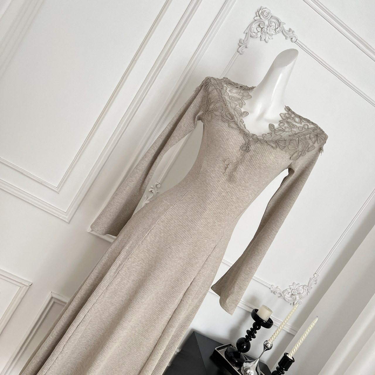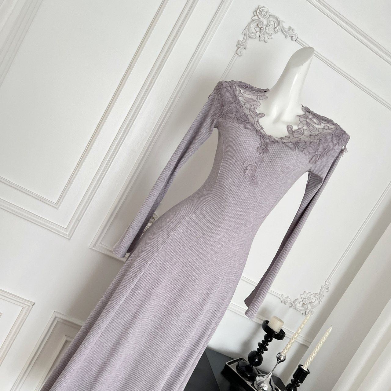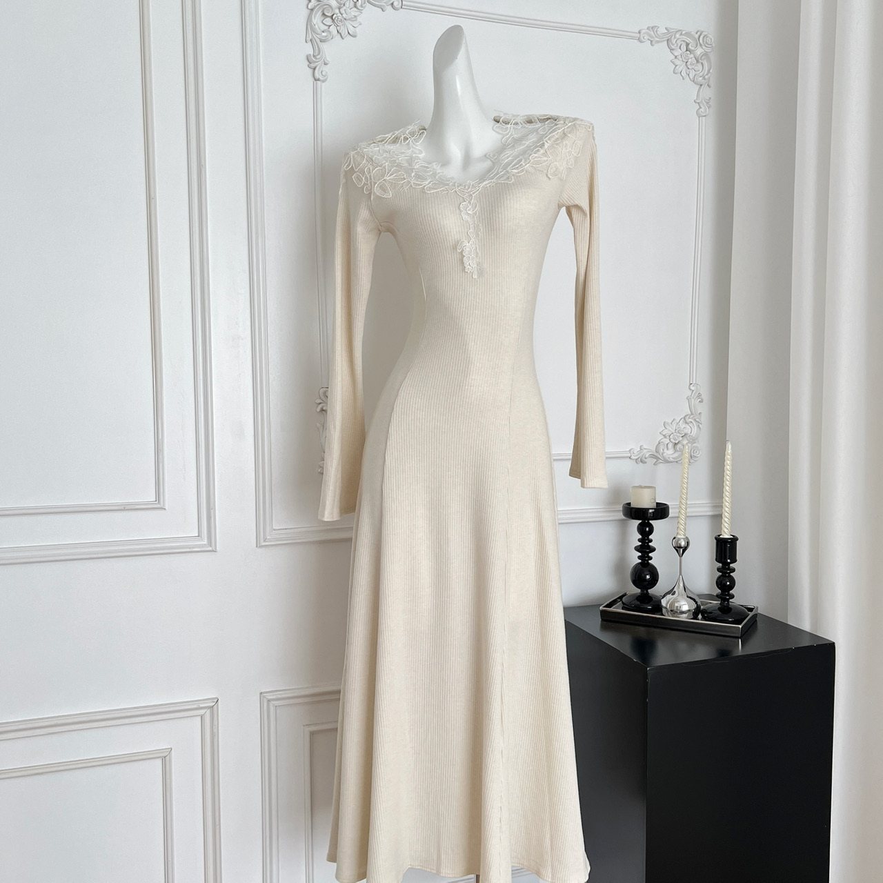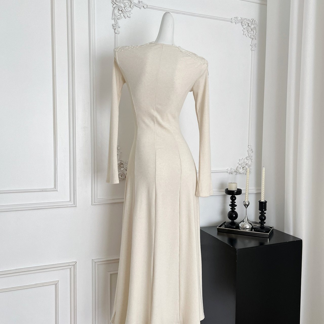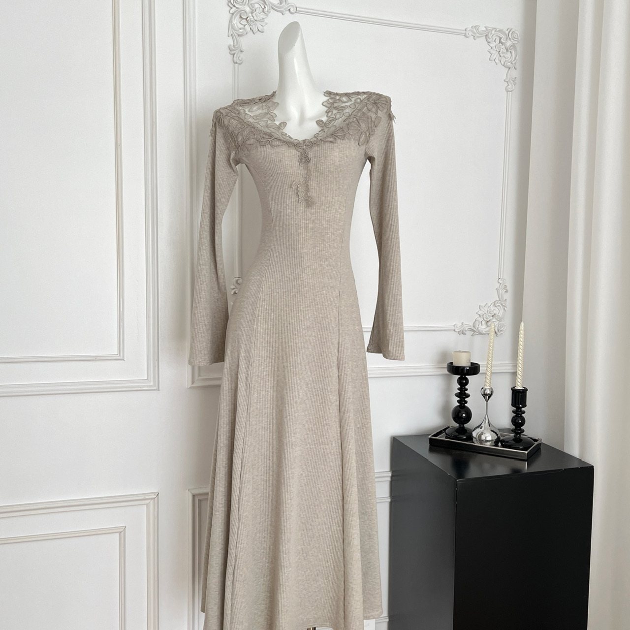 Peach LAOSHU Snowy and Gentle Atmosphere Lace V-Neck Knitted Dress with Waist-Cinching, Slimming A-Line Long Skirt
