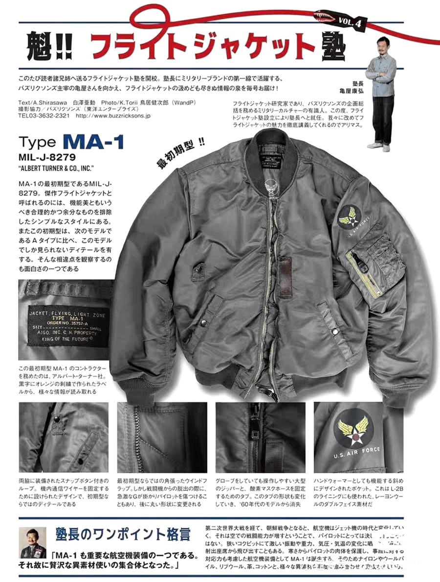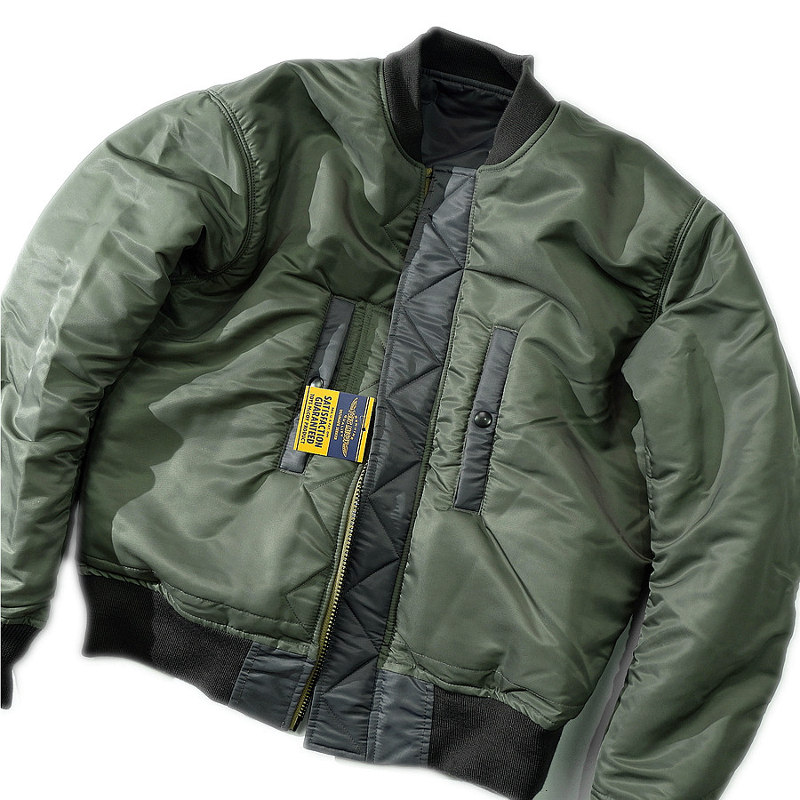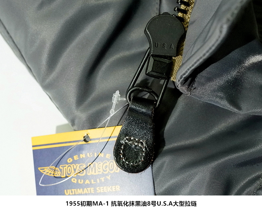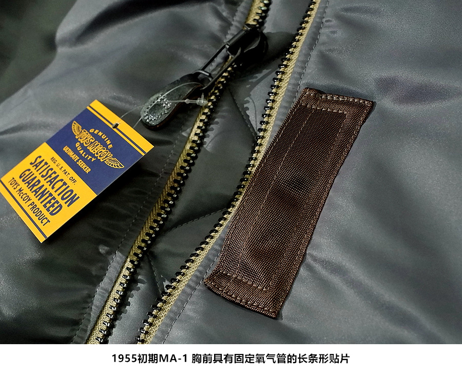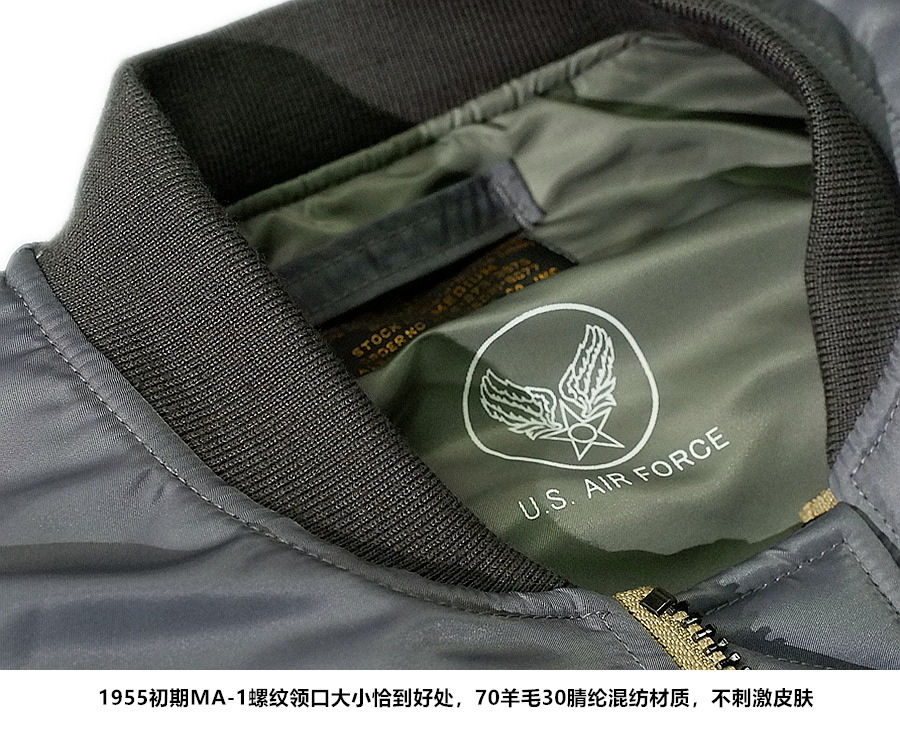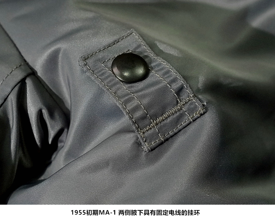 1ST MA-1 1955MODEL(SPEC:MIL-J-8279)二战期间,美军已经意识到了尼龙夹克的意义,但是战时的尼龙是新型材料,产量不大价格昂贵,所以并未得到广泛应用。二战过后,从B-15(确切的说是B-15B)系列开始正式使用尼龙材质取代棉布材质,战后初期的B-15系列还是保留了B-10形状的大毛领,但是飞行员们发现,剪绒毛领虽暖和,但它有时会妨碍飞行员伞具的携带和使用(这是要命的)。而且二战后,随着进入喷气式时代,完全不同于二战时期皮革飞行帽的硬式飞行头盔开始广泛装备部队,飞行员发现剪绒毛衣领也不能很好地配合新式头盔。美国国防部便取消了毛领的设定,改用短矮的螺纹衣领,B-15(MODIFIED)系列便是修订后的无毛领夹克,作为B-15系列的最后一代B-15D,从外观到细节设定基本都与初版的MA-1无异,1955年初代MA-1正式发布,规格为SPEC:MIL-J-8279。