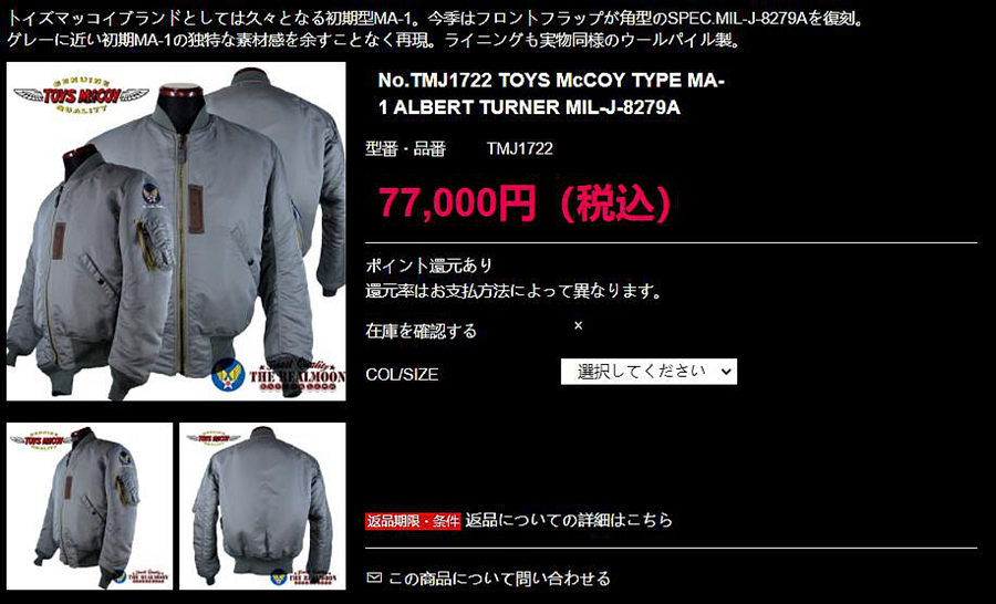 TOYS McCOY MA-1MIL-J-8279A ナイロン フライトジャケット ALBERT TURNER (TMJ1832) 価格 : 税込77,000円