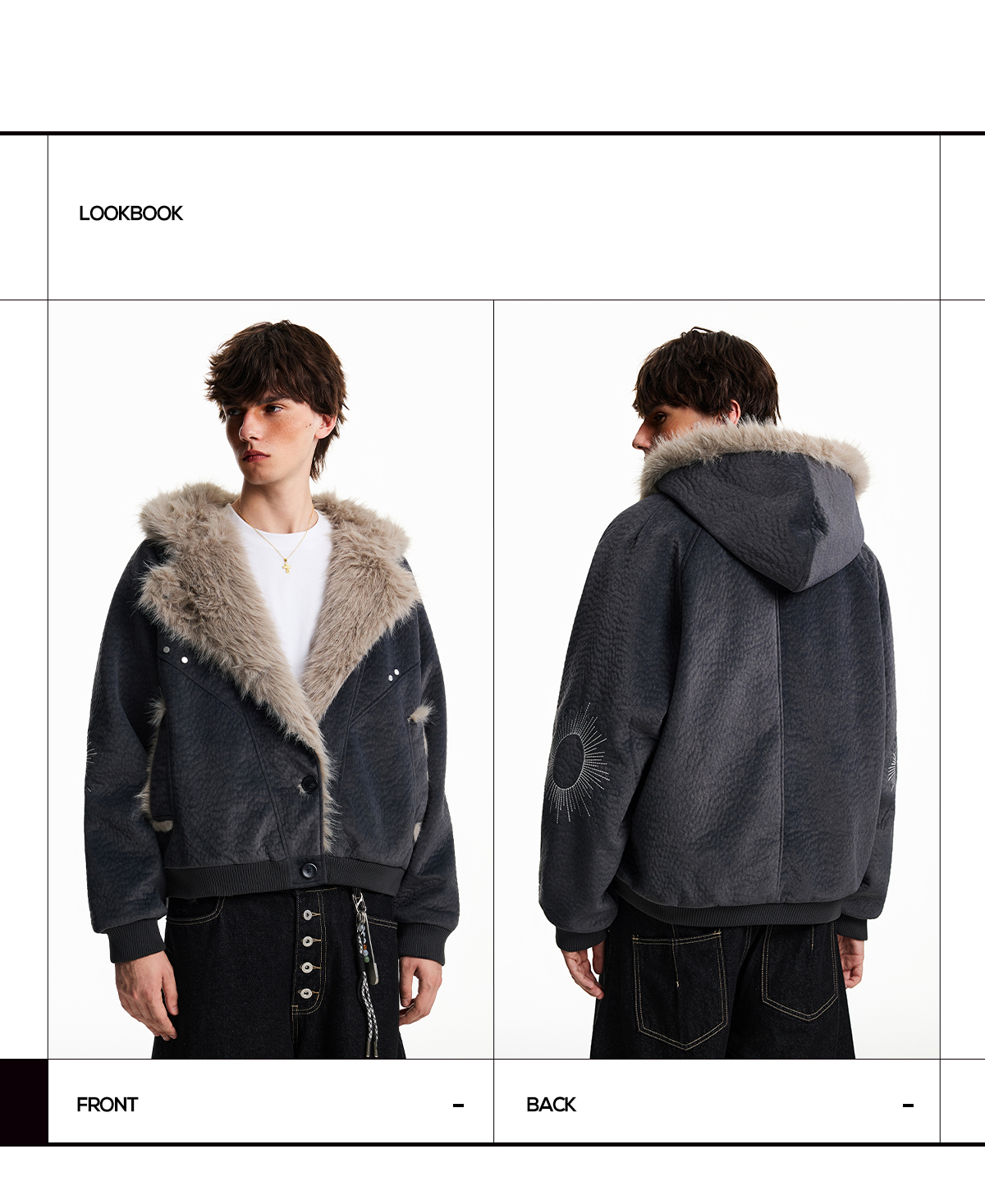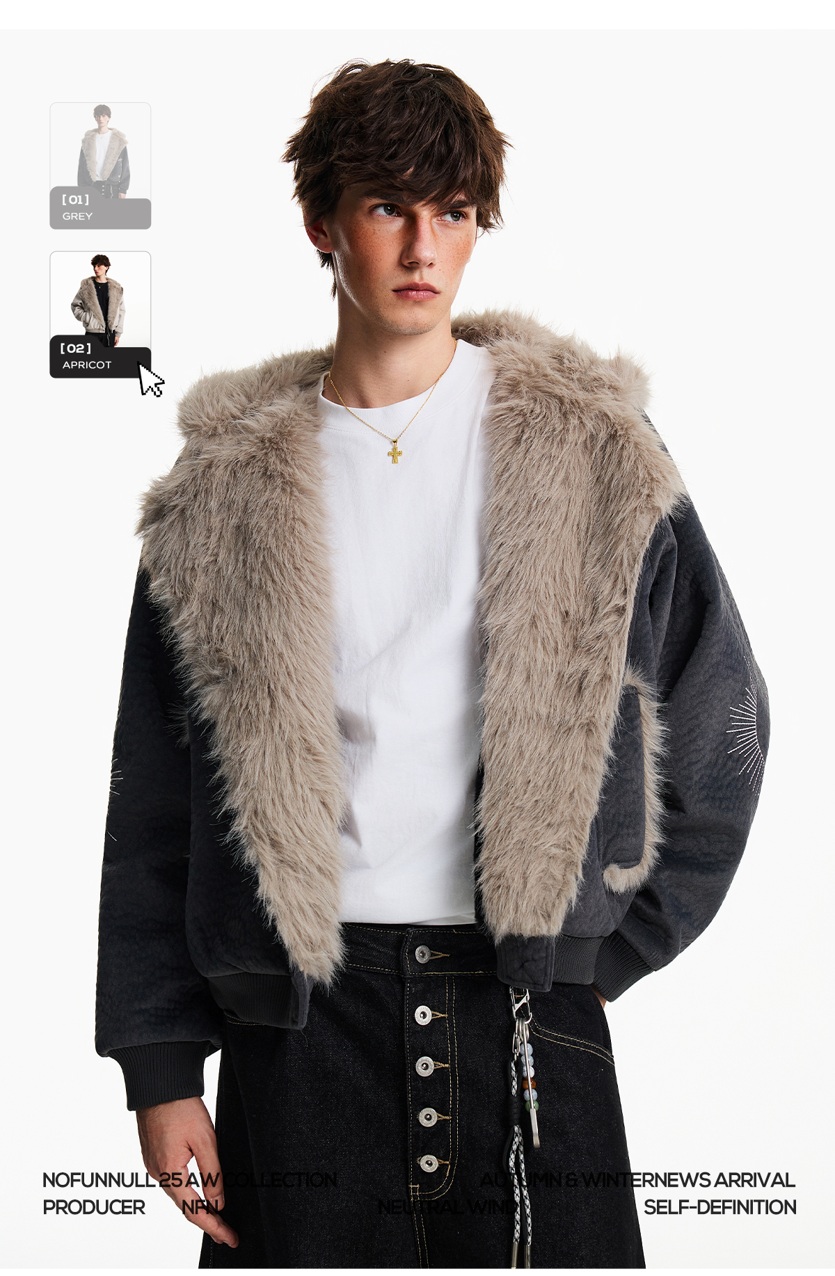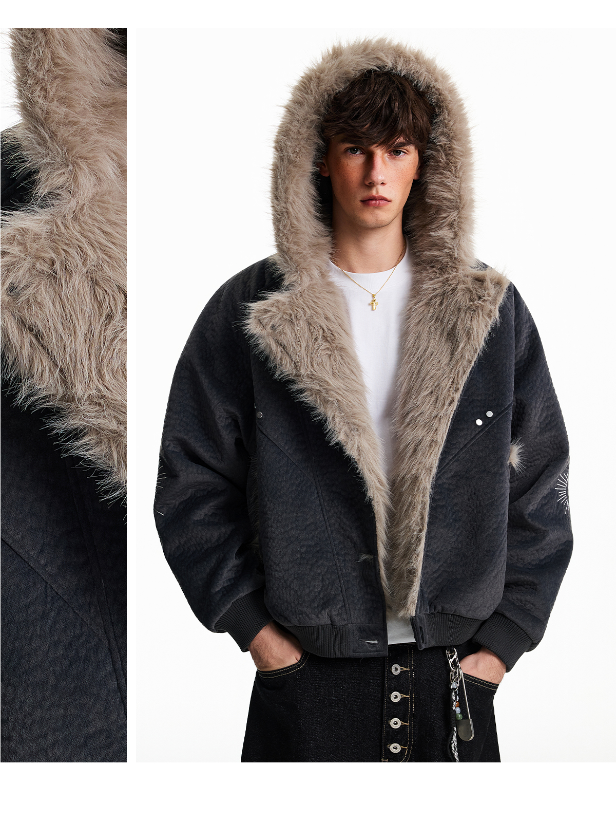 700g imitation rabbit hair Heavy weight cloud velvet short wide mountain carving cotton-padded jacket men's Fall and winter Fleece-lined thickened Embroider hooded Outwear