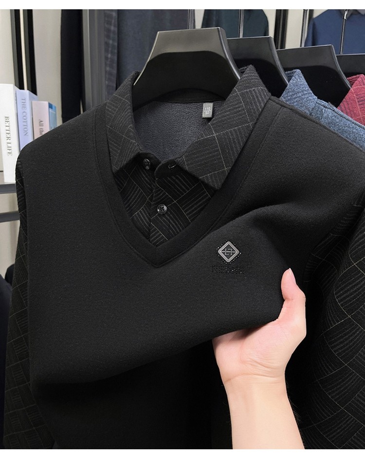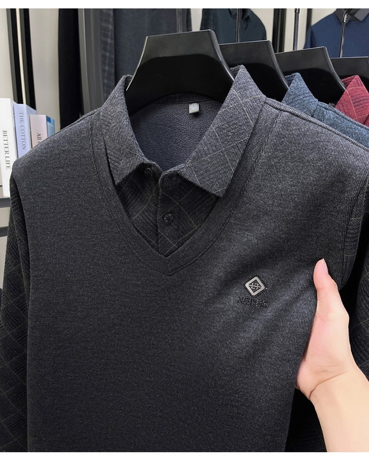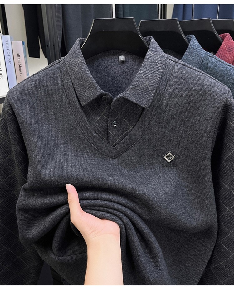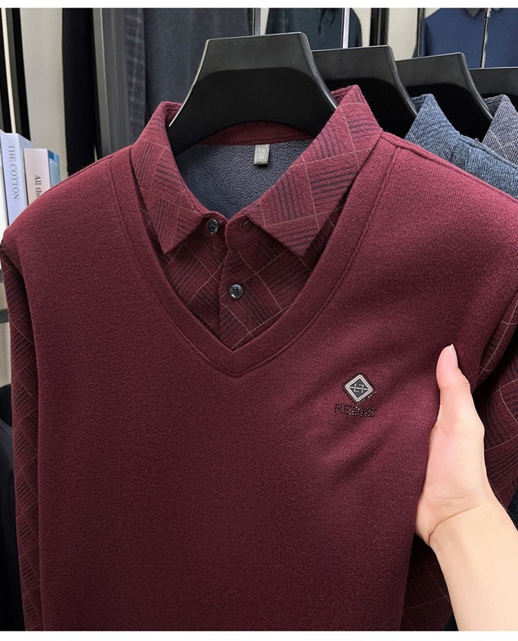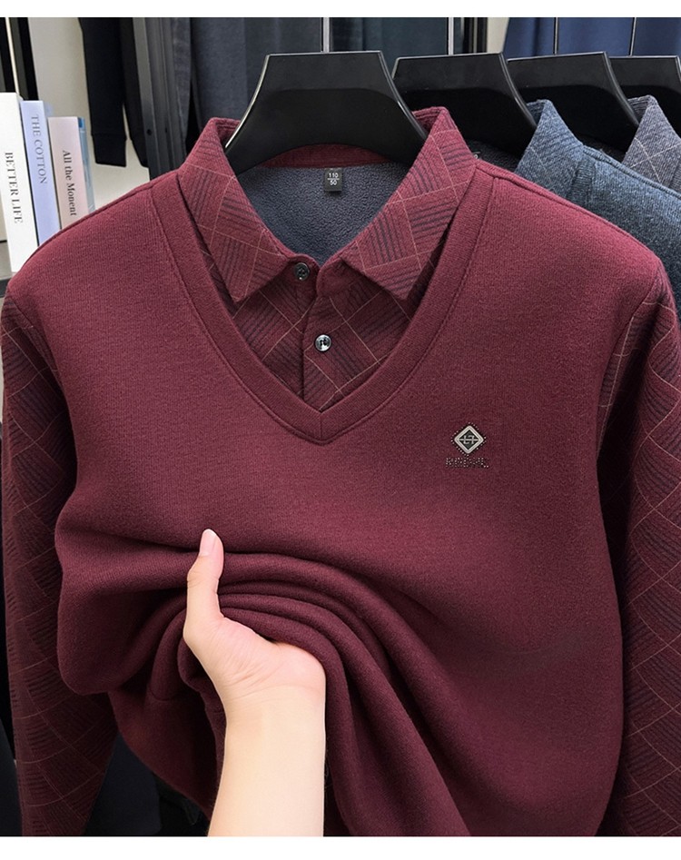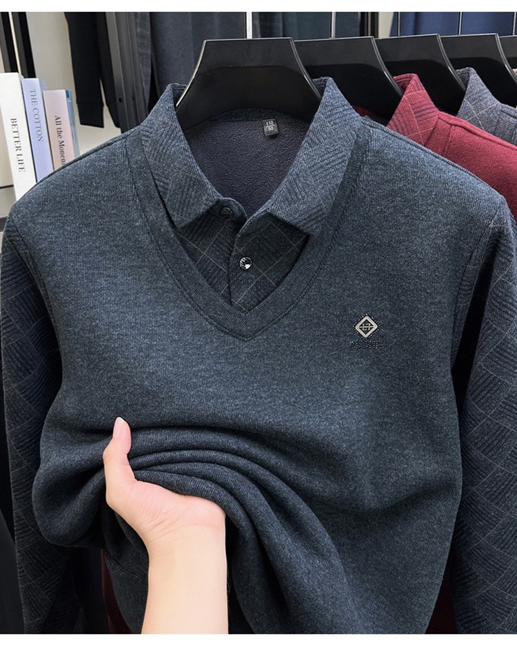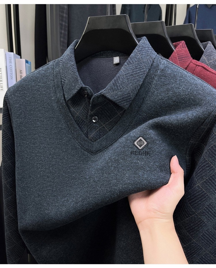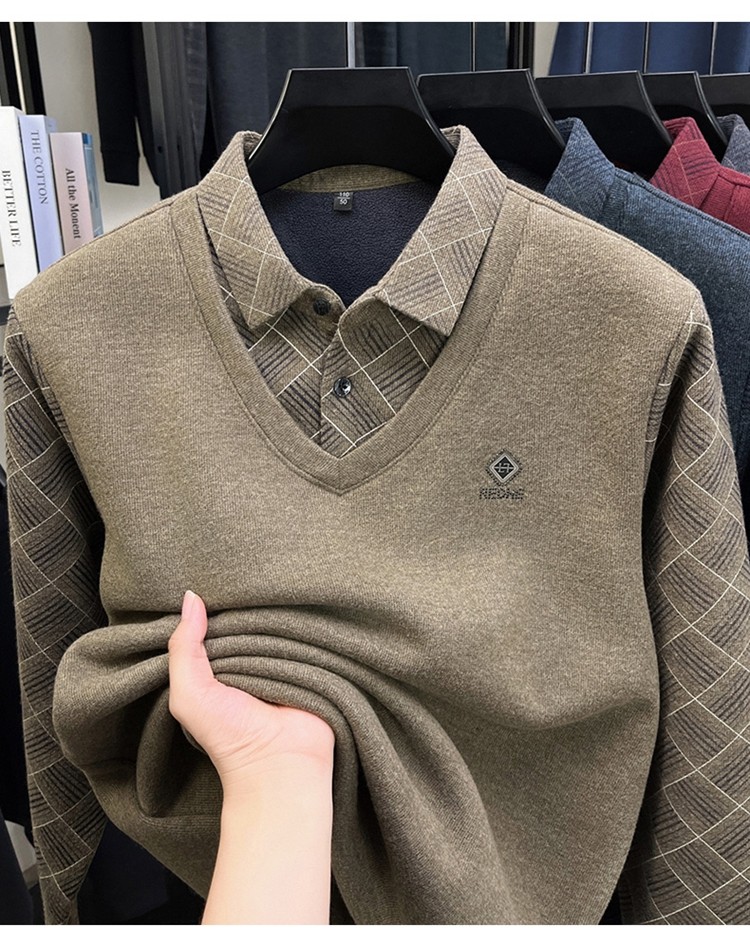 Hengyuanxiang Middle-Aged Men's Wool Sweater, Dad's Style, Fleece-Lined, Thickened, Warm, Faux Two-Piece Shirt Collar Base Layer Sweater