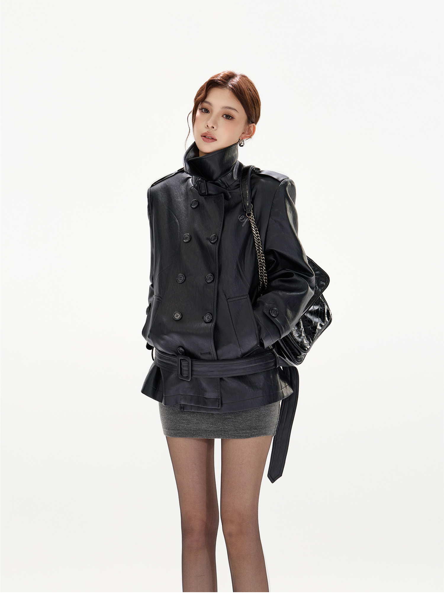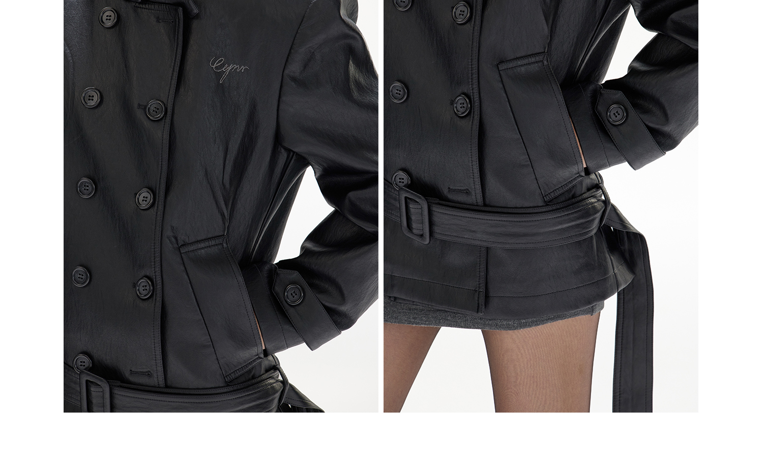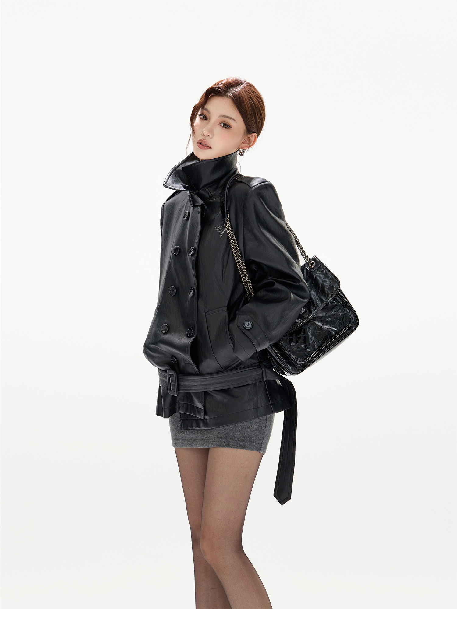 CYNR original design cool style stand collar double-breasted straightened leather Shoelace waist Mid Length Long Length jacket Outwear women