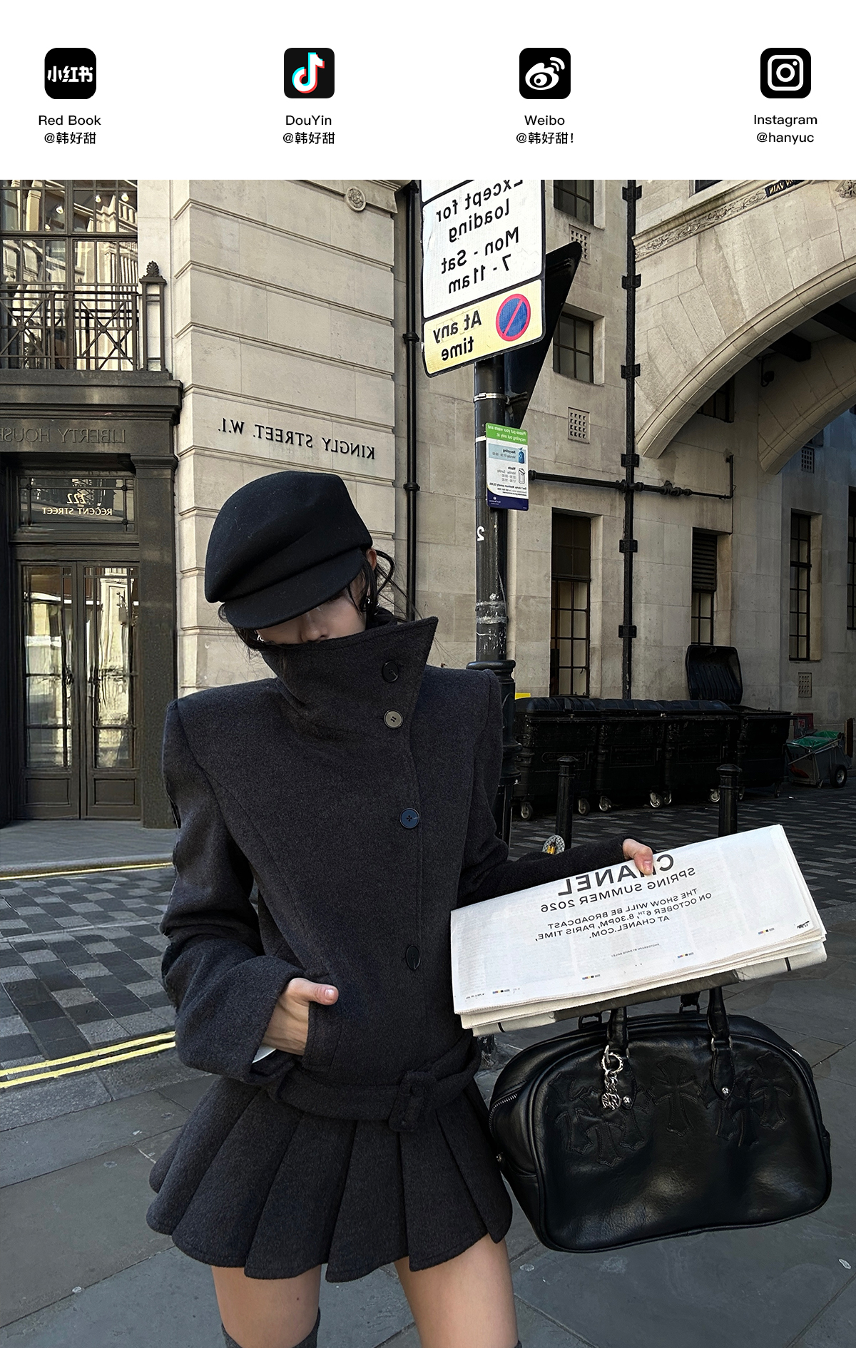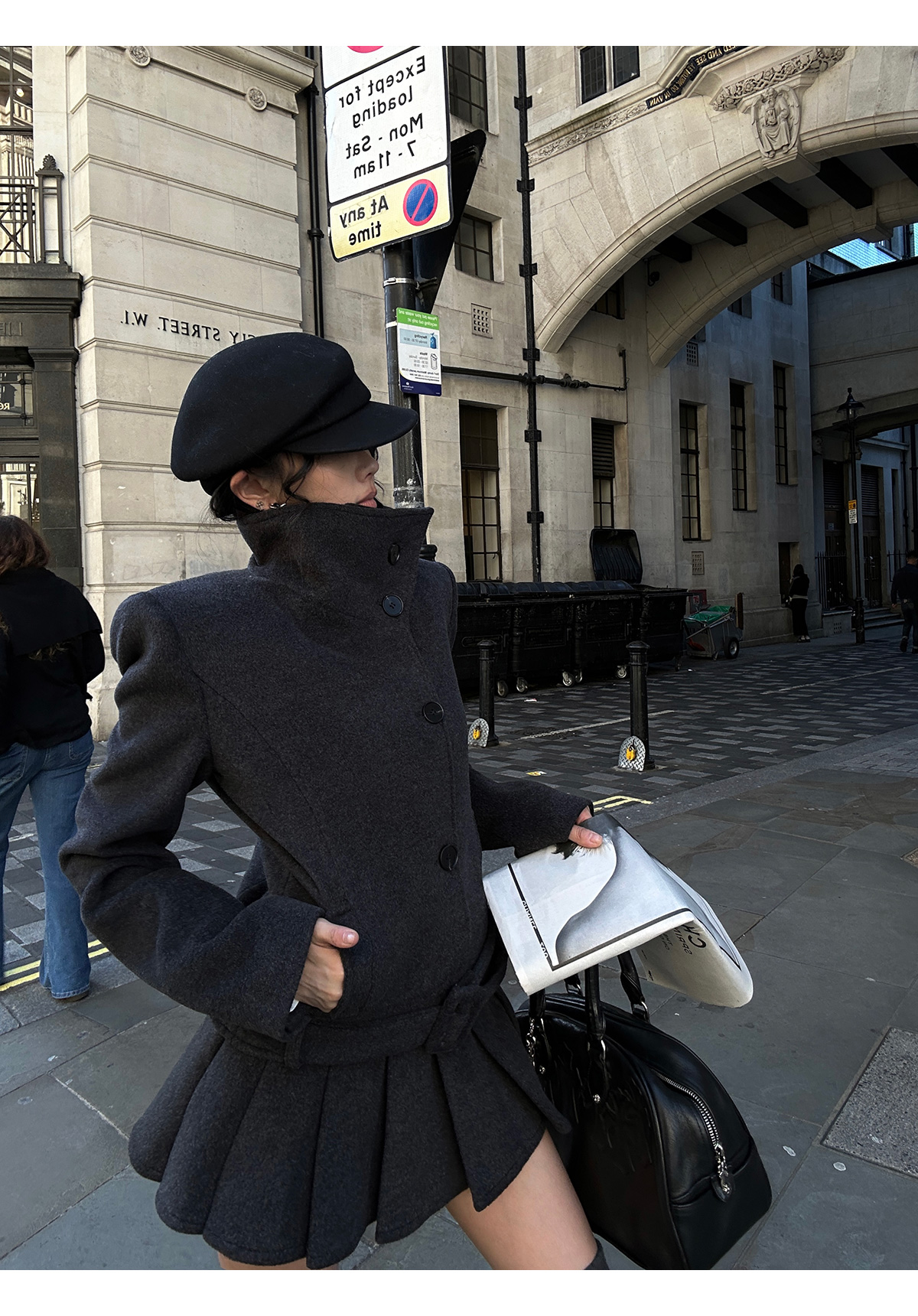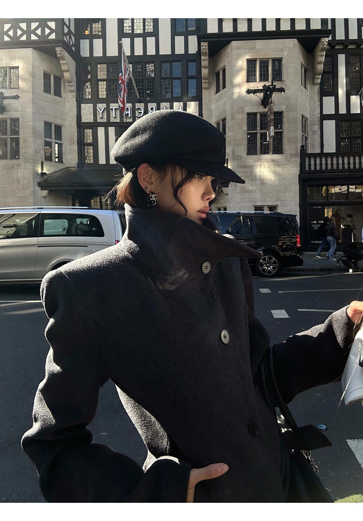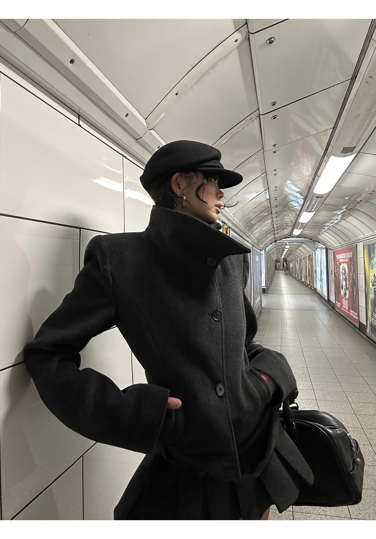 Hanhaotian Warden Edge Gray Turtleneck Woolen Coat for Women, Winter Slim Fit Thickened Short Coat for Petite Figures