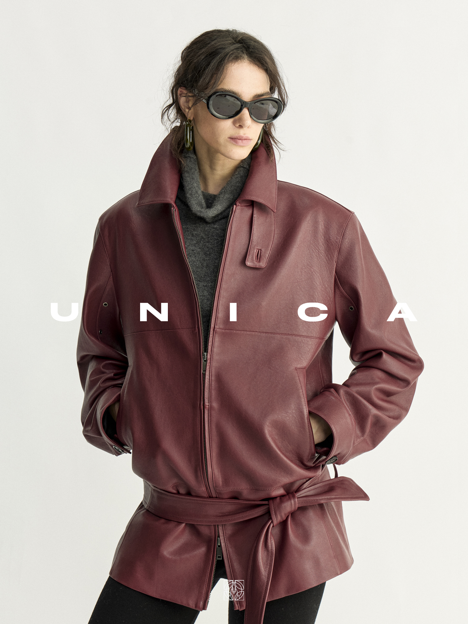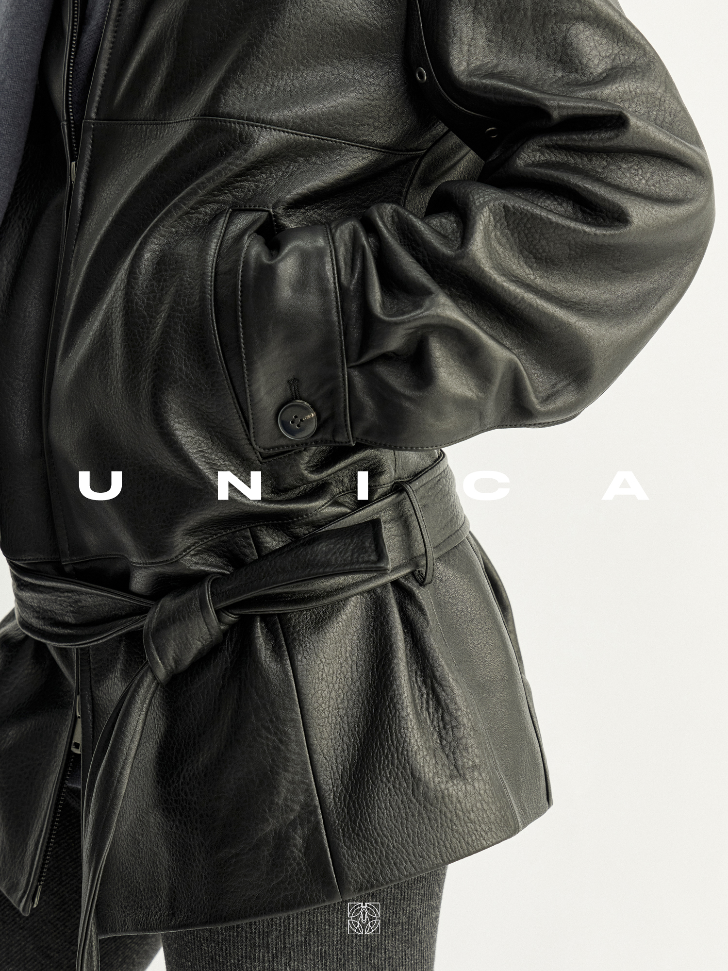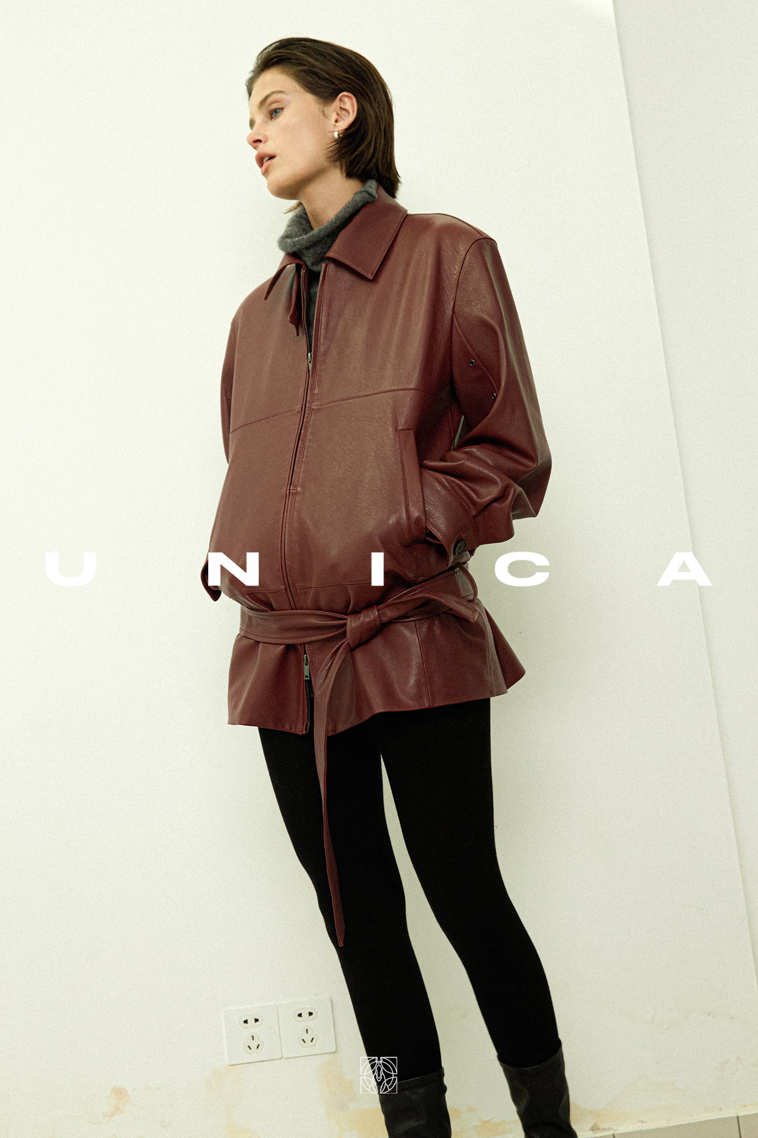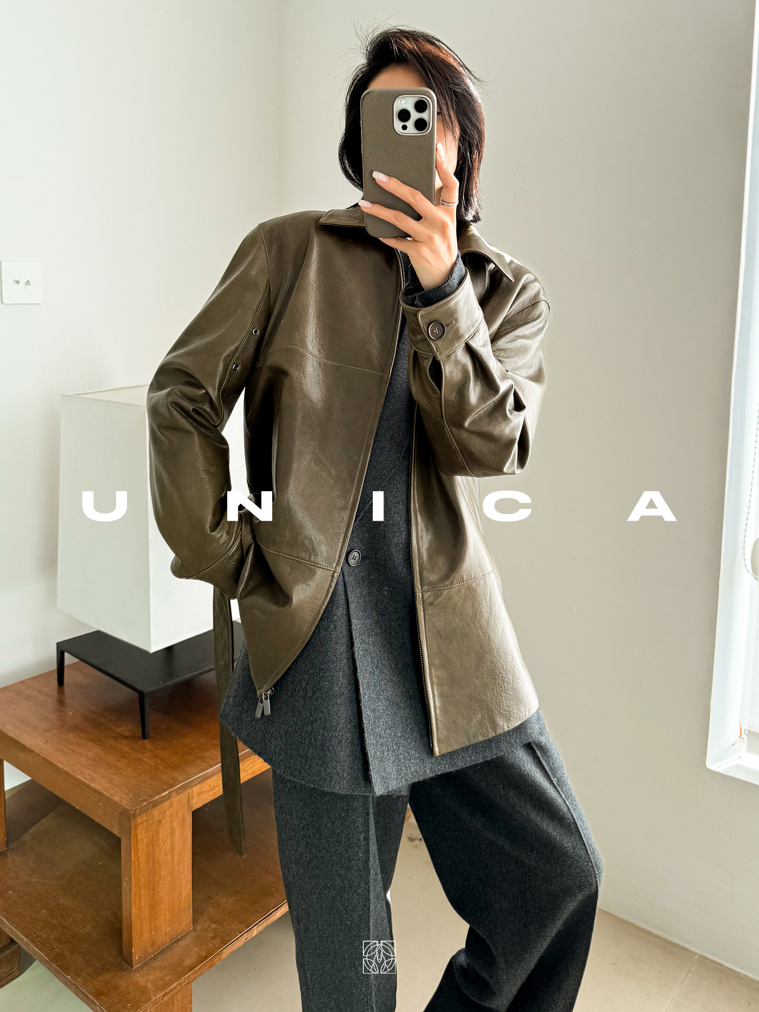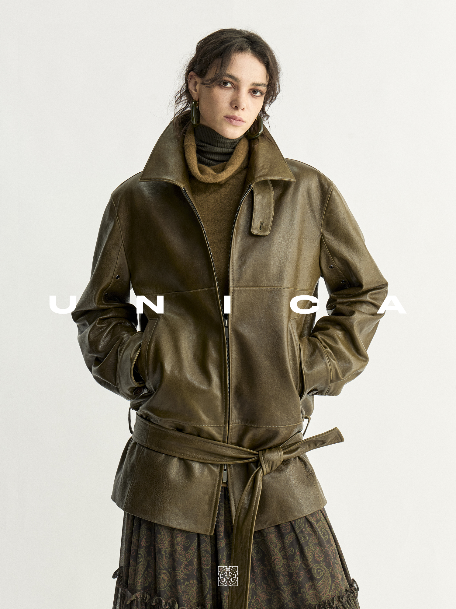 Unica/Ys*L Retro Wide-Shoulder Two-Way Collar Low-Waist Belt European Imported Uncoated Leather Jacket