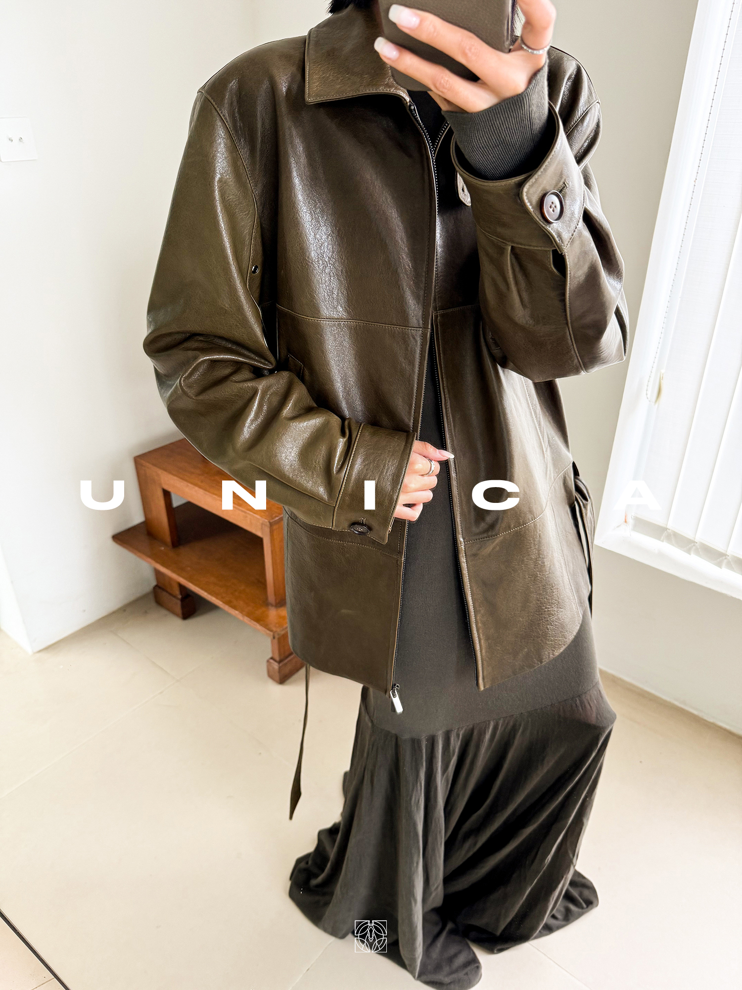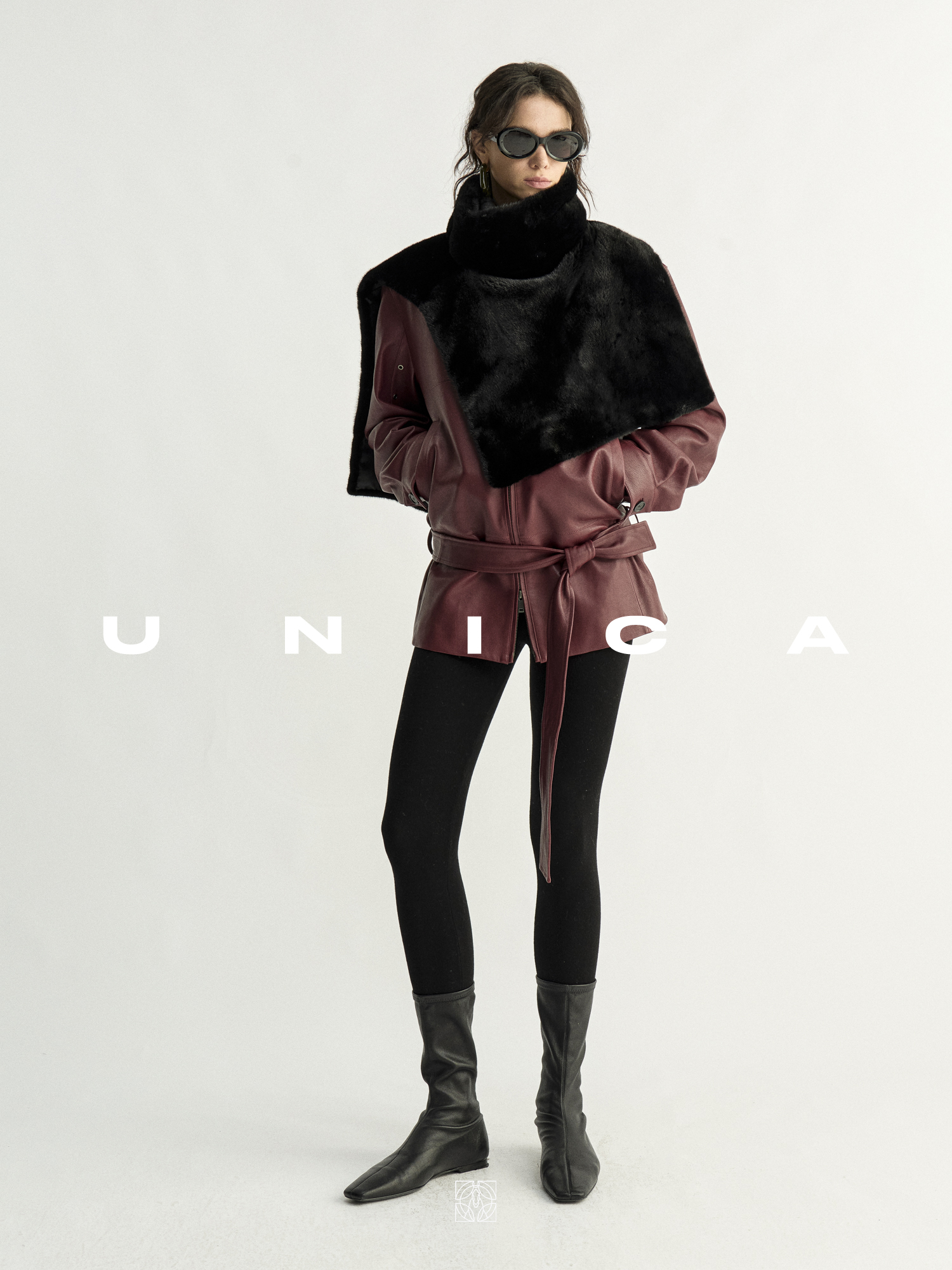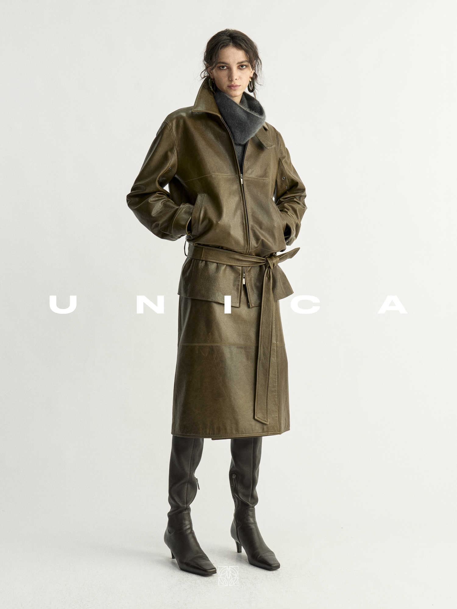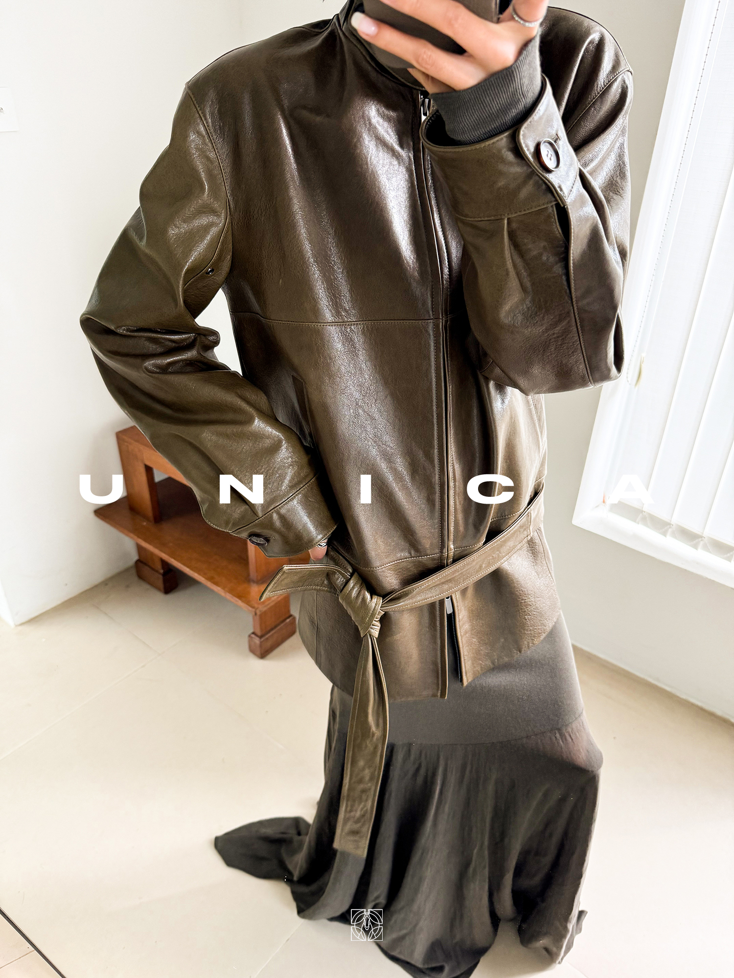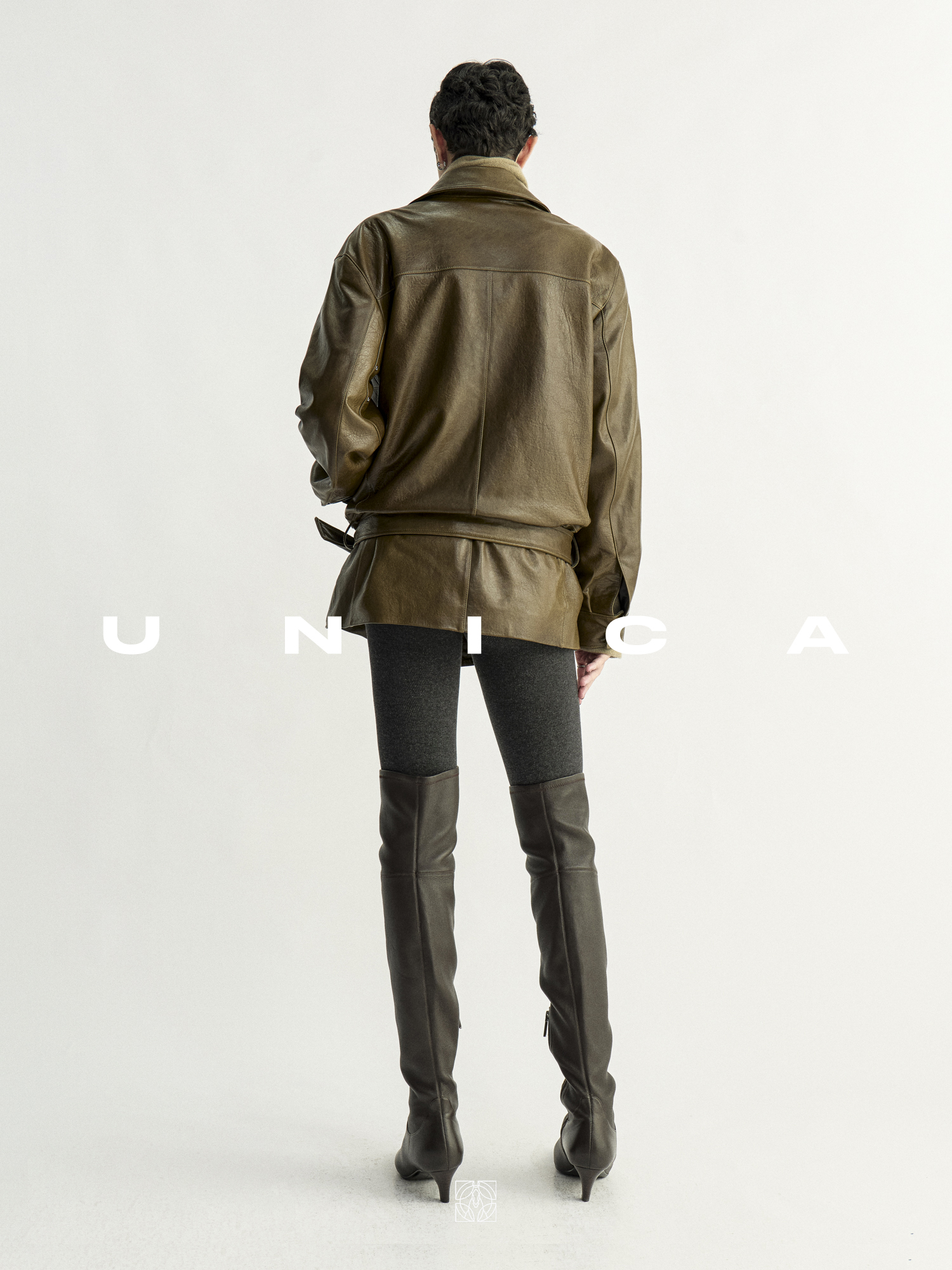 Unica/Ys*L Retro Wide-Shoulder Two-Way Collar Low-Waist Belt European Imported Uncoated Leather Jacket