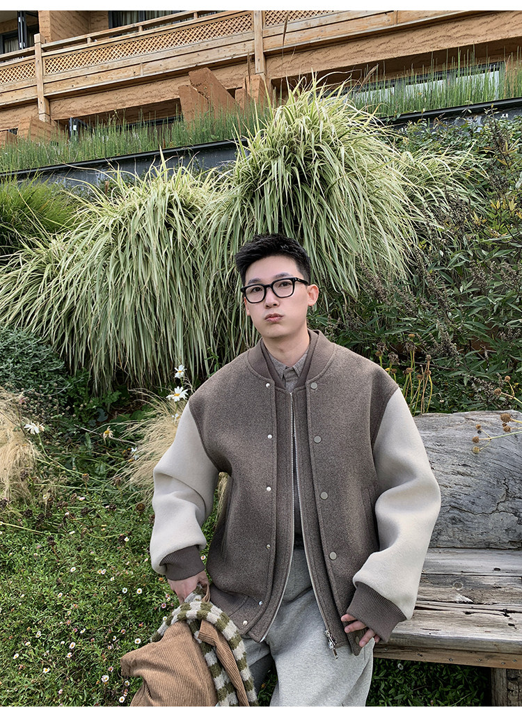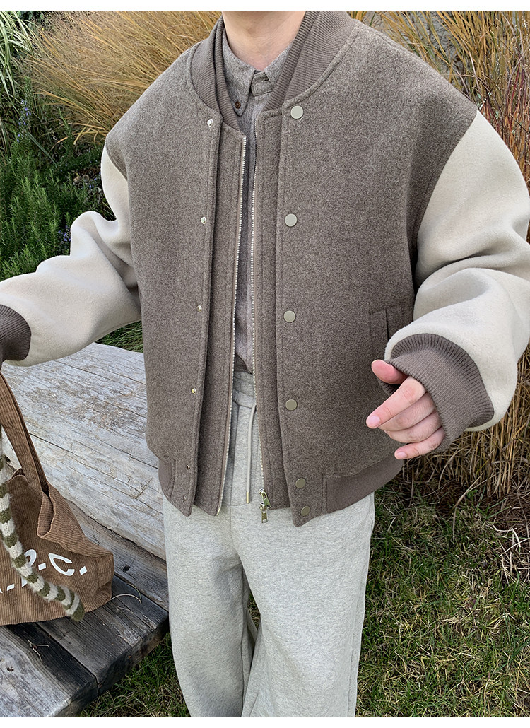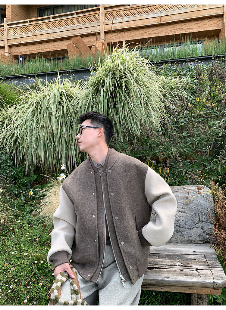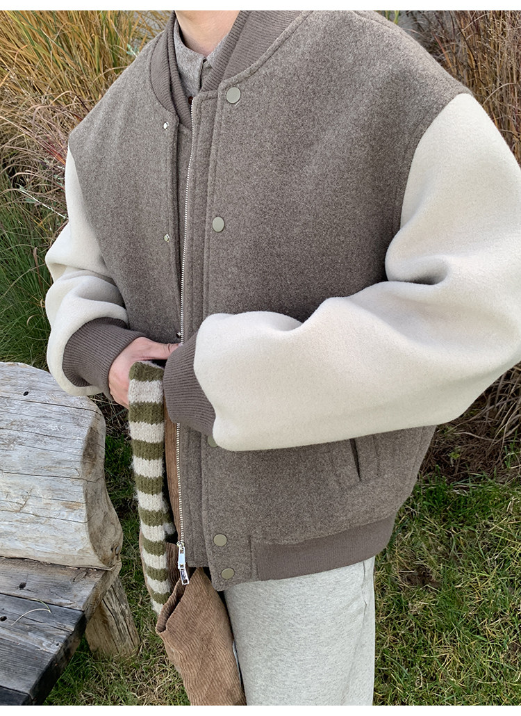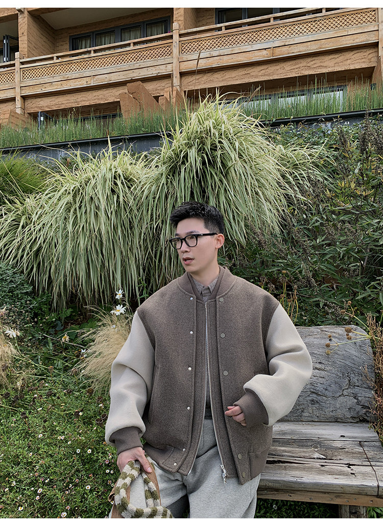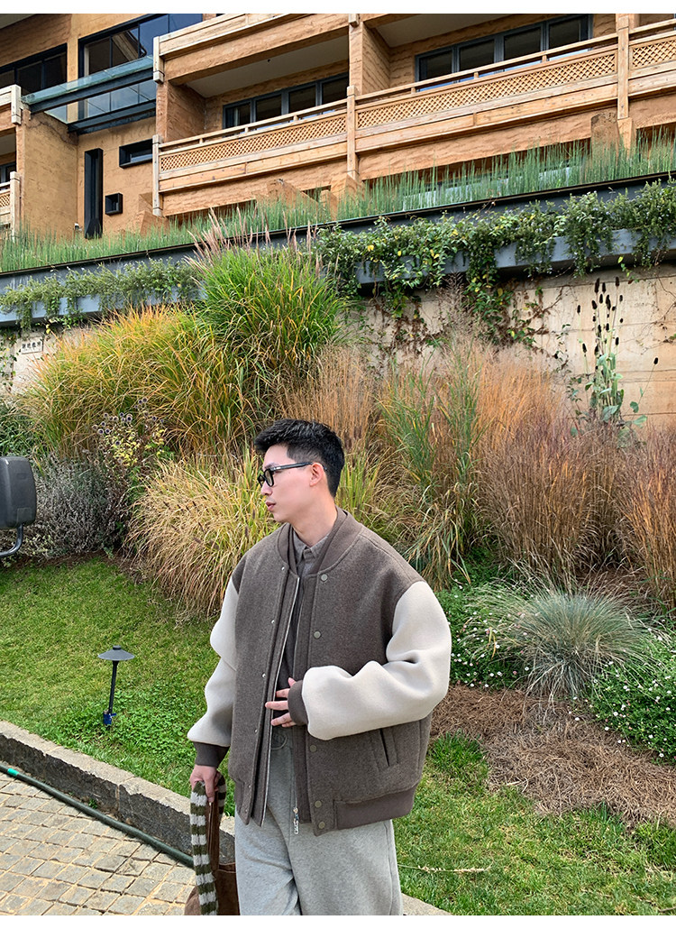 American Retro 100 High-Count Wool Patchwork Color-Block Thickened Baseball Jacket for Men, Autumn and Winter Warm Casual Coat