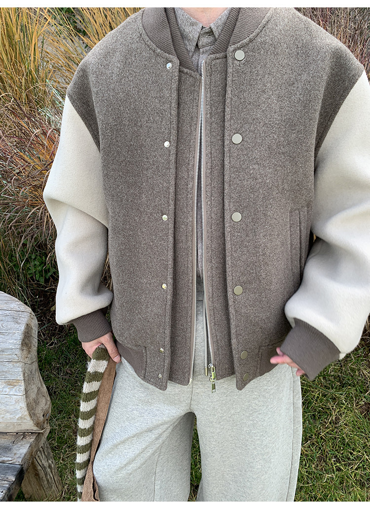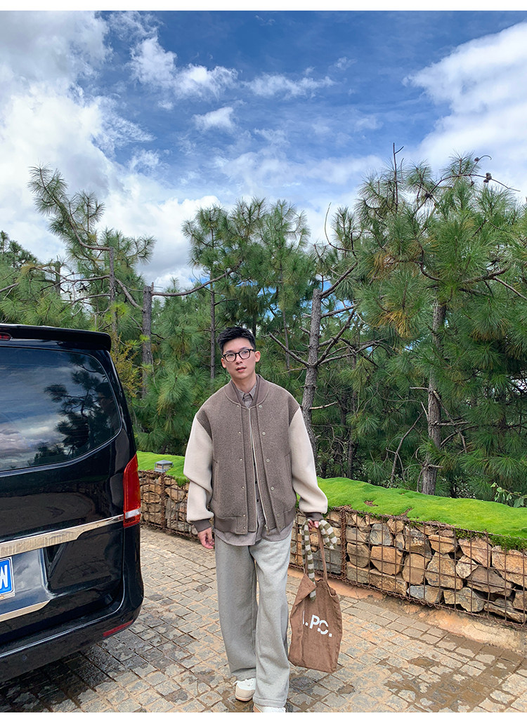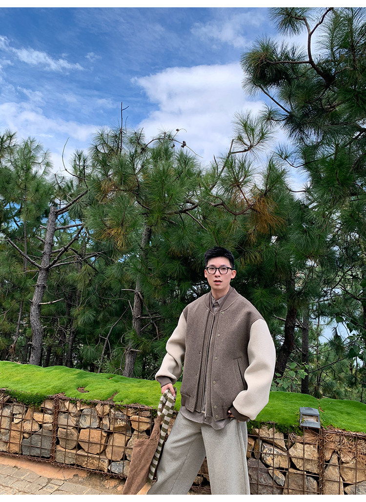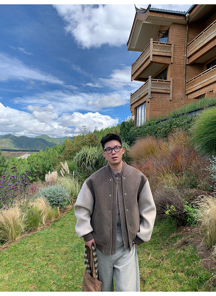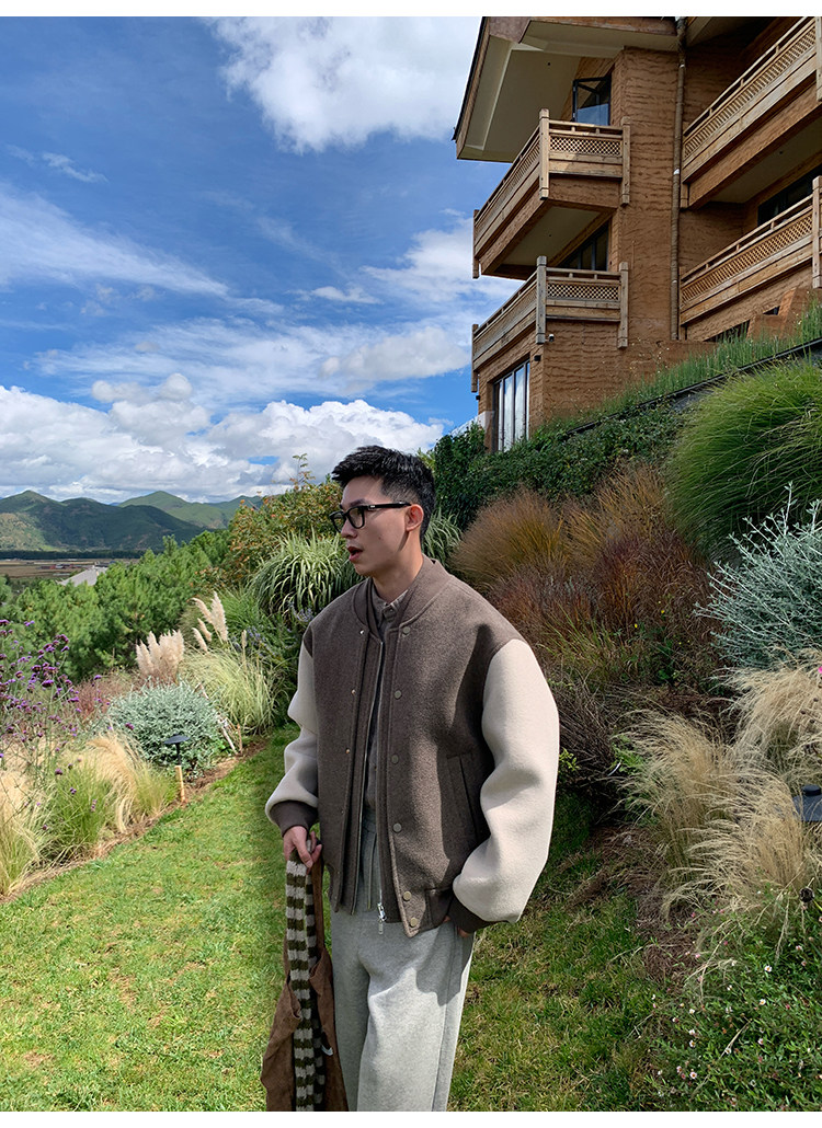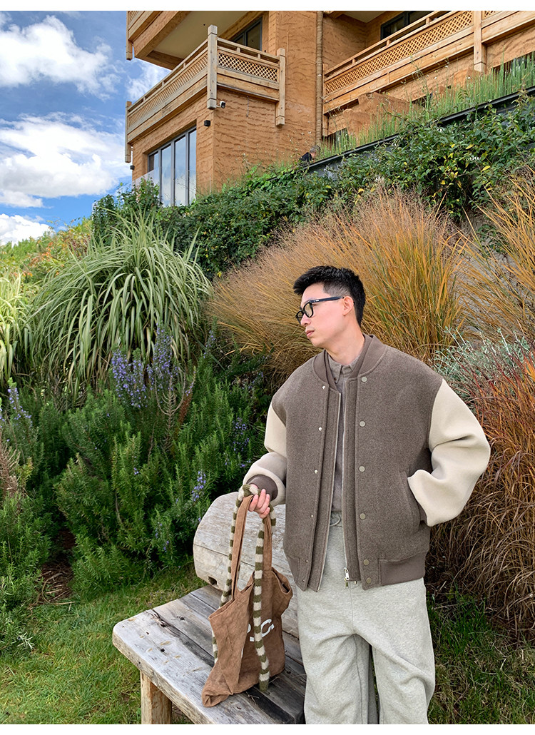 American Retro 100 High-Count Wool Patchwork Color-Block Thickened Baseball Jacket for Men, Autumn and Winter Warm Casual Coat