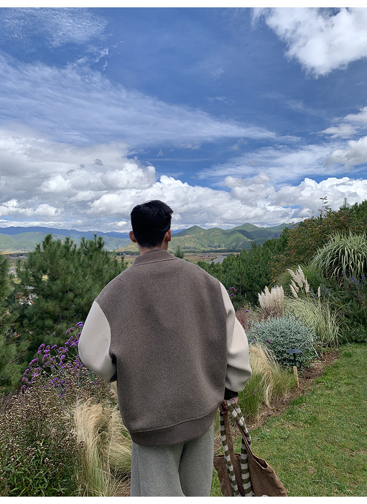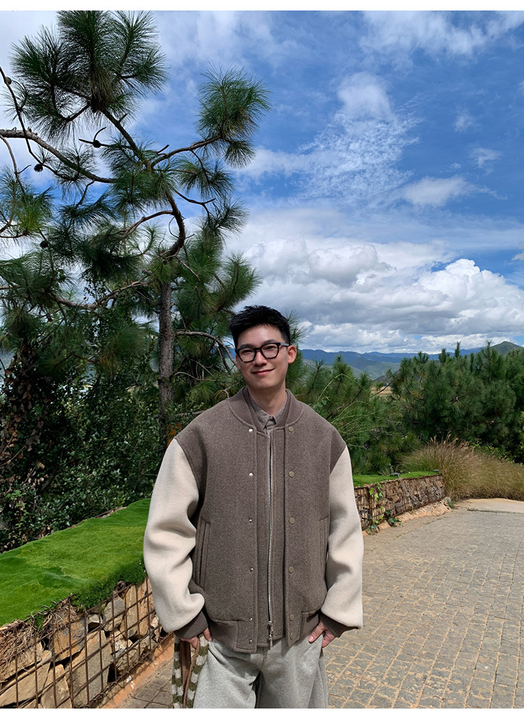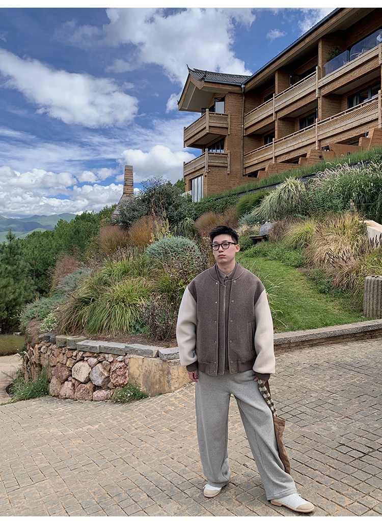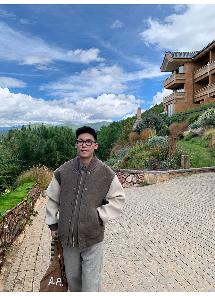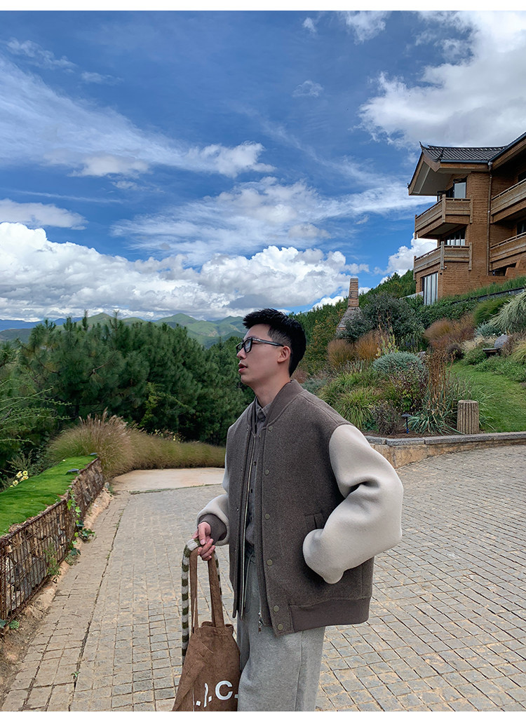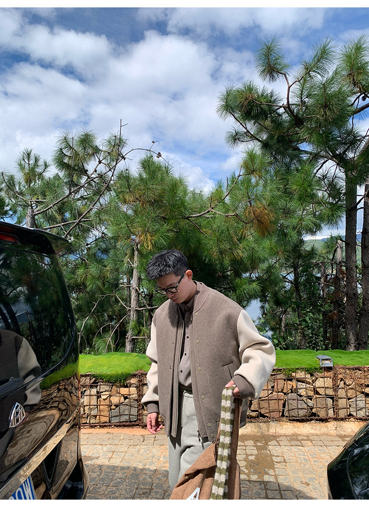 American Retro 100 High-Count Wool Patchwork Color-Block Thickened Baseball Jacket for Men, Autumn and Winter Warm Casual Coat