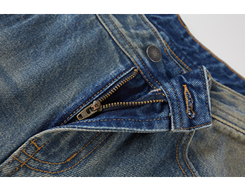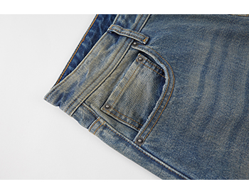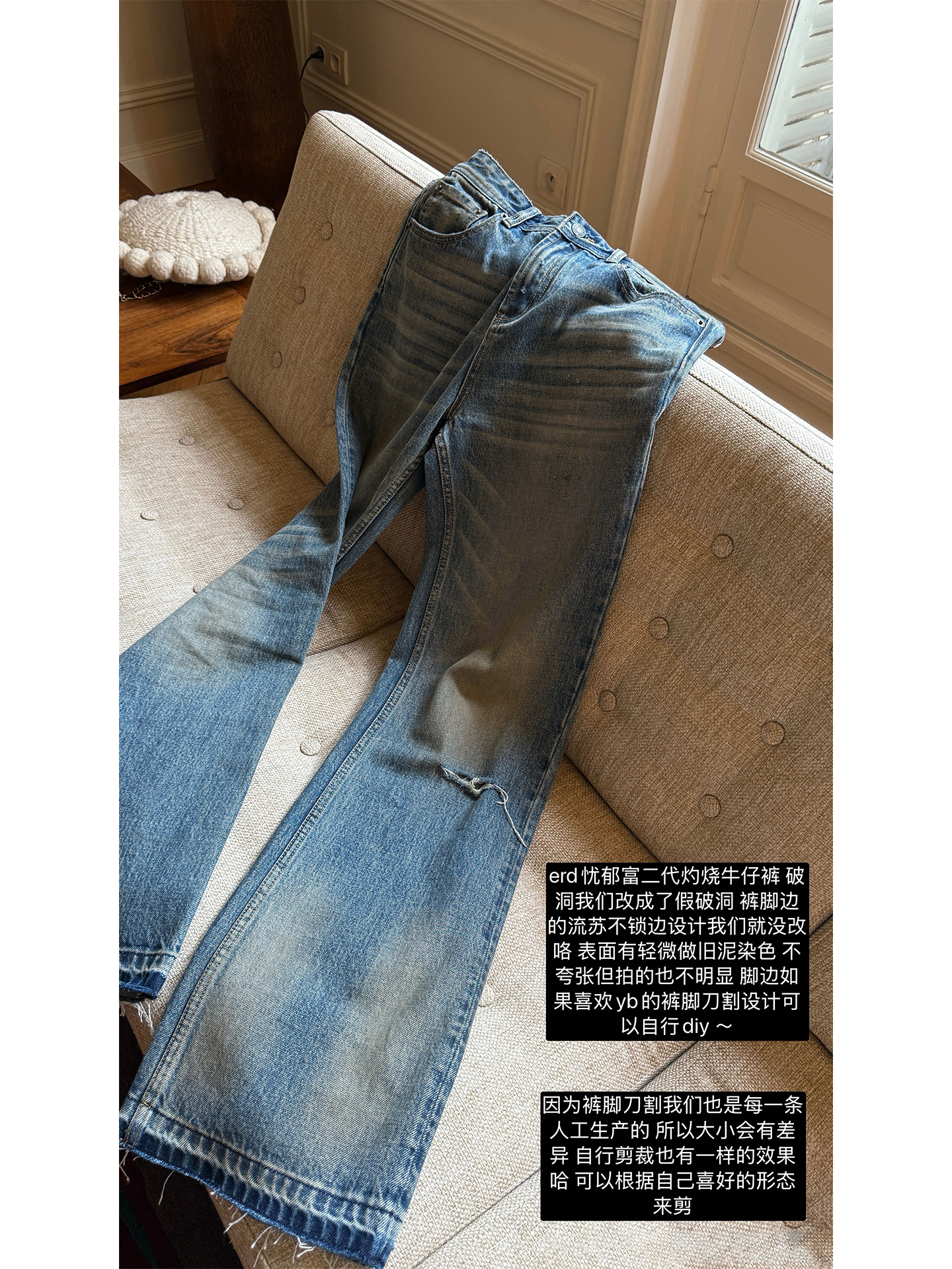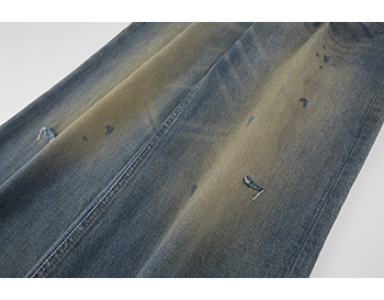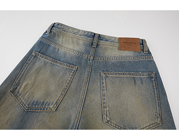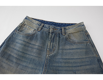 特别的是裤脚边先车缝后进行全部水洗工艺
