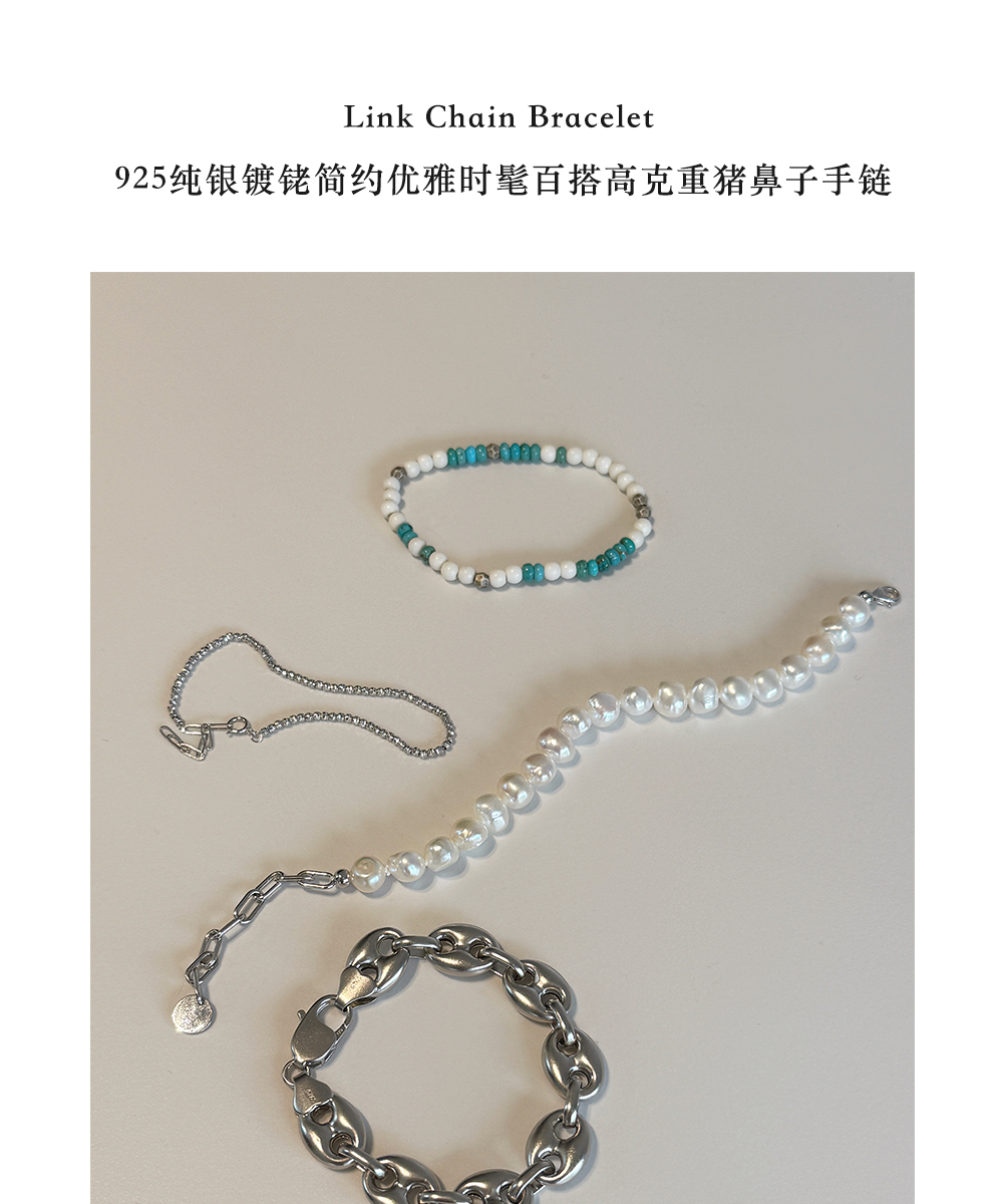 Link Chain Bracelet 925 Sterling Silver Rhodium-Plated Simple, Stylish and Versatile High-Weight Pig Nose Bracelet