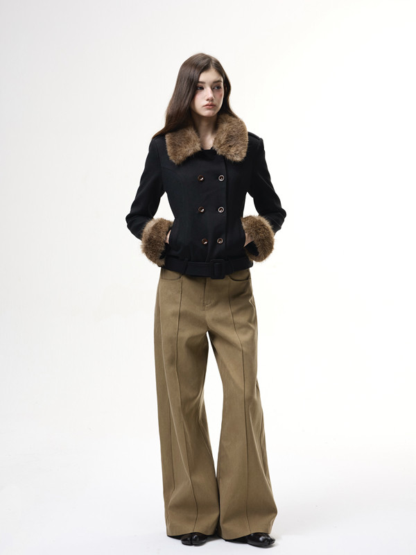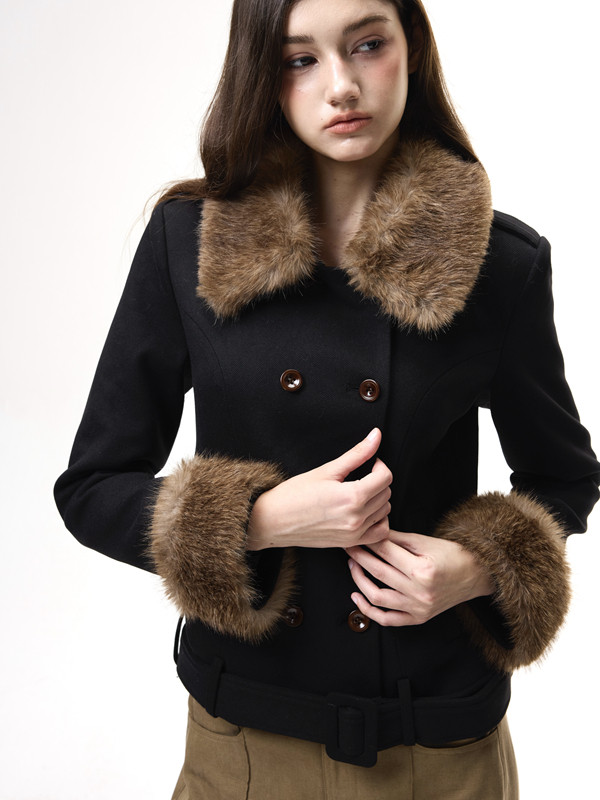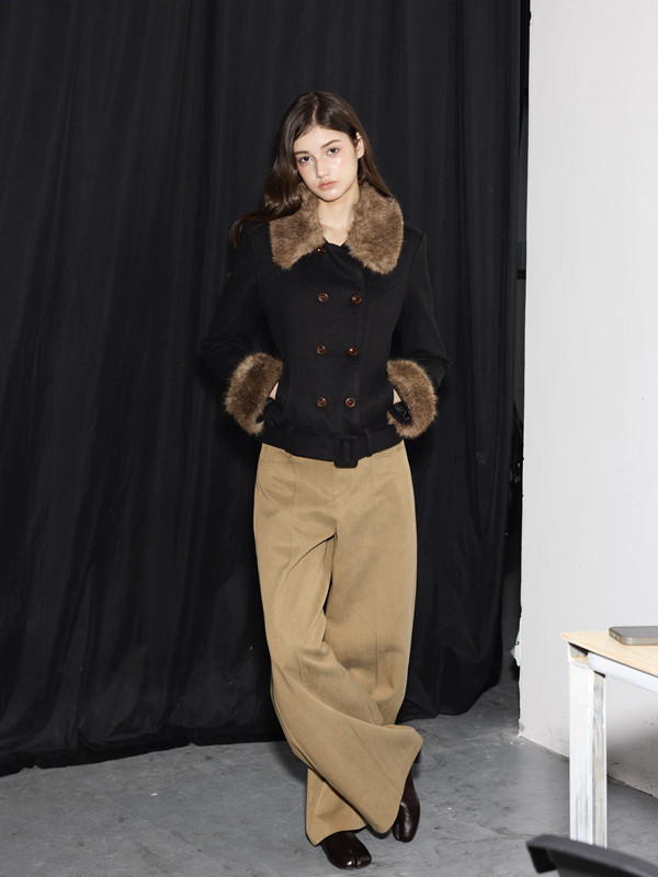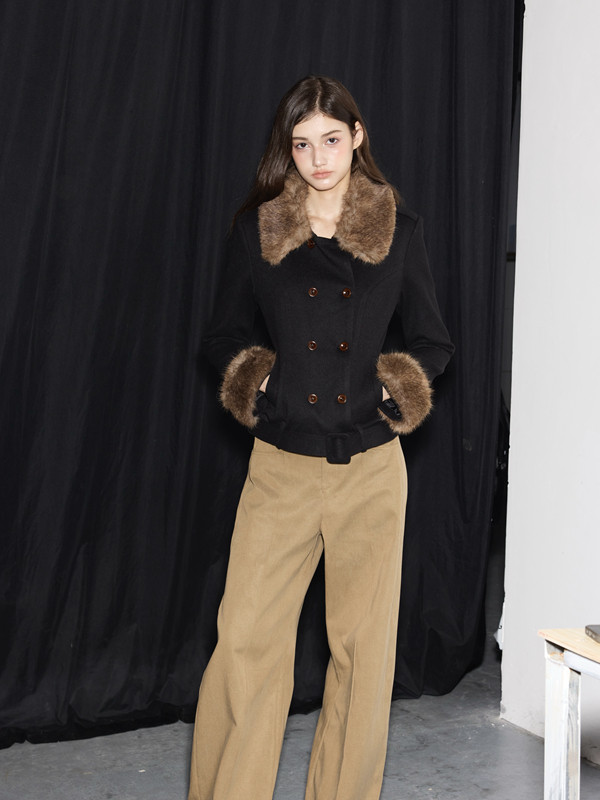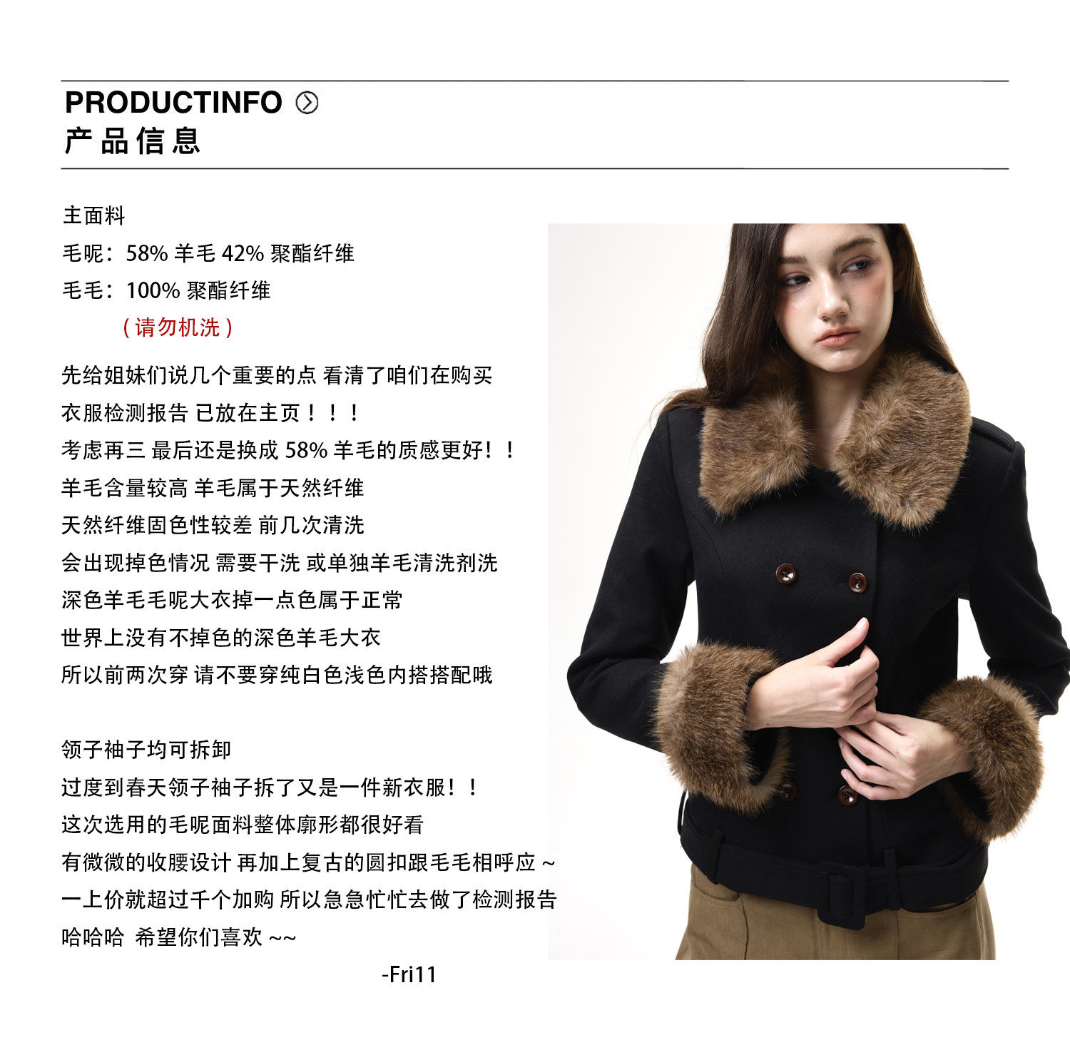 Fri11 58% Wool Vintage Detachable Fur Collar Double-Breasted Waist-Cinching Woolen Coat