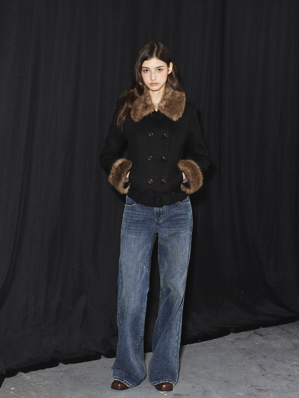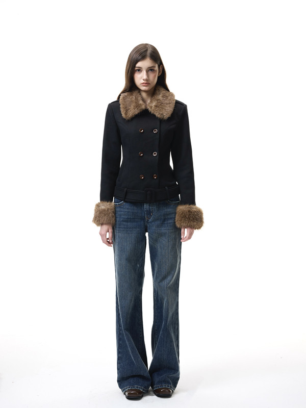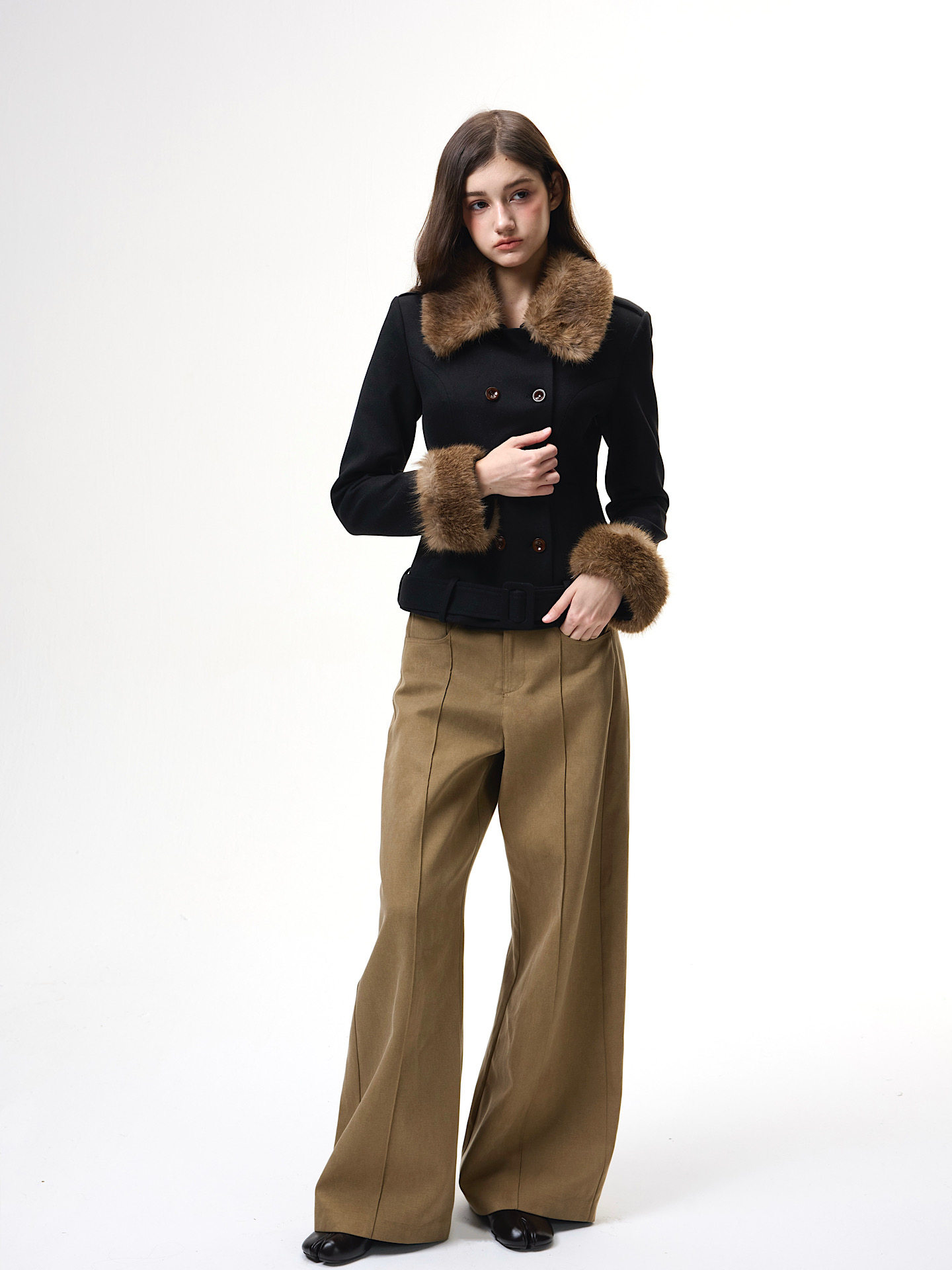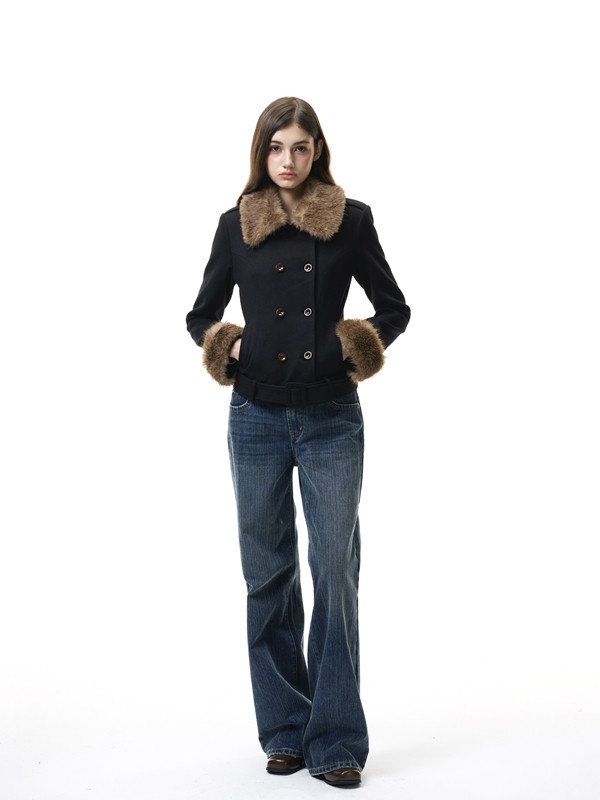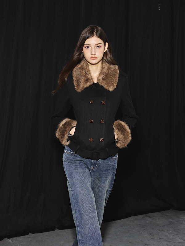 Fri11 58% Wool Vintage Detachable Fur Collar Double-Breasted Waist-Cinching Woolen Coat