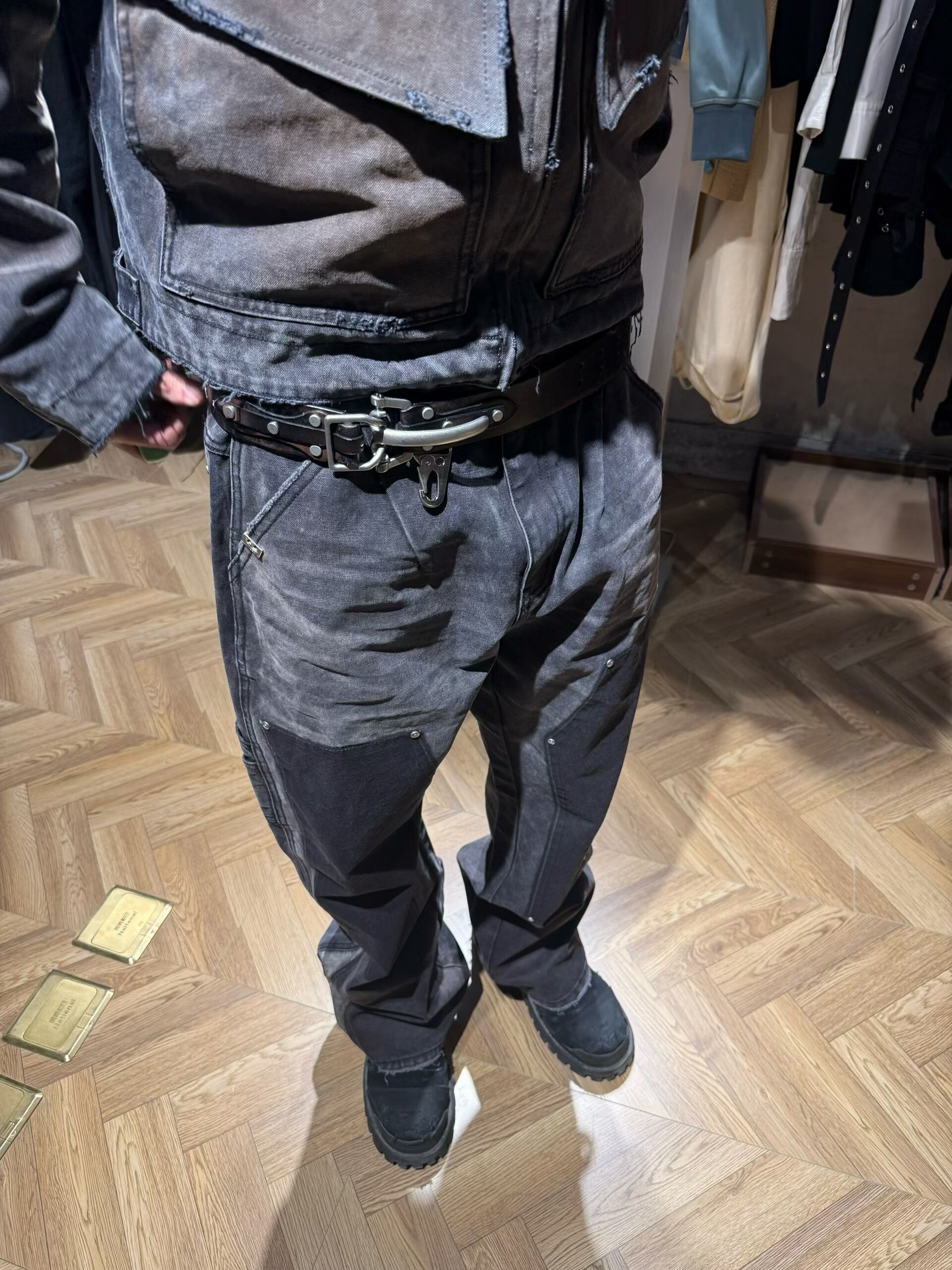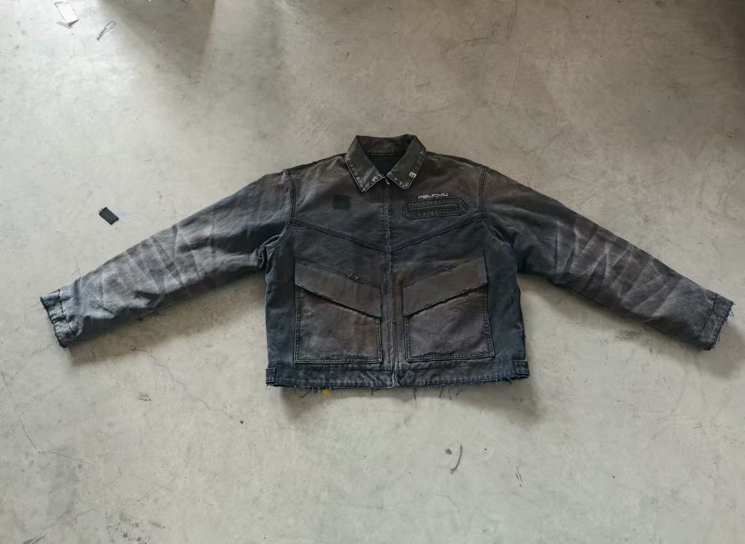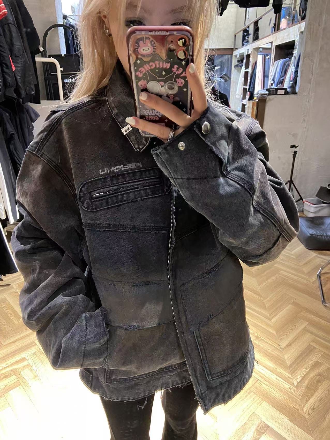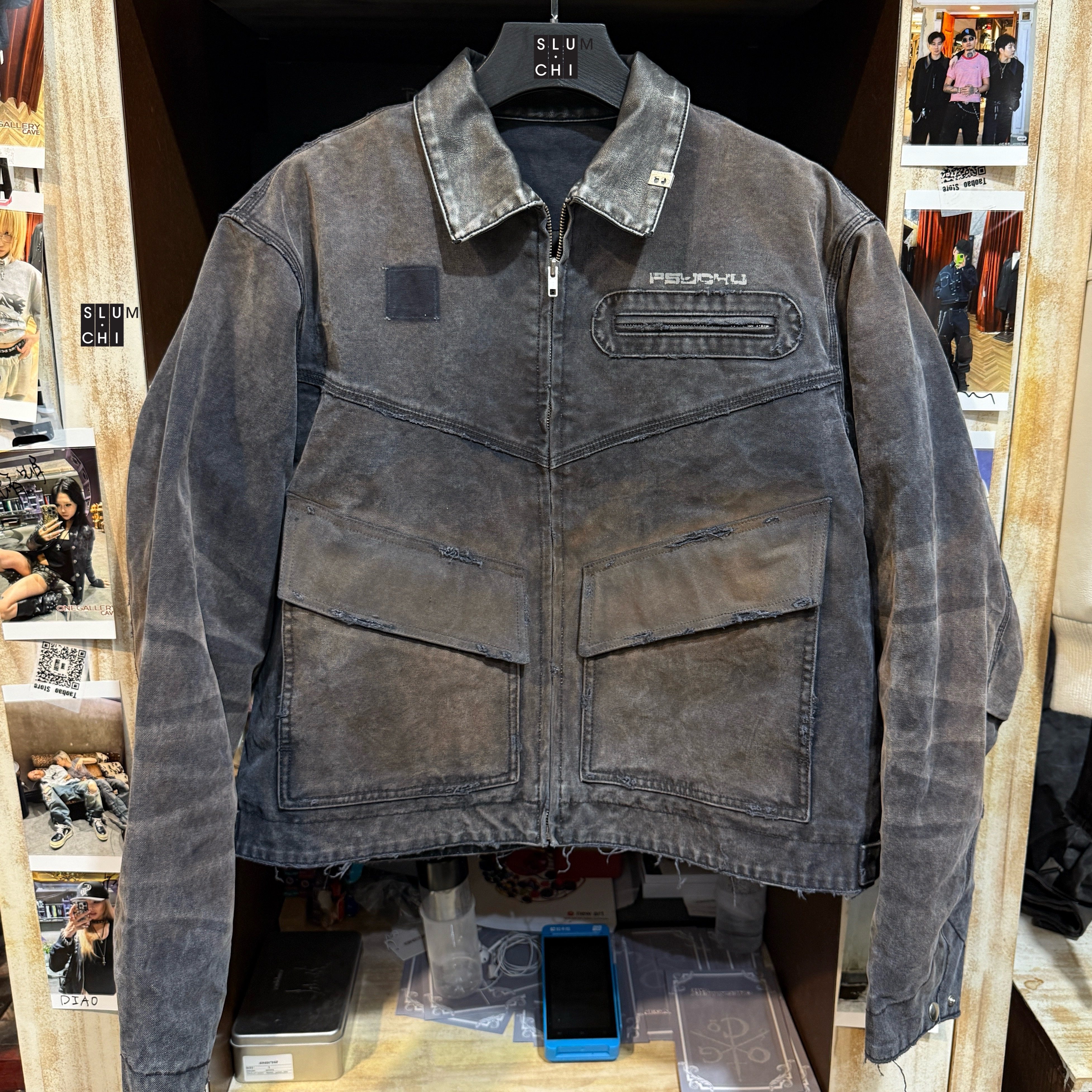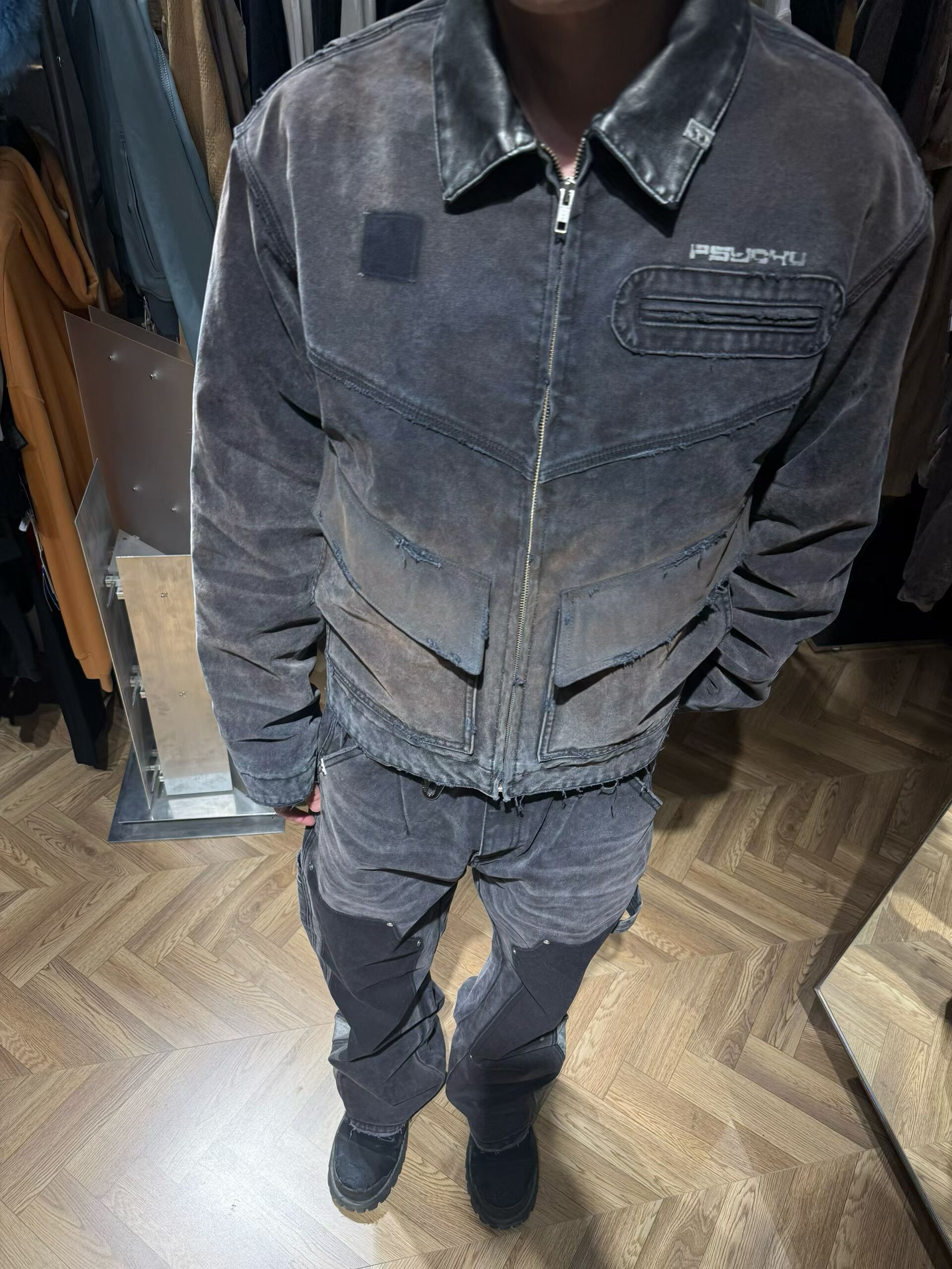 【Slum】Panq Space Japanese Washed Leather Patchwork Faded Distressed Detroit Jacket Casual Pants Set