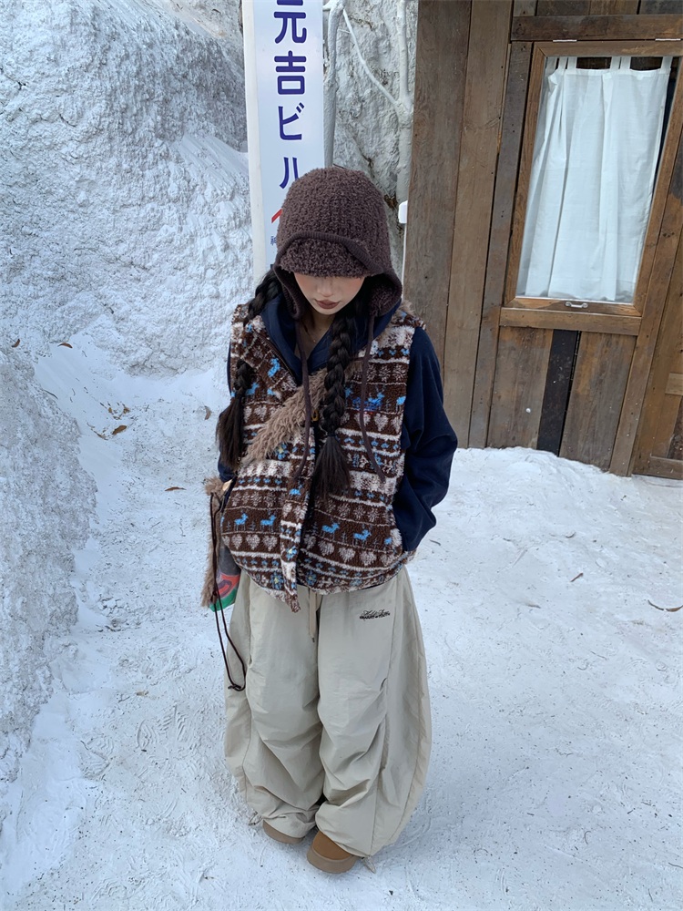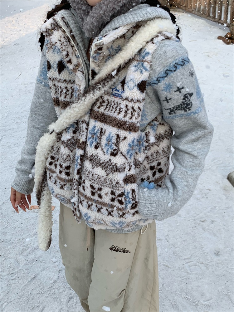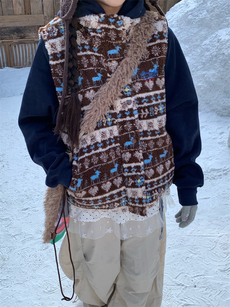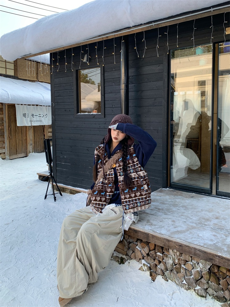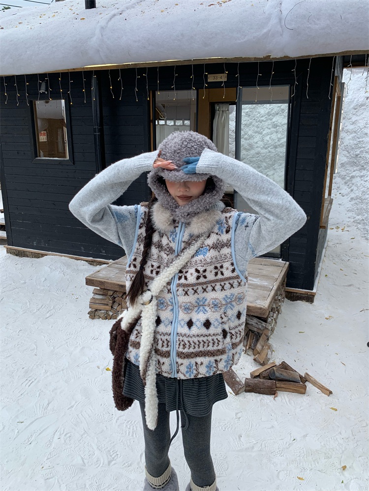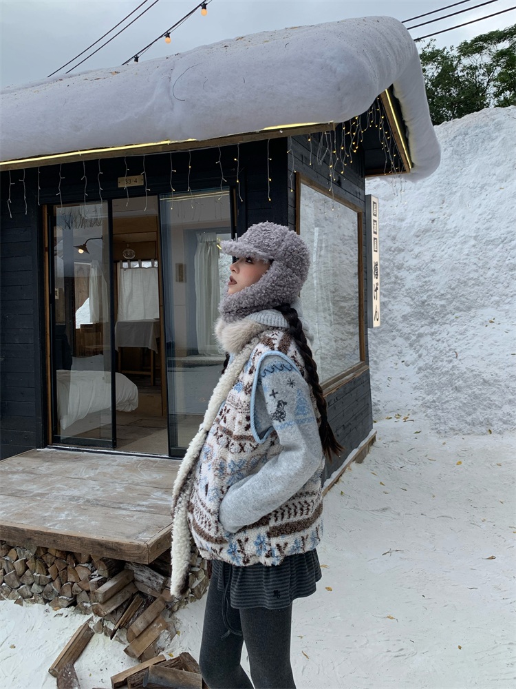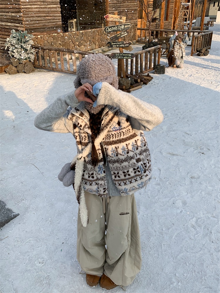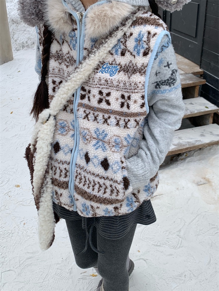 195 Daixi Fair Isle Lamb Wool Vest for Women, Autumn and Winter Layered Wear, Versatile, Loose, Casual Stand Collar Cotton Jacket, Trendy