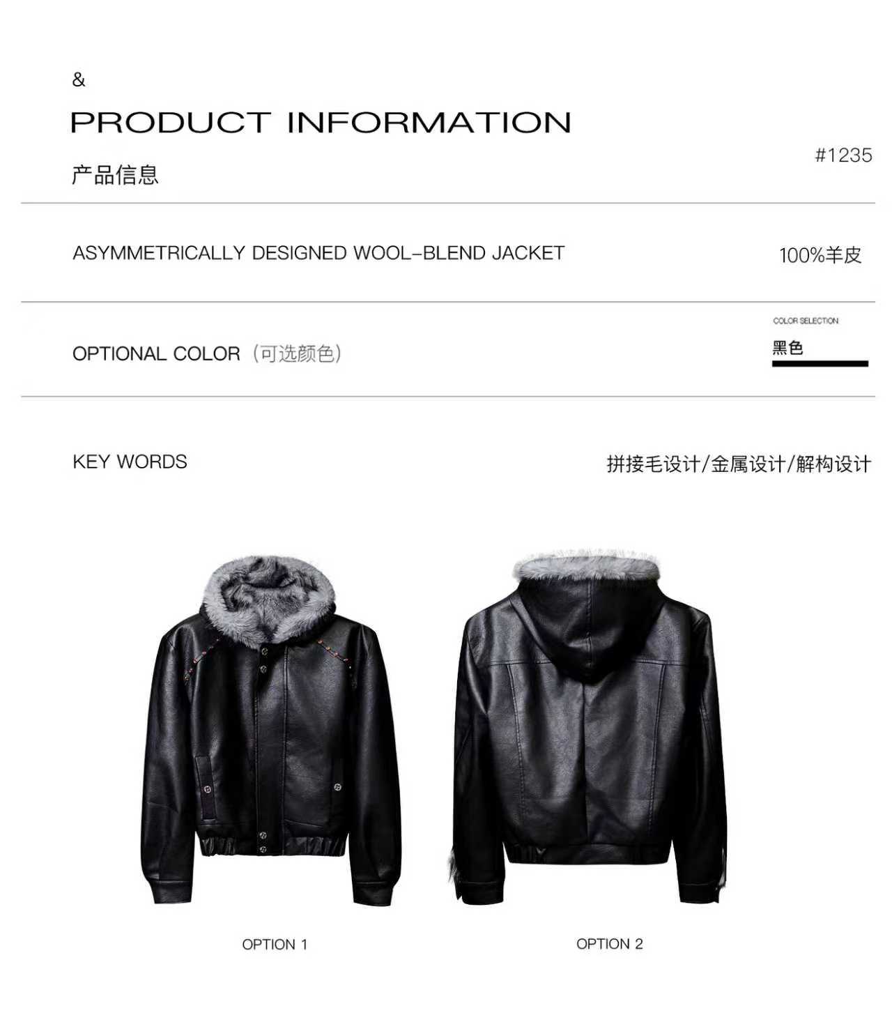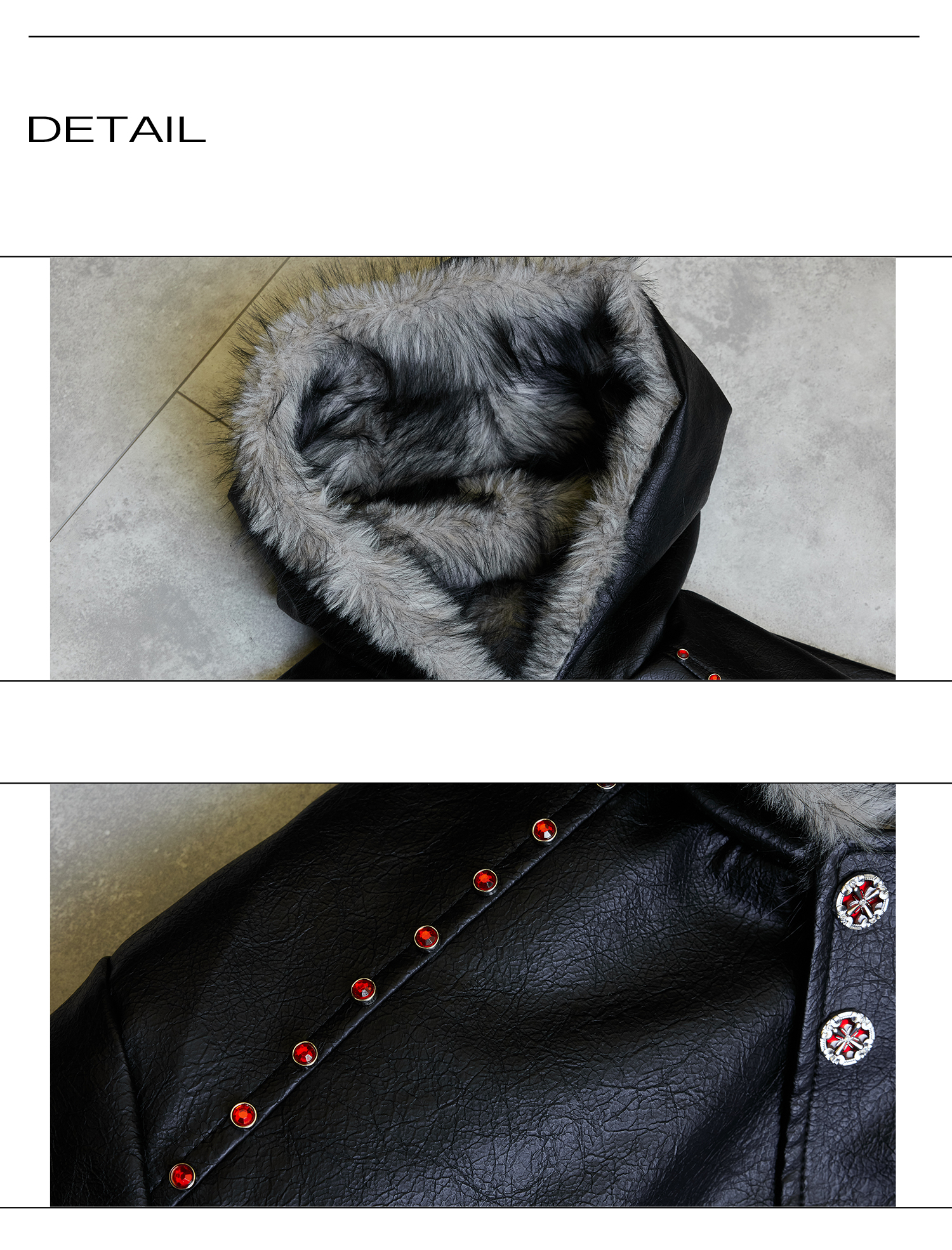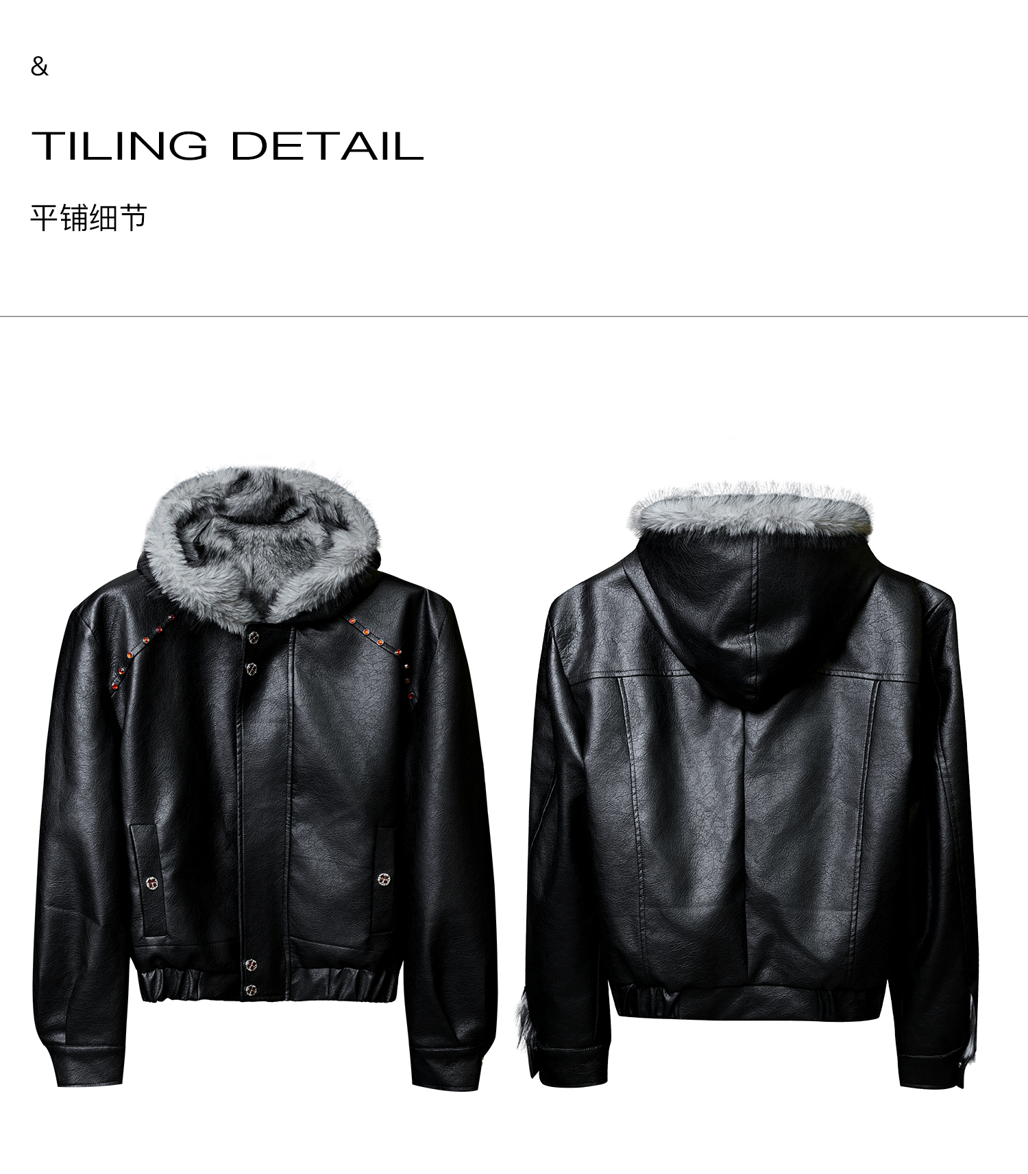 Argue Culture Heavy-Duty Mountain Carving Fleece-Lined Thick Leather Jacket with Hood and Fur Collar, Short and Wide Coat