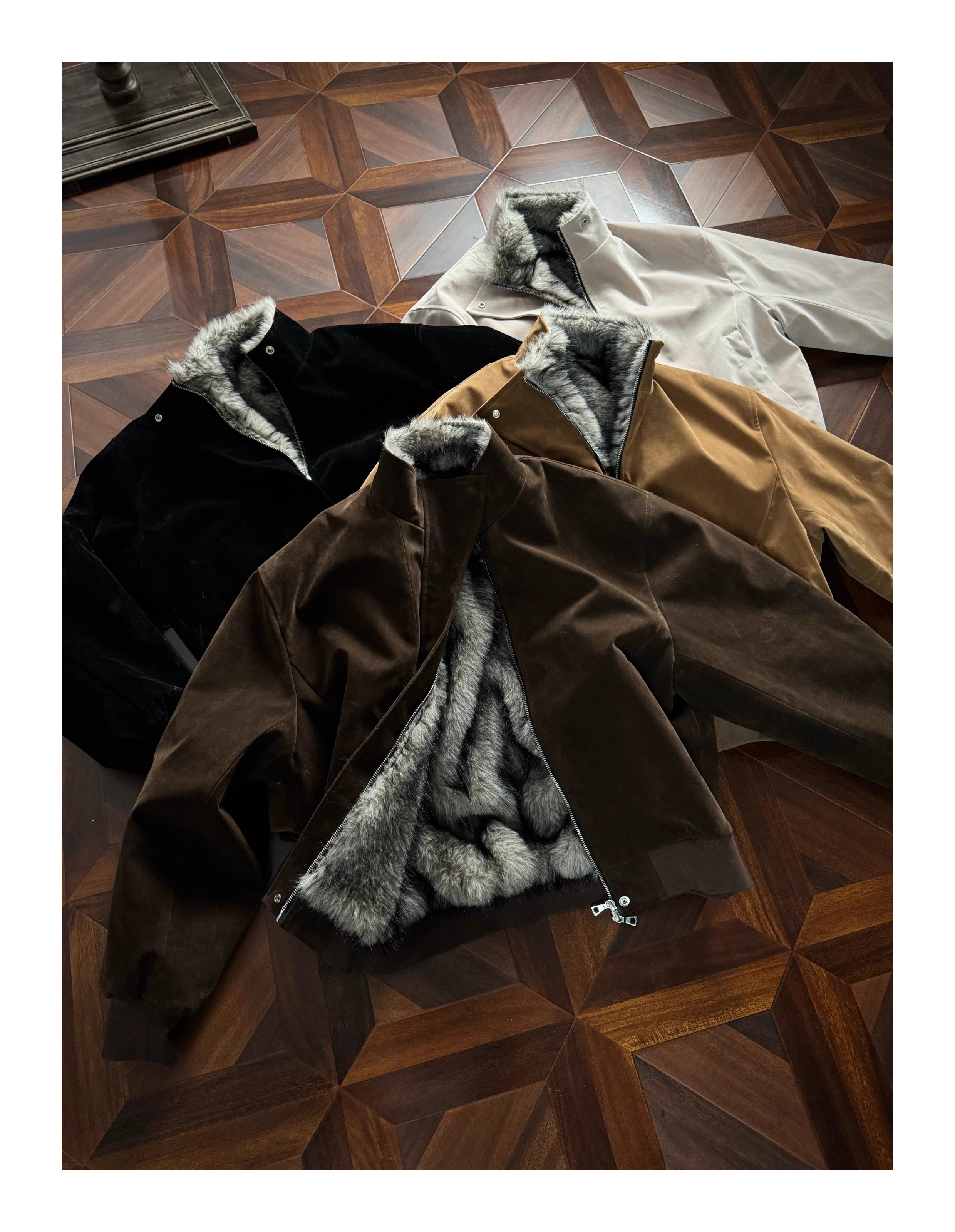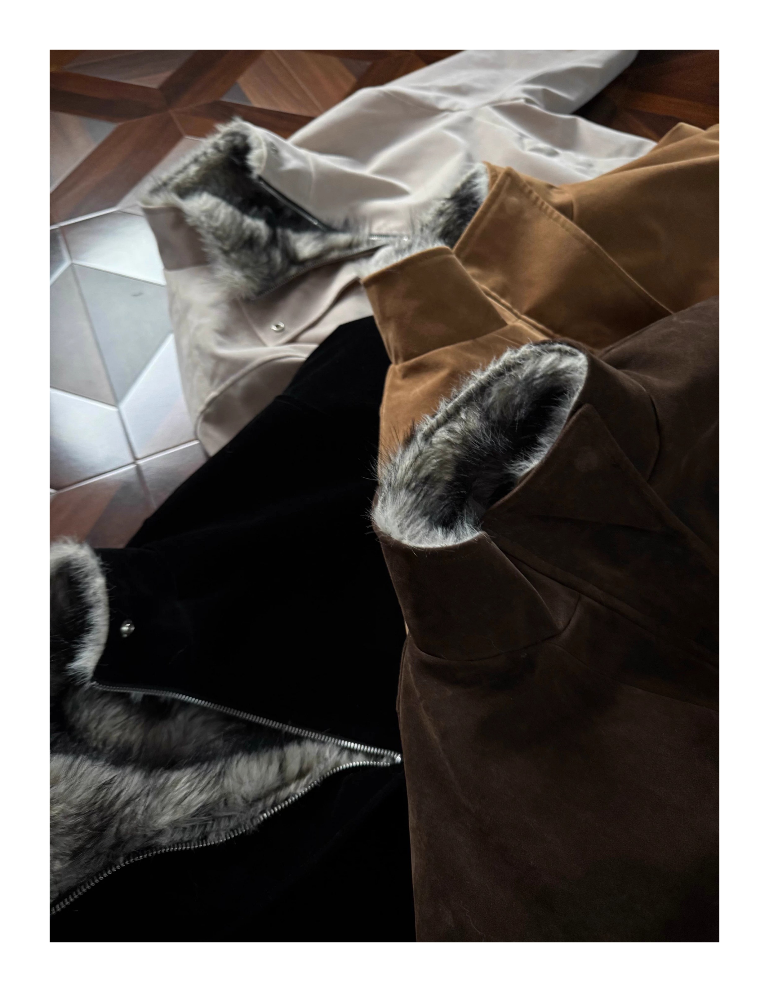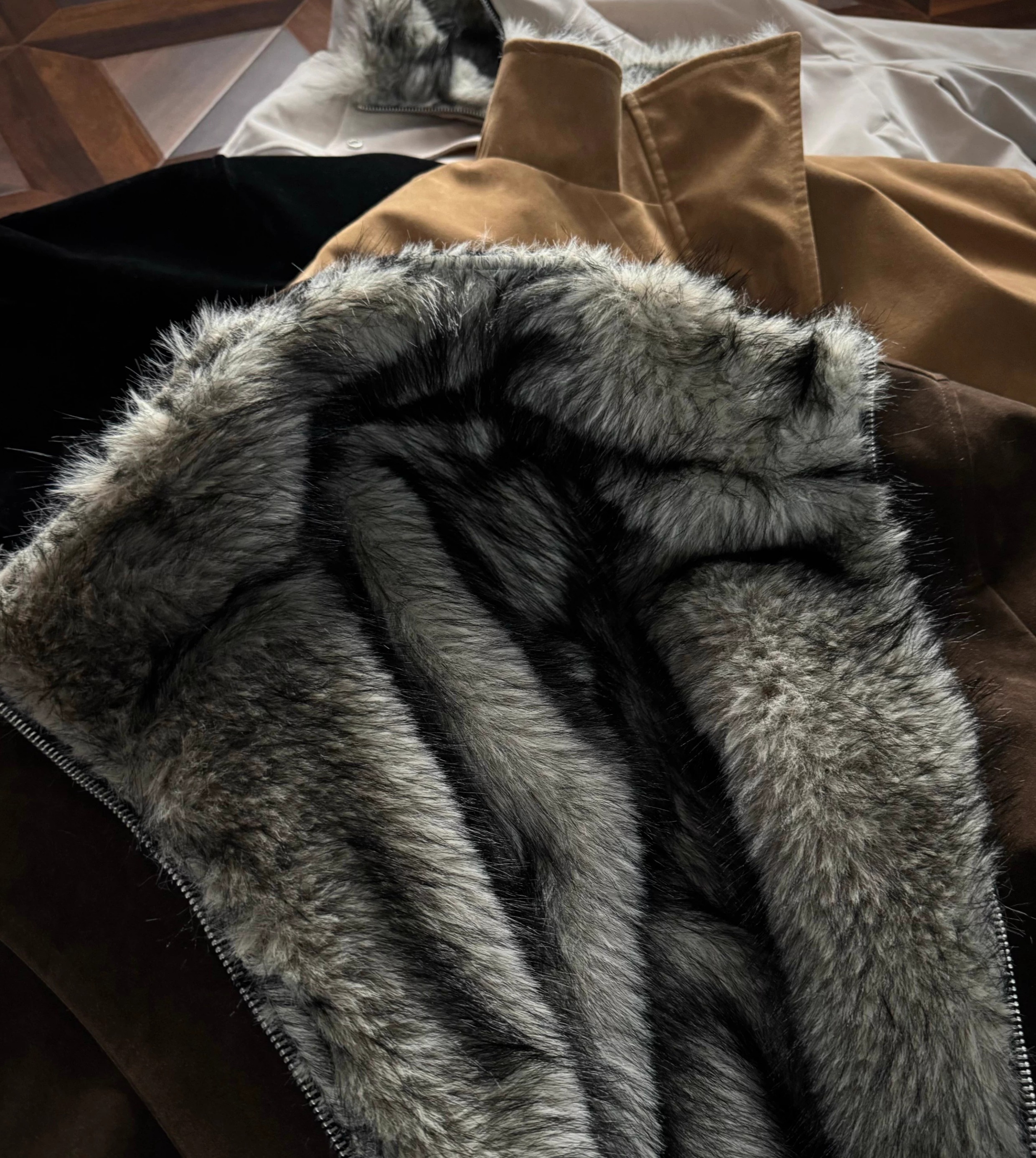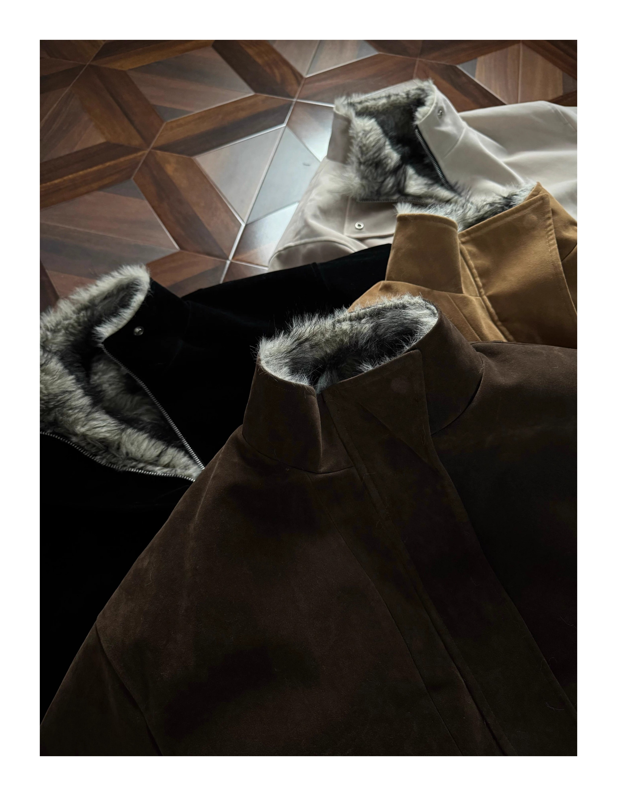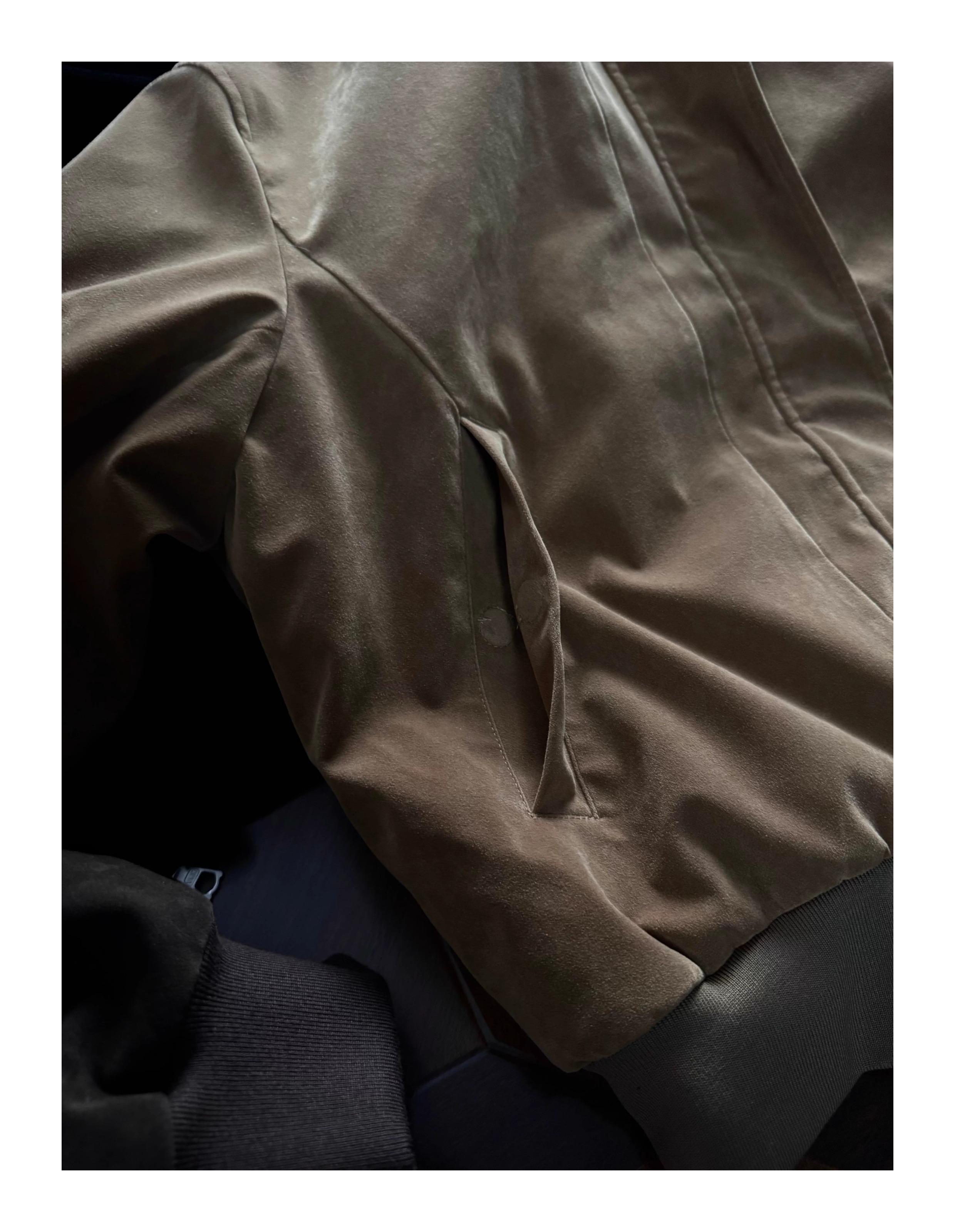 Oclin Hunting-Style Wolf King Jacket, Suede Leather, Mountain Eagle Design, Regular Shoulder, Slightly Oversized Silhouette, Diagonal Placket, Stand Collar, Unique Carved Design