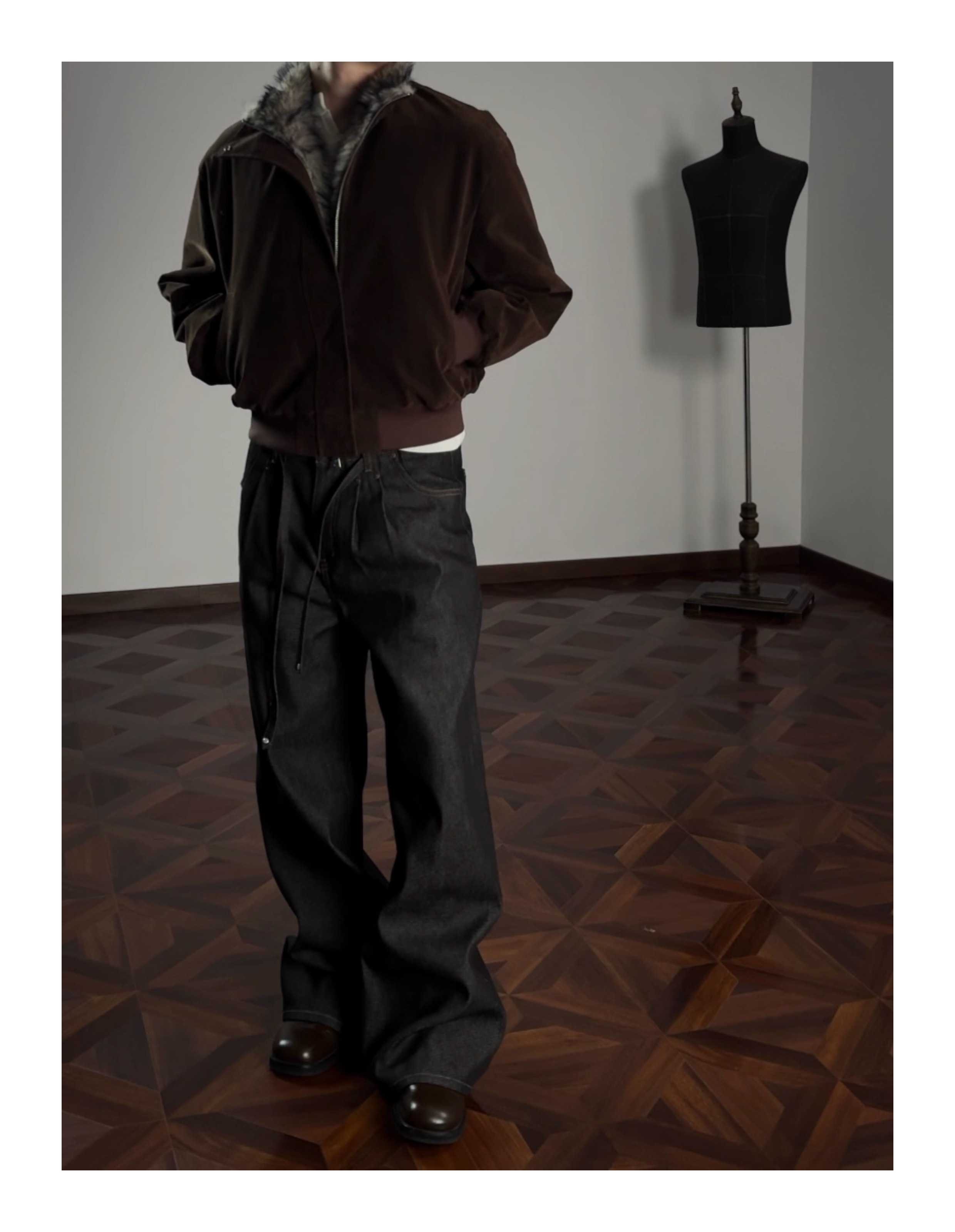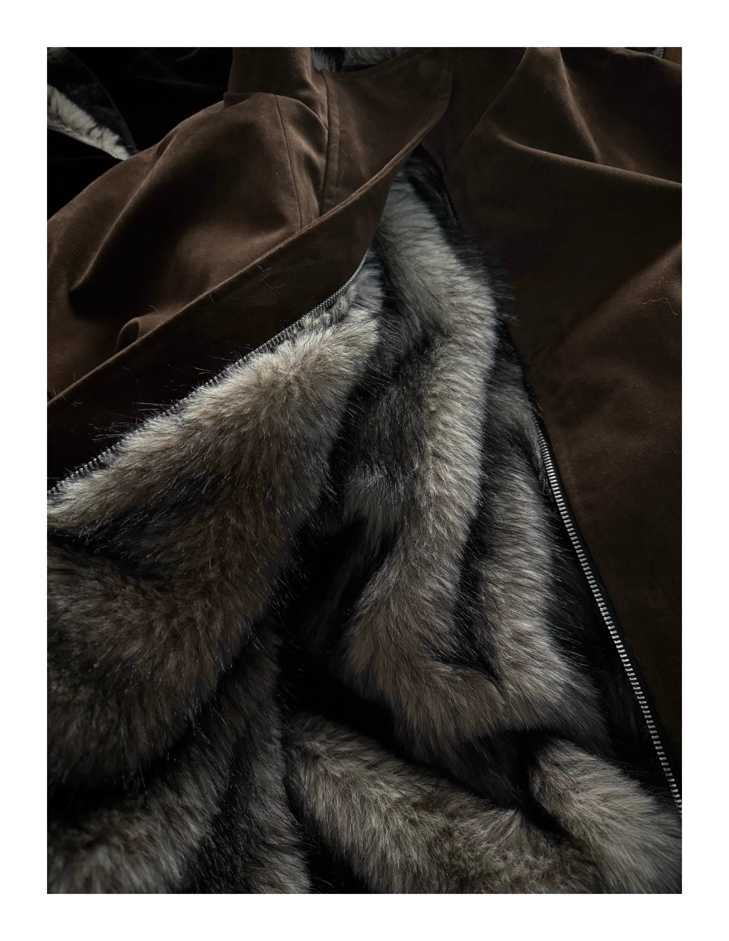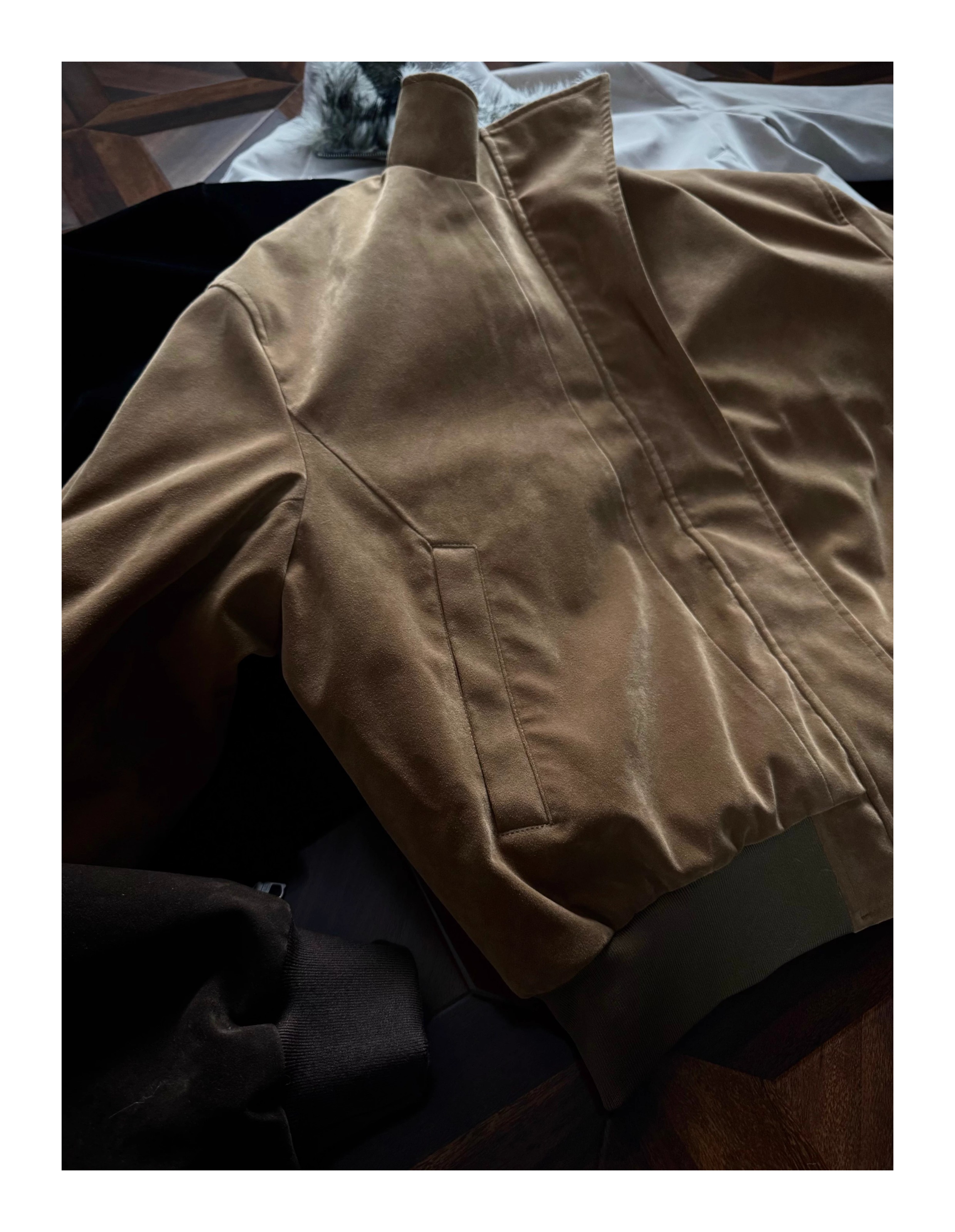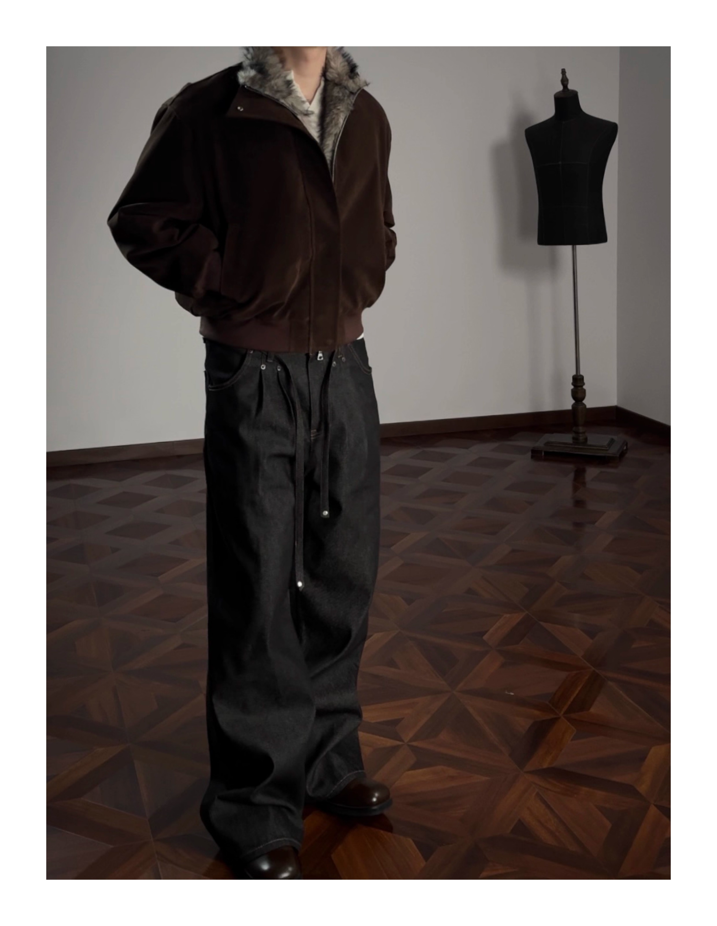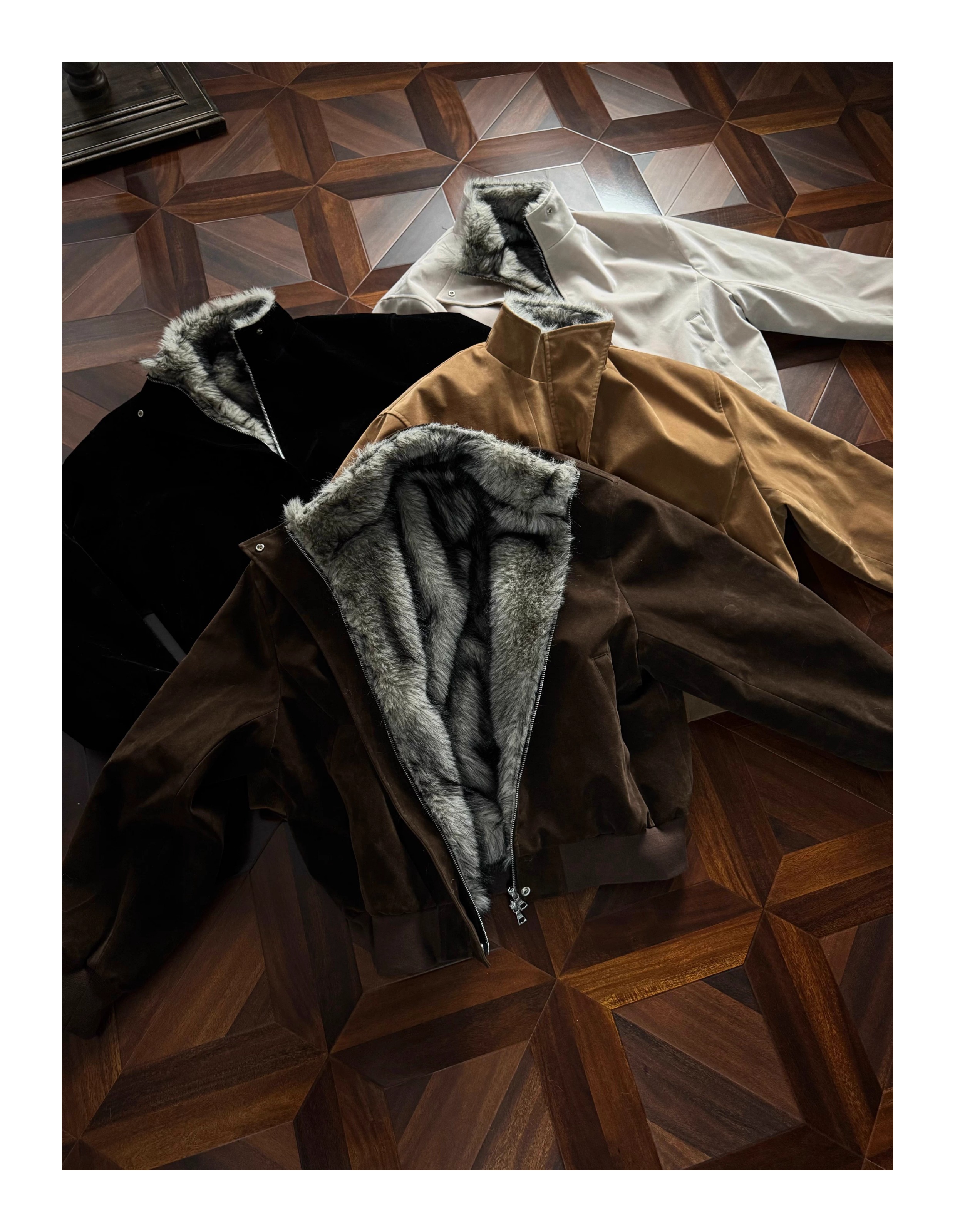 Oclin Hunting-Style Wolf King Jacket, Suede Leather, Mountain Eagle Design, Regular Shoulder, Slightly Oversized Silhouette, Diagonal Placket, Stand Collar, Unique Carved Design