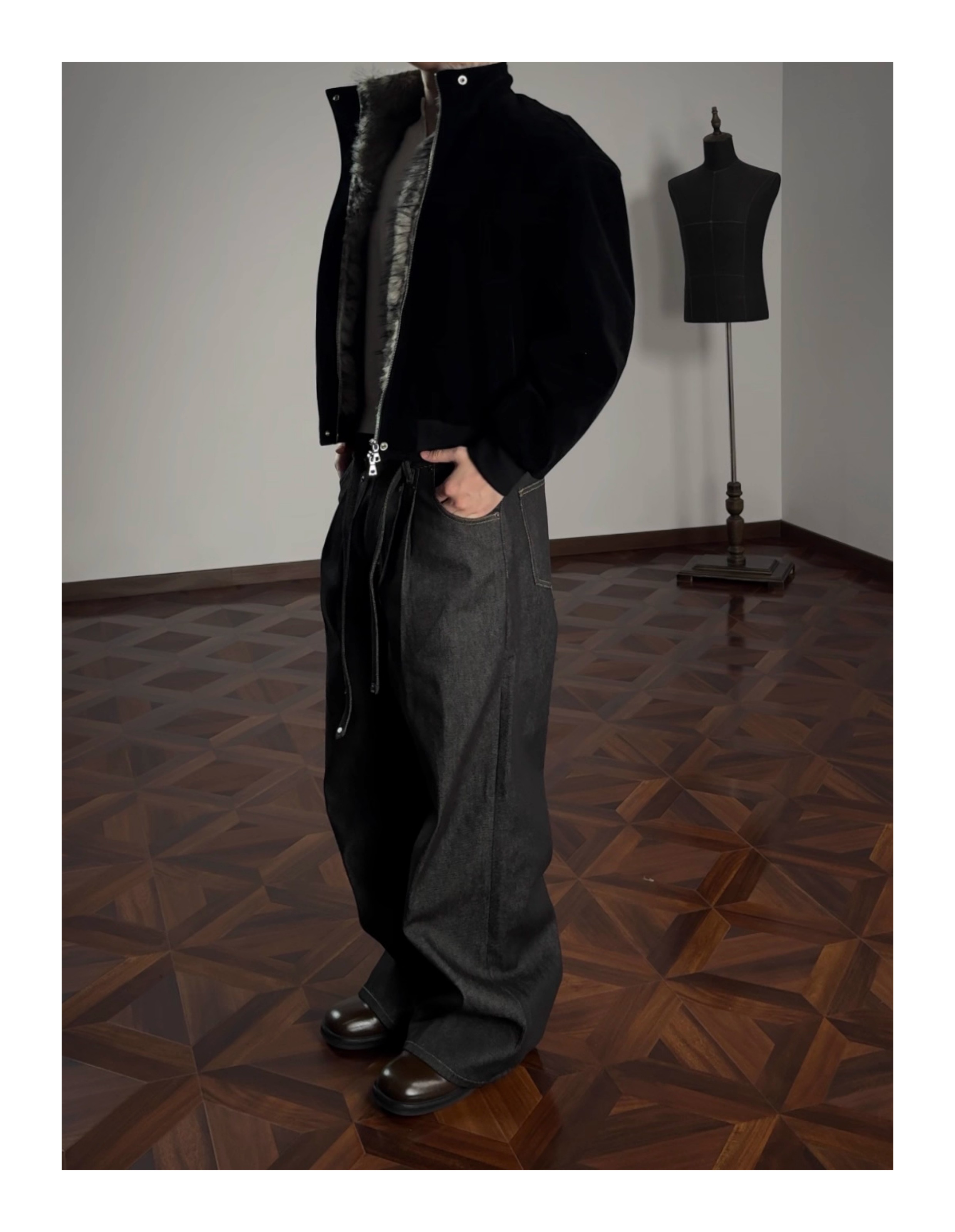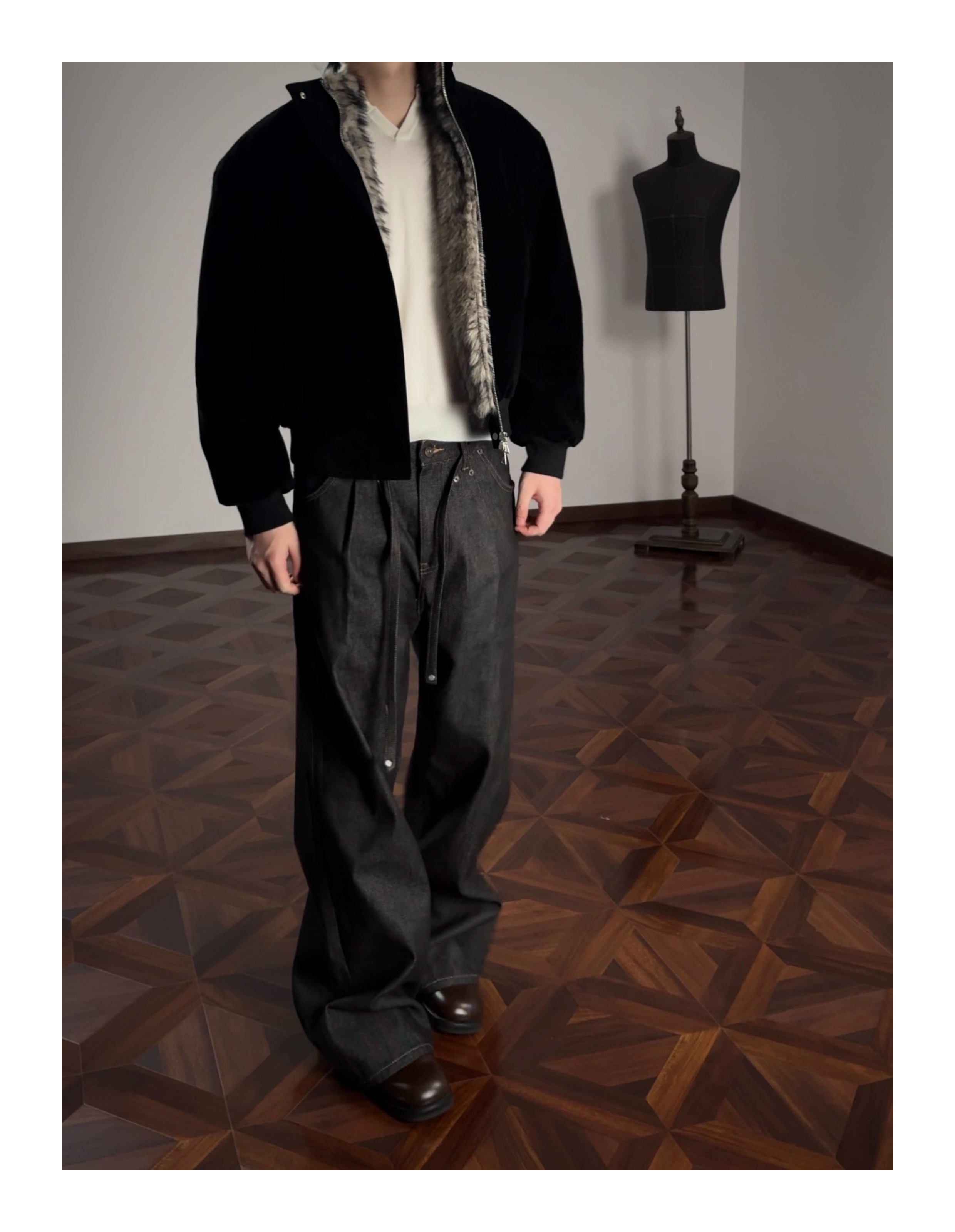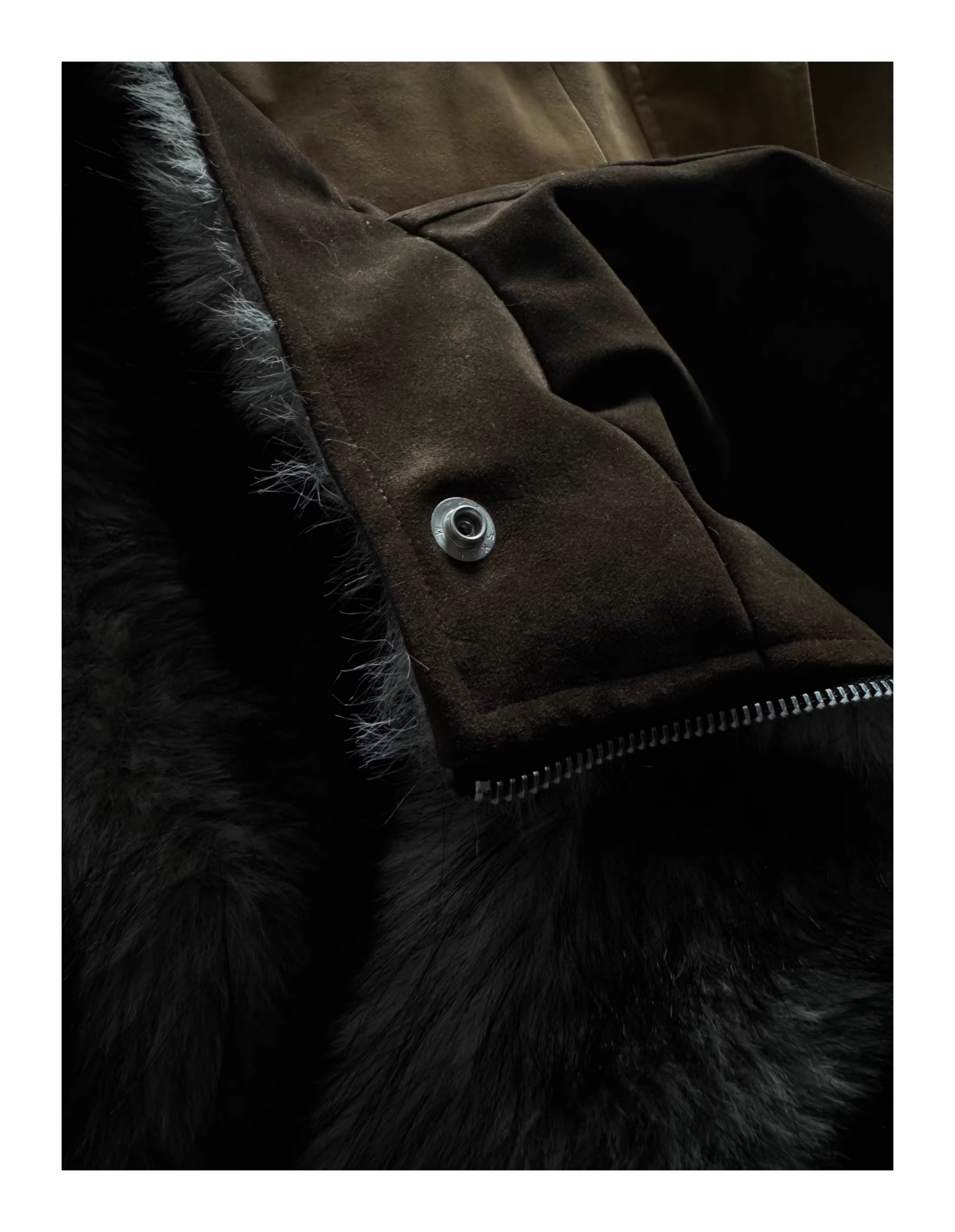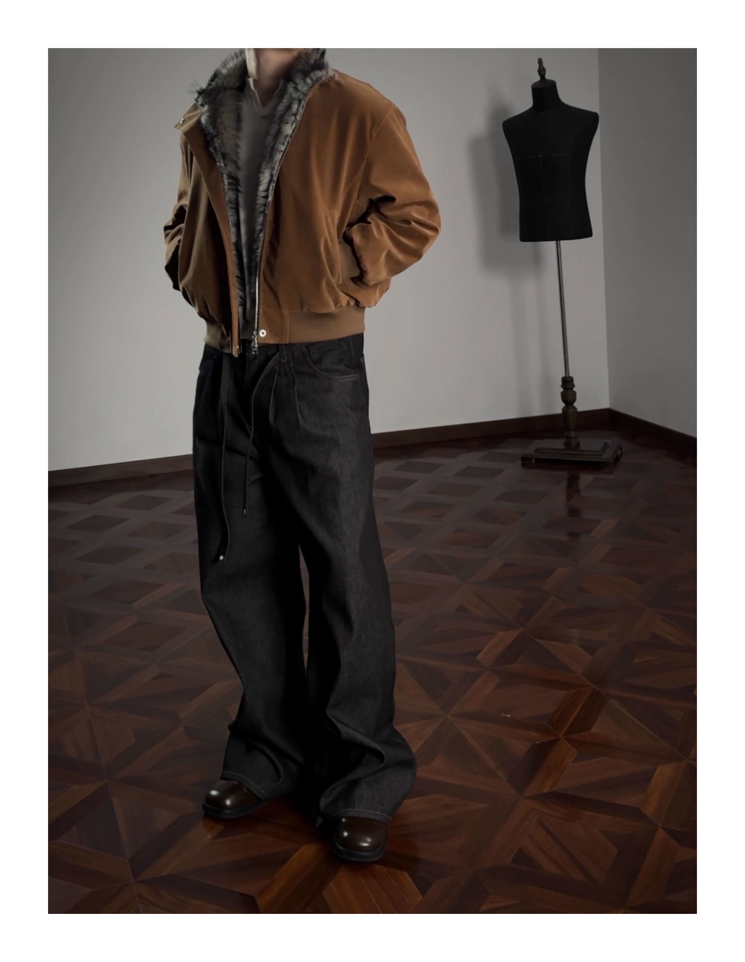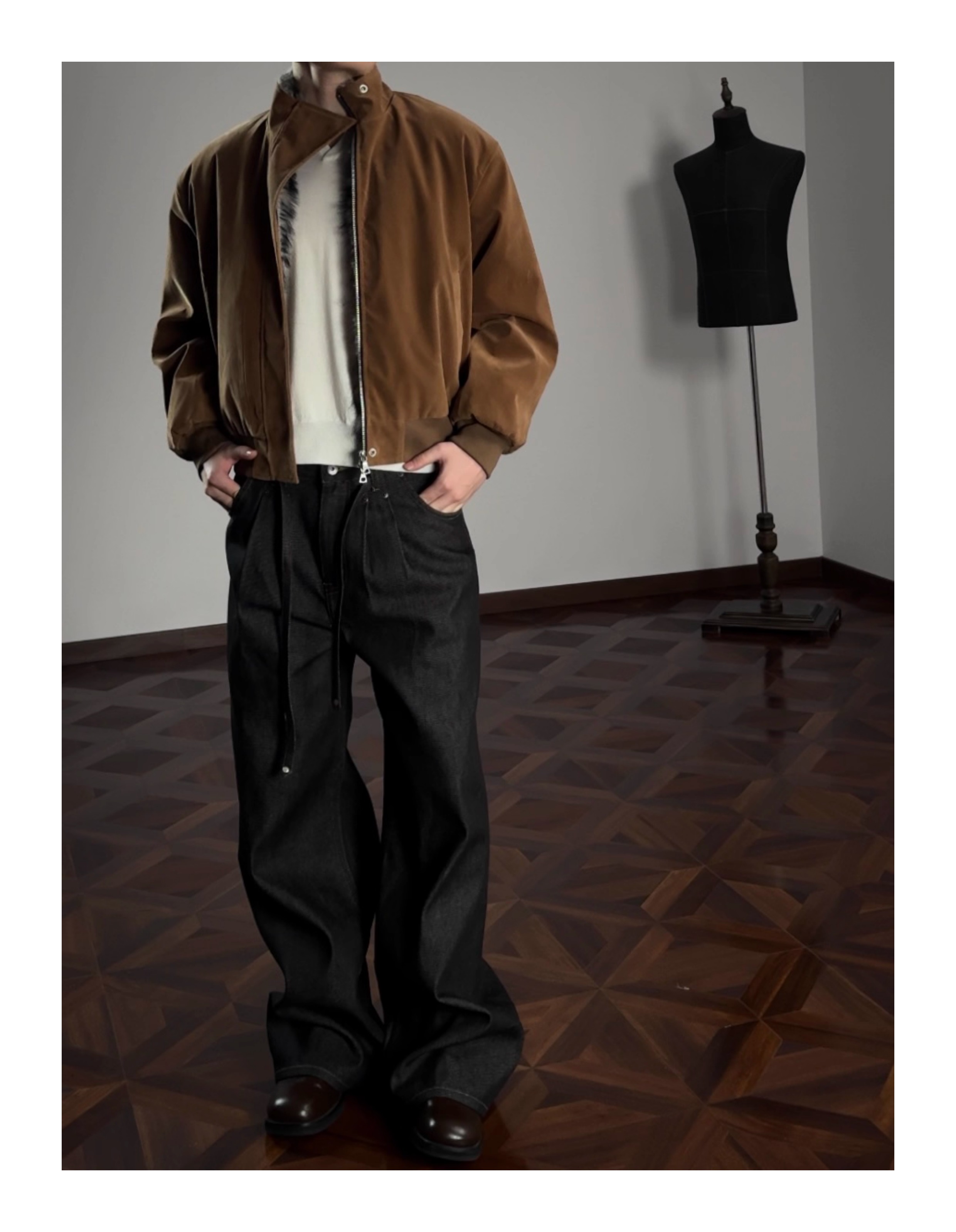 Oclin Hunting-Style Wolf King Jacket, Suede Leather, Mountain Eagle Design, Regular Shoulder, Slightly Oversized Silhouette, Diagonal Placket, Stand Collar, Unique Carved Design