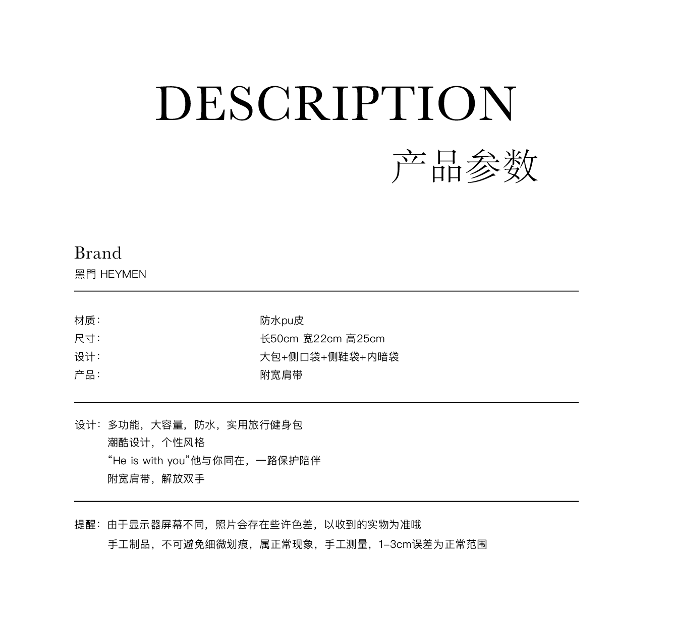 Heymen Is with You, Original Design Large-Capacity Fitness Shoulder Bag, Business Trip Short-Distance Travel Bag
