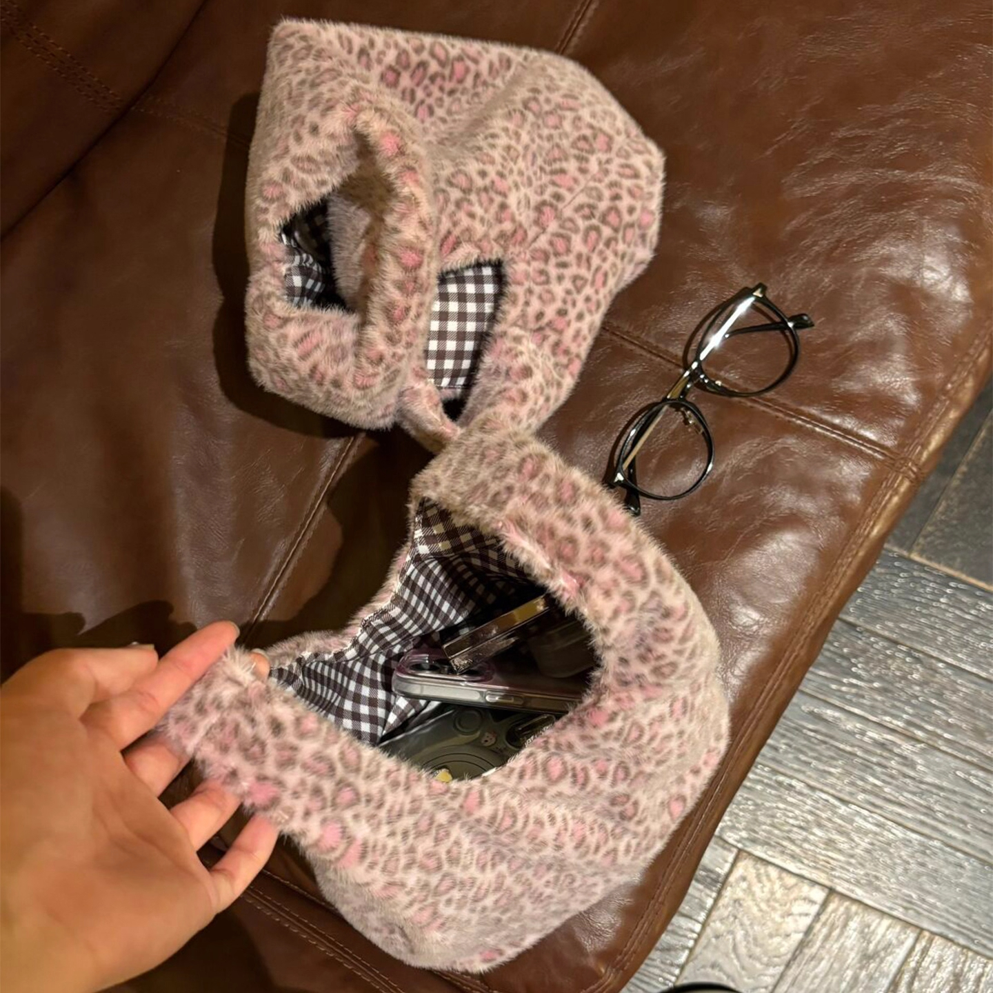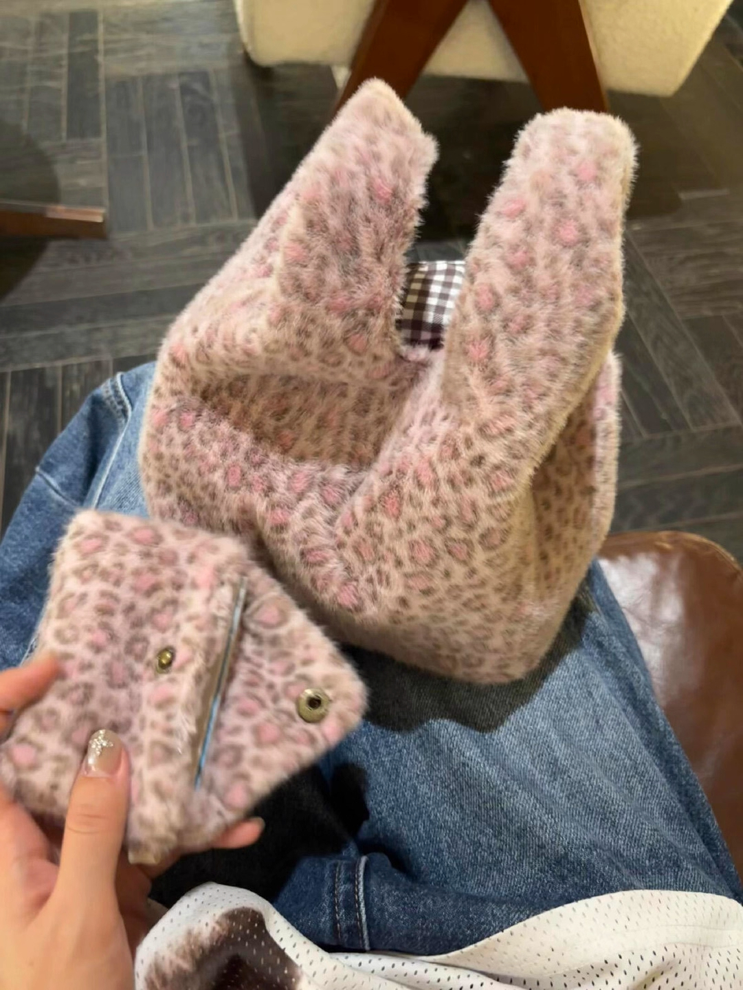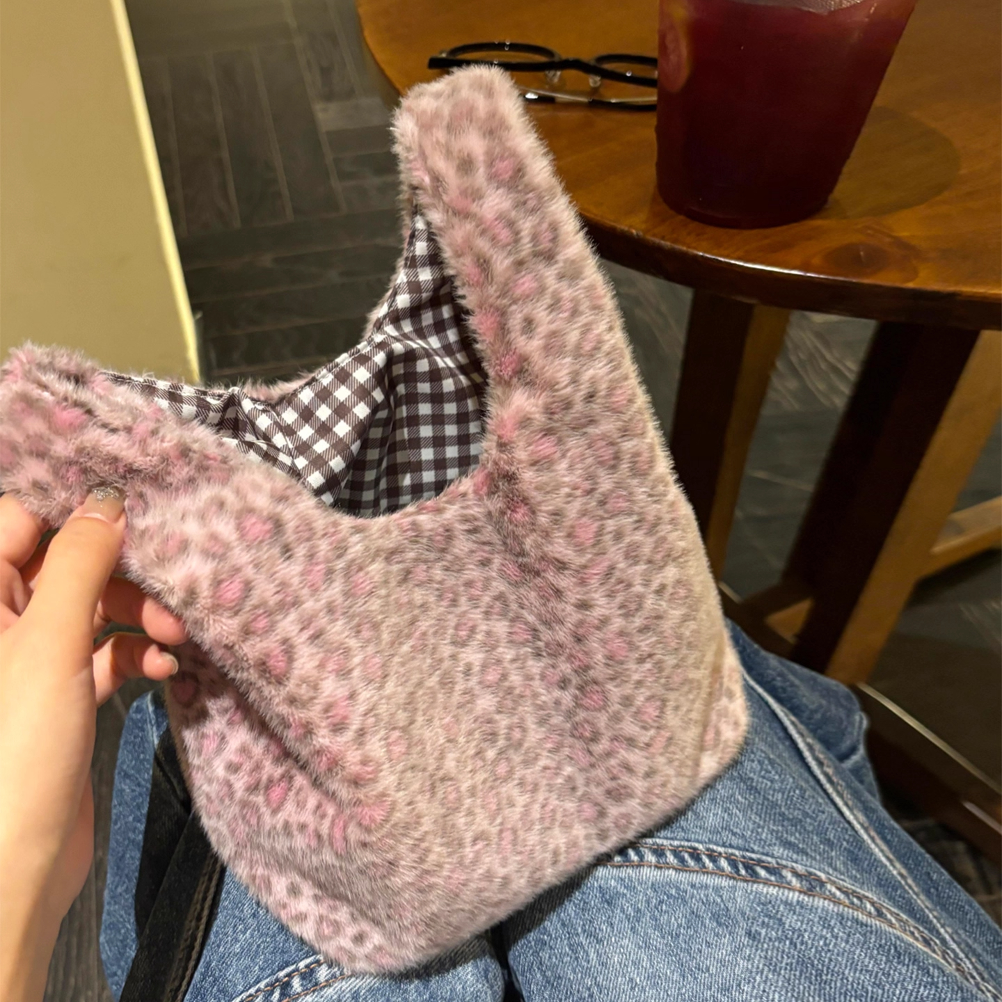 Autumn and Winter New Plush Purple Leopard Print Handbag, Commuter Casual Wrist Bag, Work Miscellaneous Items, Small Handbag for Going Out