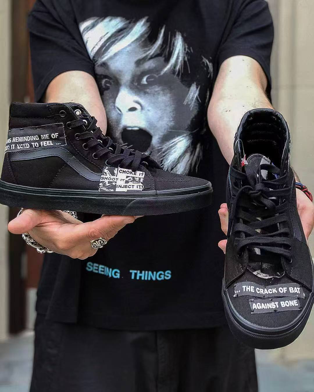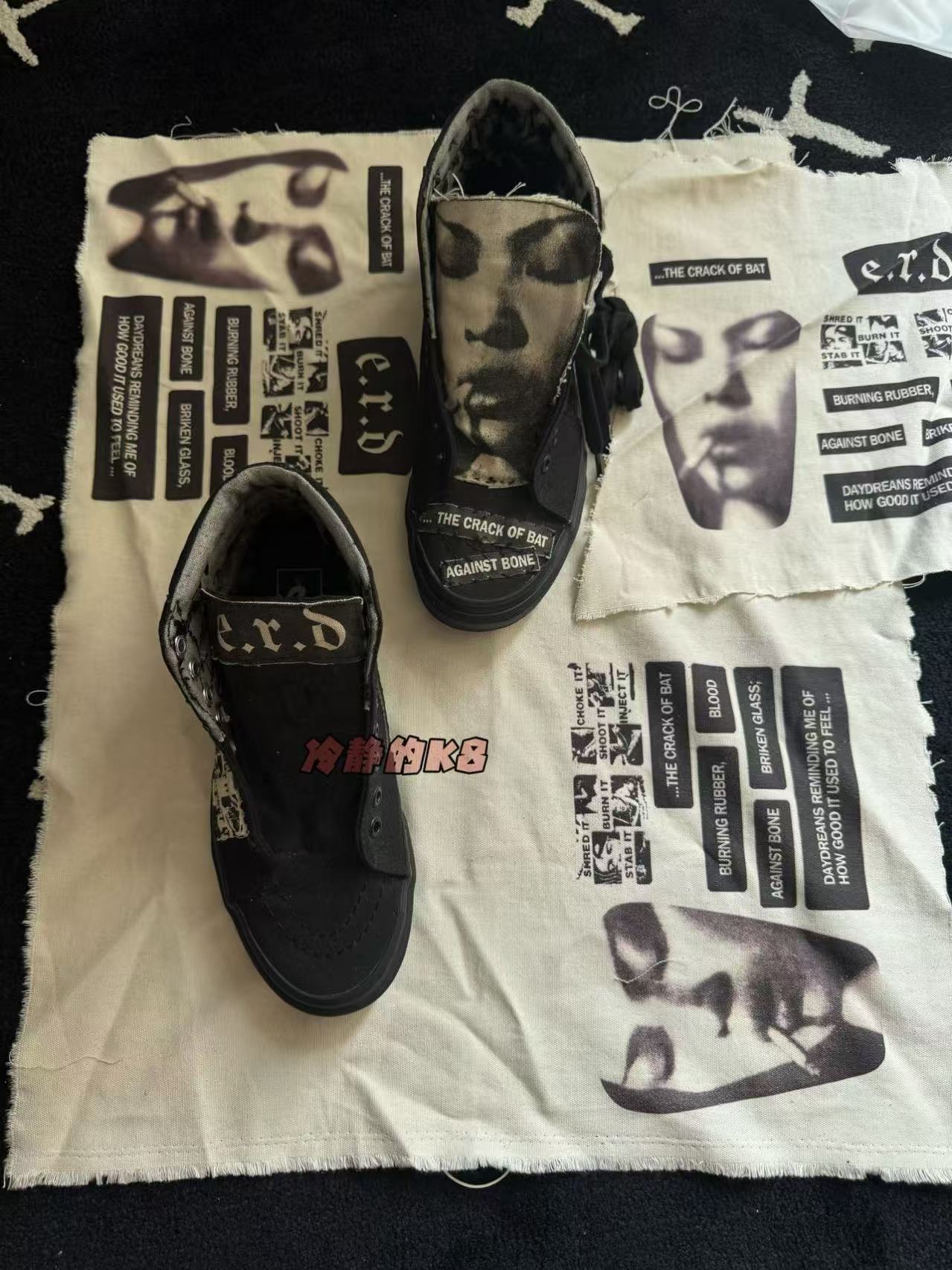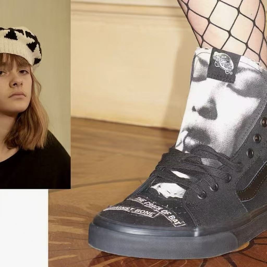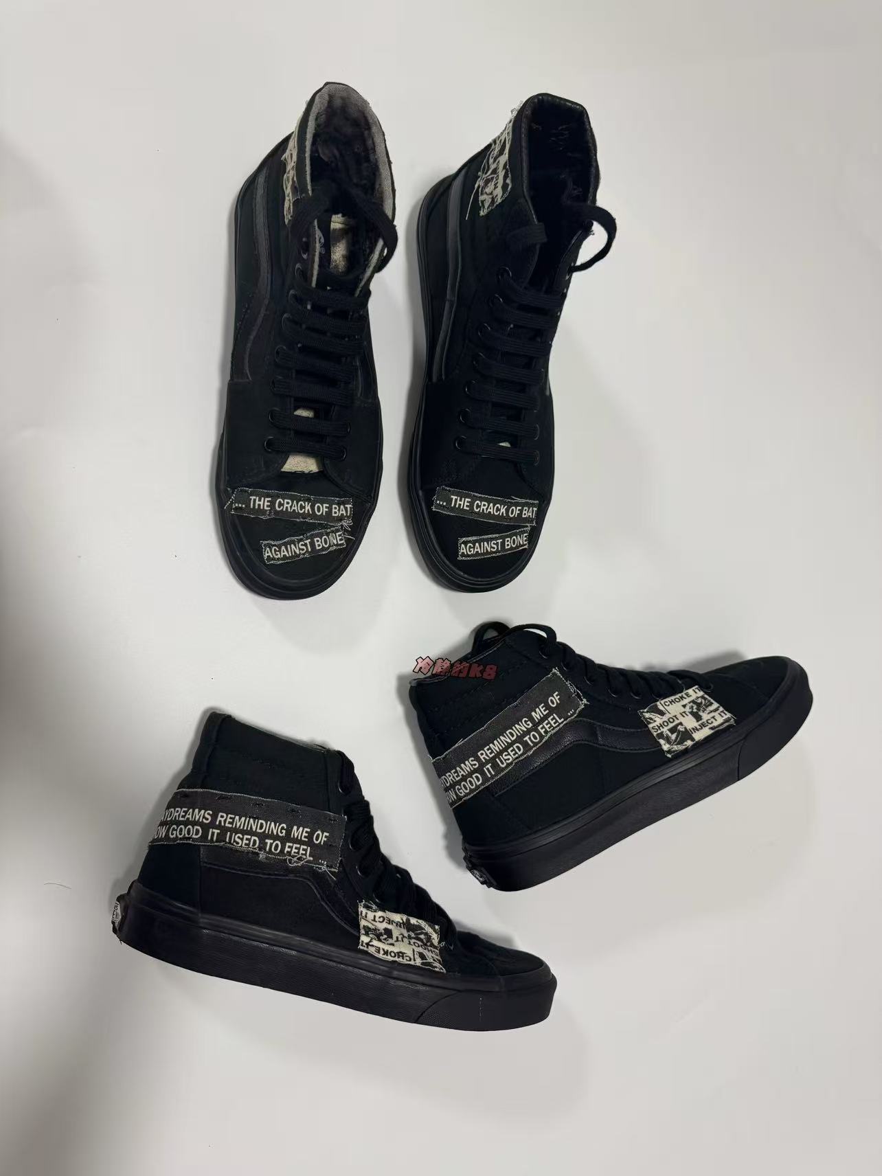 采用早期标志性厌世烟女和梵文logo标语贴布于鞋舌鞋身